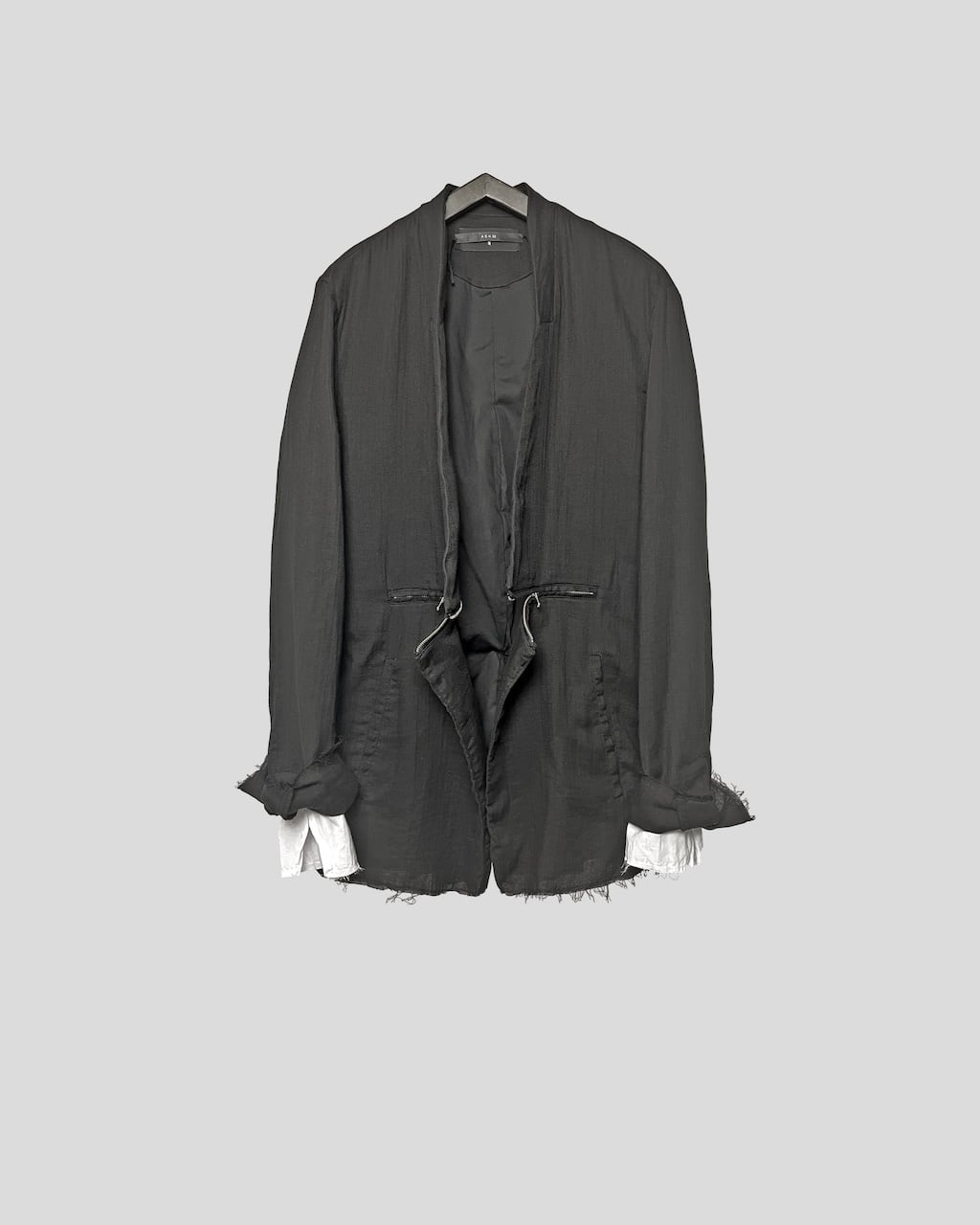 袖はレイヤー仕様になっており、裏地を白にすることで視覚的にもラフなスタイリングが可能となる。脇のコードは内側にあるボタンによって取り外し可能。