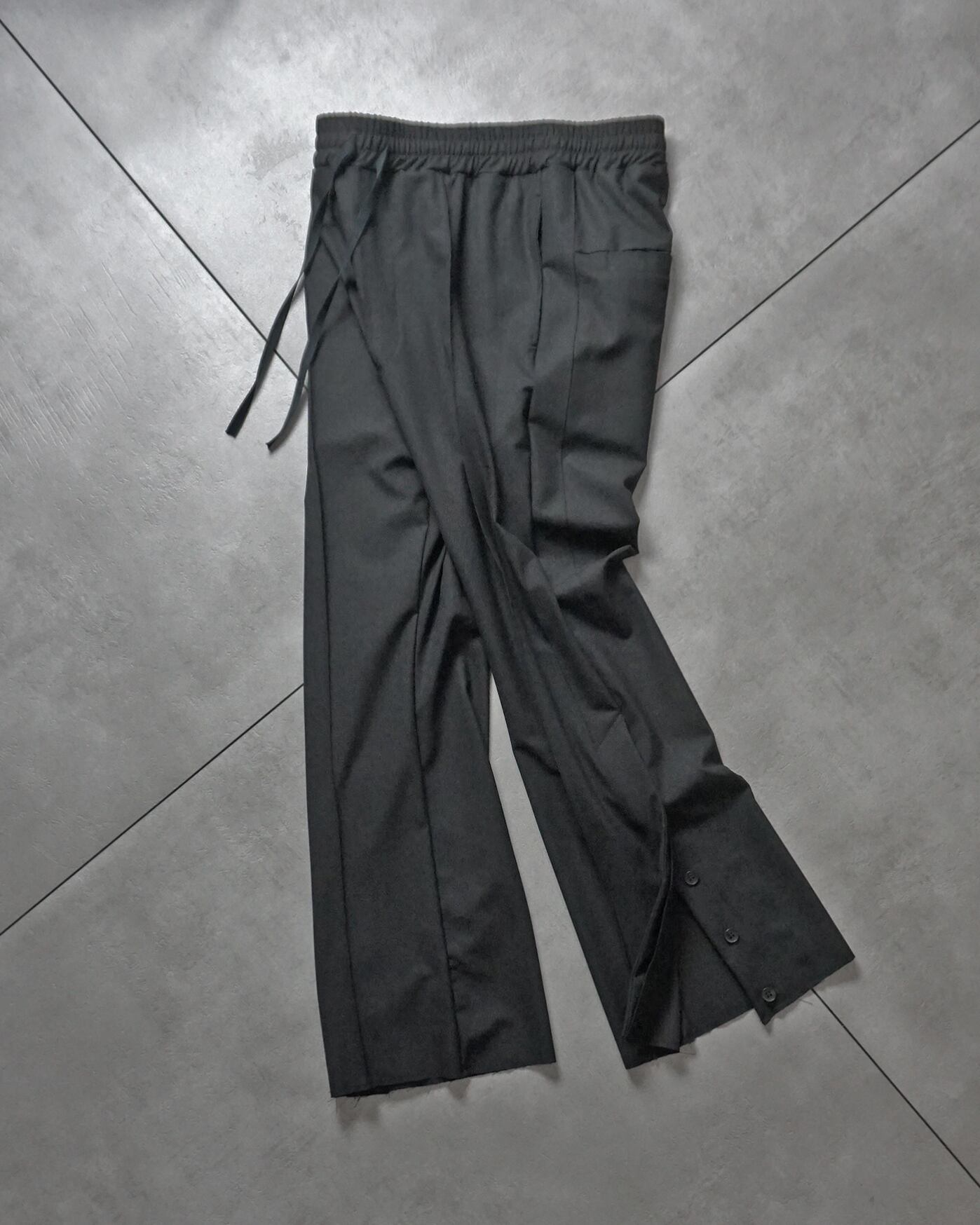 A pair of highly versatile slacks with a moderately gentle flare silhouette. Updated with a new material for midsummer. Buttons at the hem allow you to adjust the volume at the feet. Pin tucks and lines on the sides create a three-dimensional effect, creating a beautiful silhouette that makes the legs look longer. Gathers are placed on the back of the waist and there is a drawstring at the front, making them easy to wear despite their appearance. Flared pants that can be worn with anything from elegant styling to casual street wear.