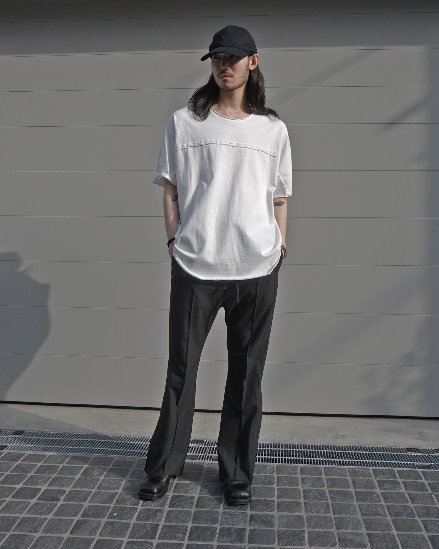 程よい緩やかさが特徴のフレアシルエットで汎用性が高いスラックス。真夏向けに素材を変更しアップデート。裾にはボタンが仕込んであり、足元でボリューム調整が可能。ピンタックや側面のラインまで作り込み、脚長の綺麗なシルエットを演出する。ウエストの背面にはギャザーを設け、フロントにはドローコードも設置してあり、見た目に反し気軽な着用が可能となる。上品なスタイリングからカジュアルなストリートまで対応可能となるフレアパンツの決定版。