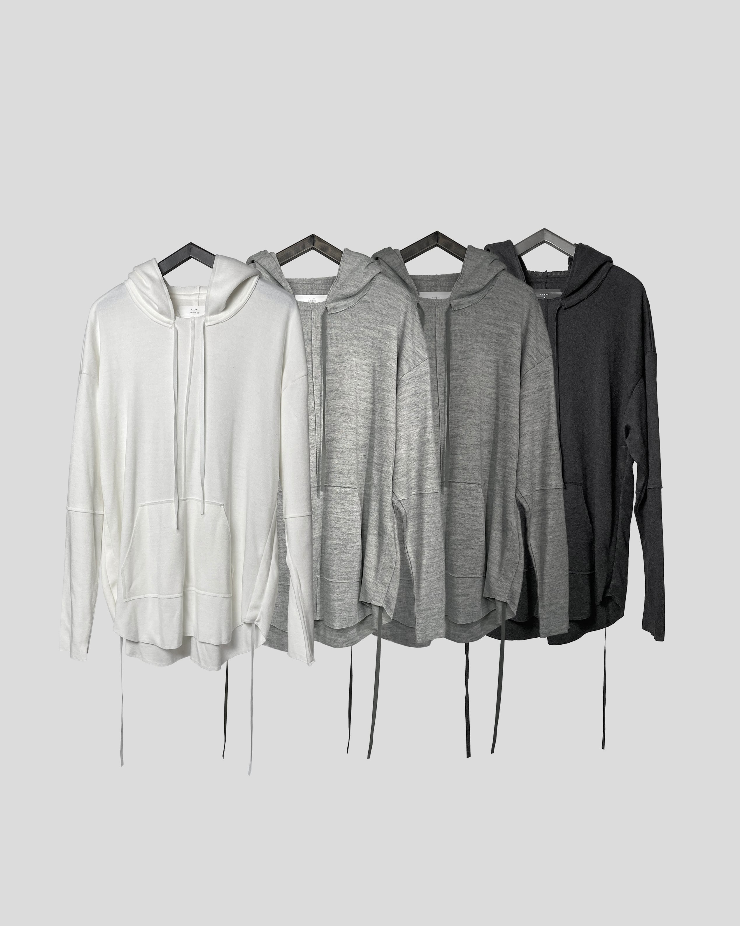 A pullover-style hoodie distinguished by a design that adds and docks a hood onto a crew-neck base.This marks ASKYY’s first hoodie crafted from a knit fabric, achieving an elegant style that also suits formal contexts.
