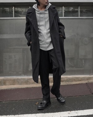 脇線に設けているドローコードが垂れることでアクセントになり、絞ることで着丈の調整も可能。大きめのフード、ゆとりあるリラックスサイジング、パーカーというベーシックなアイテムだからこそ細部にこだわったパーカーが完成。