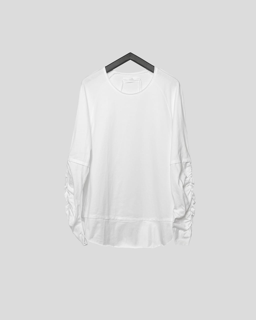 A relaxed, fake-layered long-sleeve T-shirt with a raglan sleeve design. The sleeves are equipped with elastic bands to create three-dimensional wrinkles and a voluminous drape. We present a new long-sleeve T-shirt that combines rugged military elements with a loose overall silhouette. The sleeves and hem feature a fake layered design, making it a single-layer construction that reduces bulk while still being stylish enough to stand on its own. This piece adds an accent to your fall and winter styling.