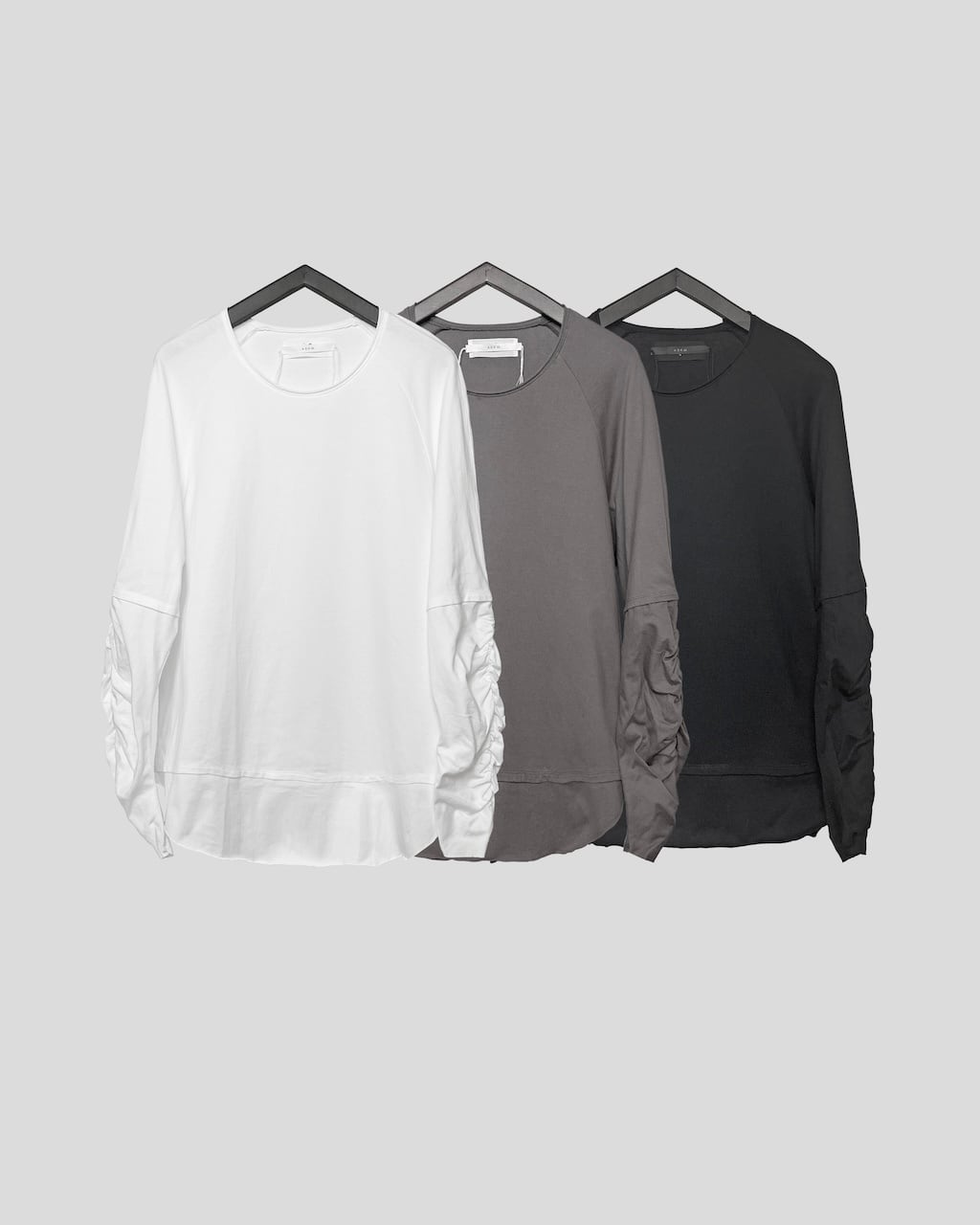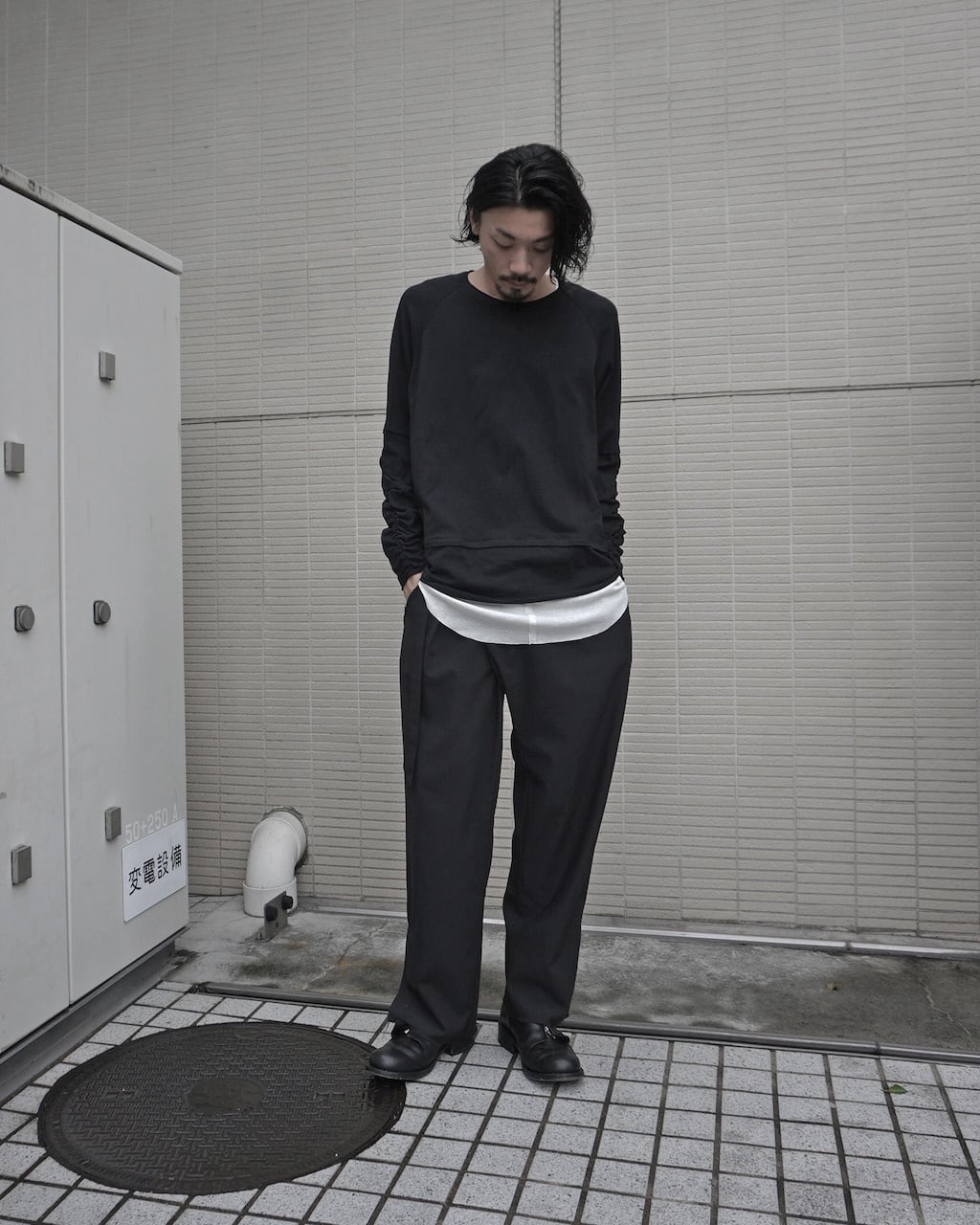 A relaxed, fake-layered long-sleeve T-shirt with a raglan sleeve design. The sleeves are equipped with elastic bands to create three-dimensional wrinkles and a voluminous drape. We present a new long-sleeve T-shirt that combines rugged military elements with a loose overall silhouette. The sleeves and hem feature a fake layered design, making it a single-layer construction that reduces bulk while still being stylish enough to stand on its own. This piece adds an accent to your fall and winter styling.