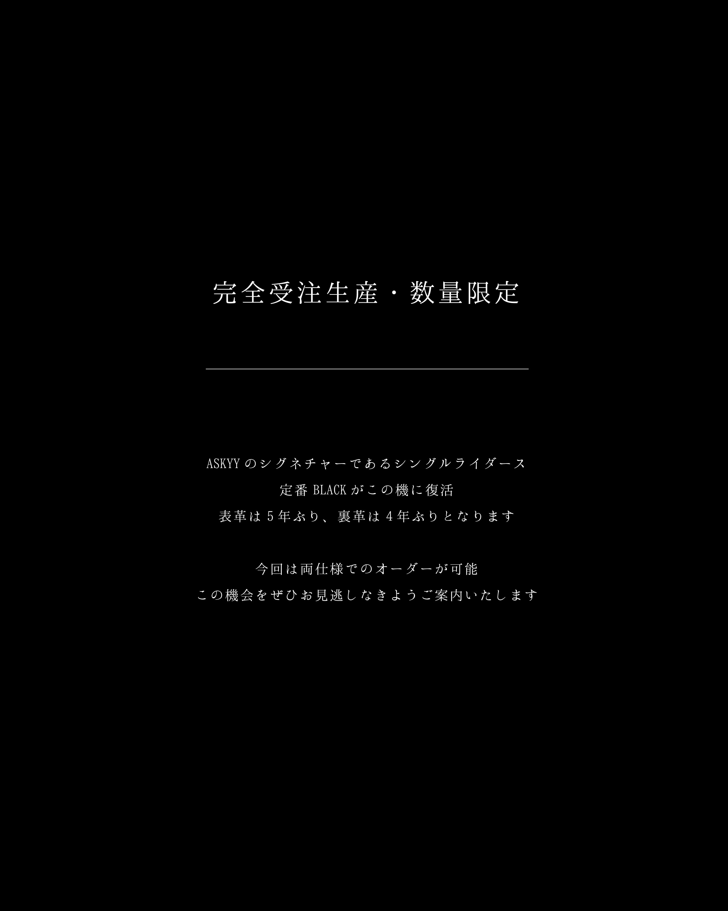 ASKYY設立当初からのシグネチャーモデル、SINGLE LEATHER(REMOVABLE RIDER)が復活。
