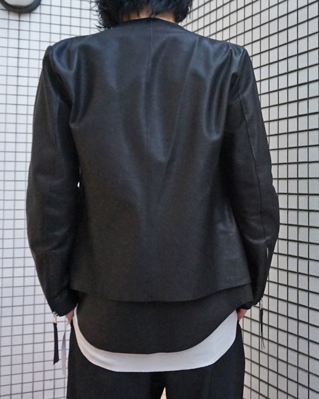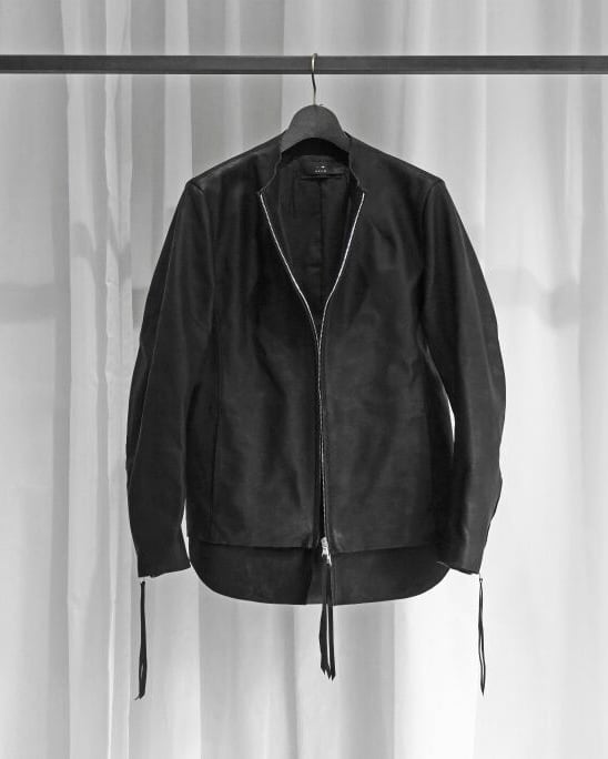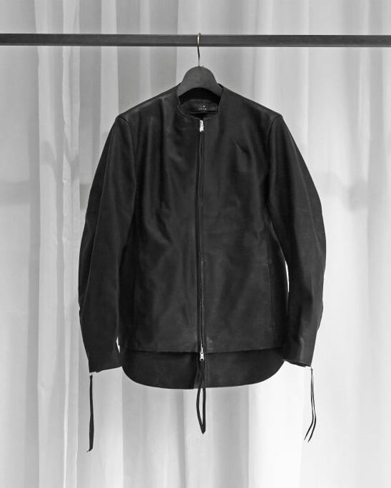 王道であるブラックに関しては4年ぶりの解禁。極限までミニマルにしつつもASKYYらしいレイヤードギミックが特徴で、他のレザーにはない差別化を図る。裾部分は内側に仕込んだファスナーにより脱着出来、フラットとラウンドカーブの2WAYで着用可能。一見シンプルながらもASKYYのこだわりと哲学が詰まった代表作であり、飽きずに長く育てていける1着。