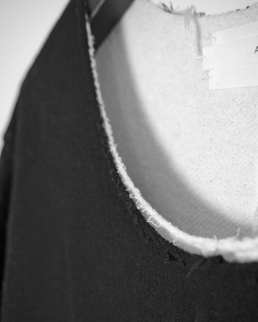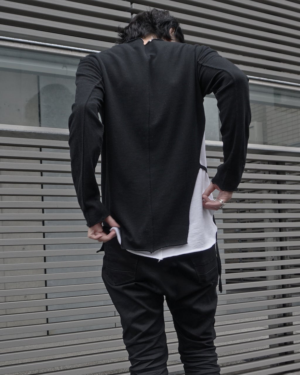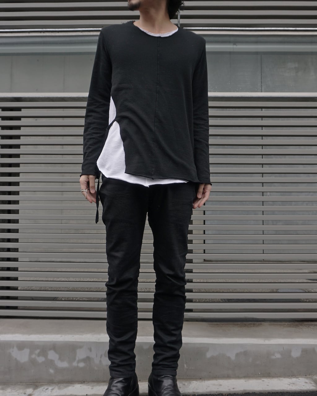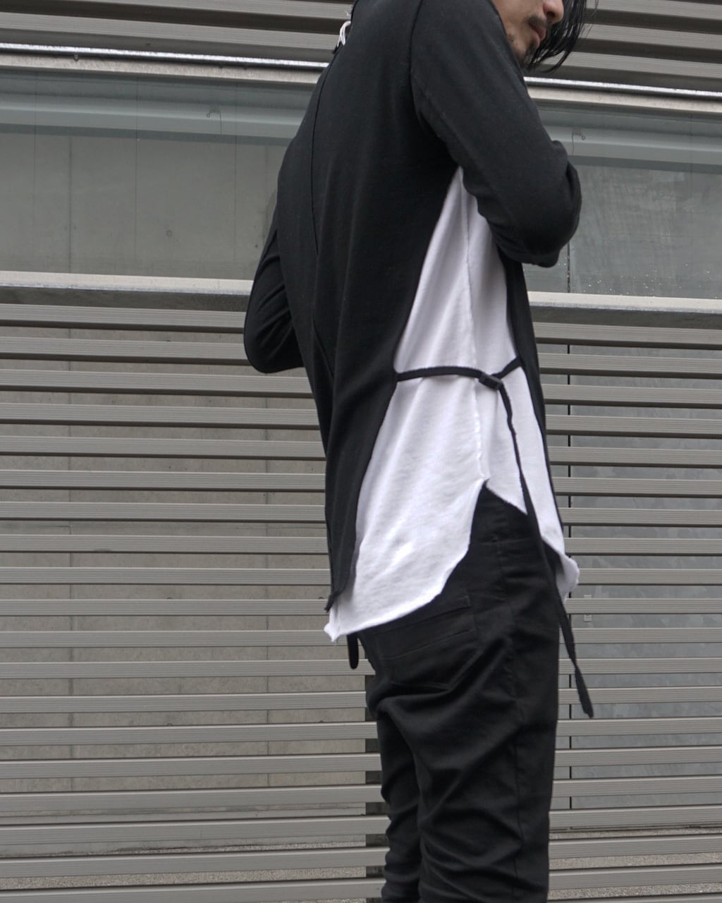 サイドストラップがついたレイヤードスウェット。ミニマルさを保ちつつ、側面の大きなスリット、垂れた細身のベルトコードにより差別化を図る。繊細な素材ながら身頃を2枚重ねにすることによって物性が安定し、透け感も気にせず着用が可能。サイズはレギュラーフィットとリラックスフィットの2サイズ展開。洗い加工済み。