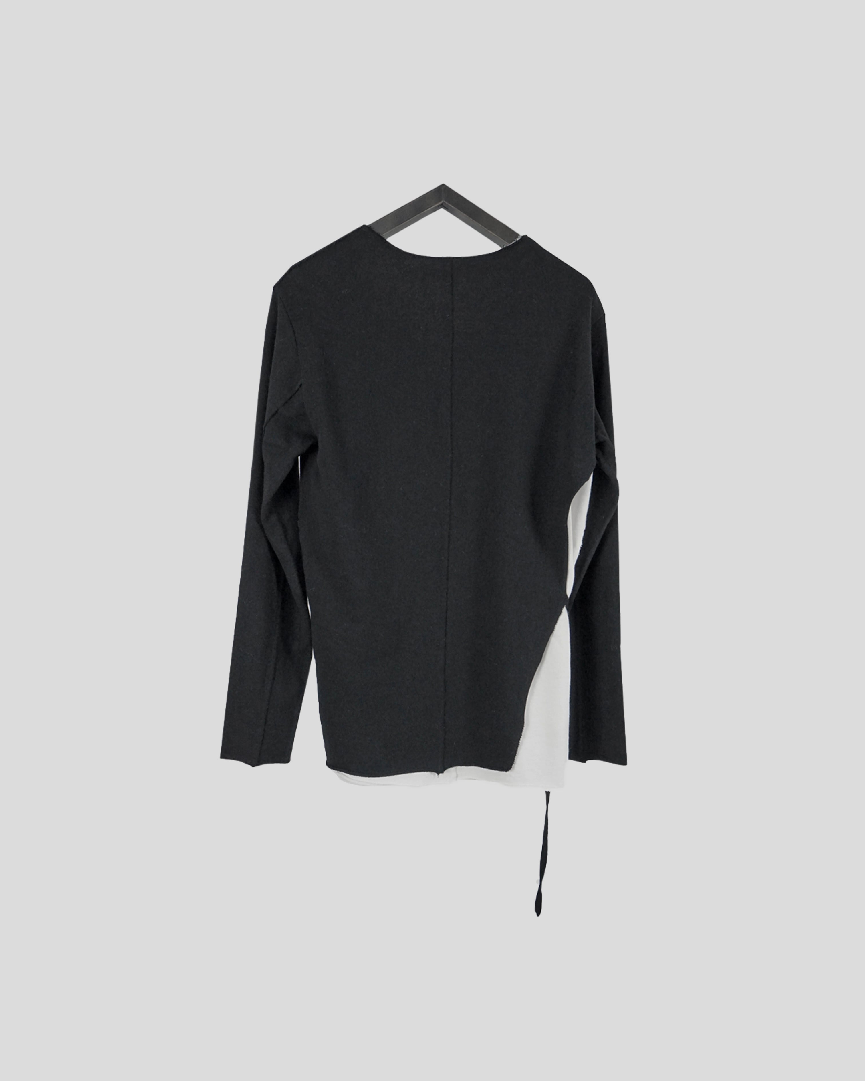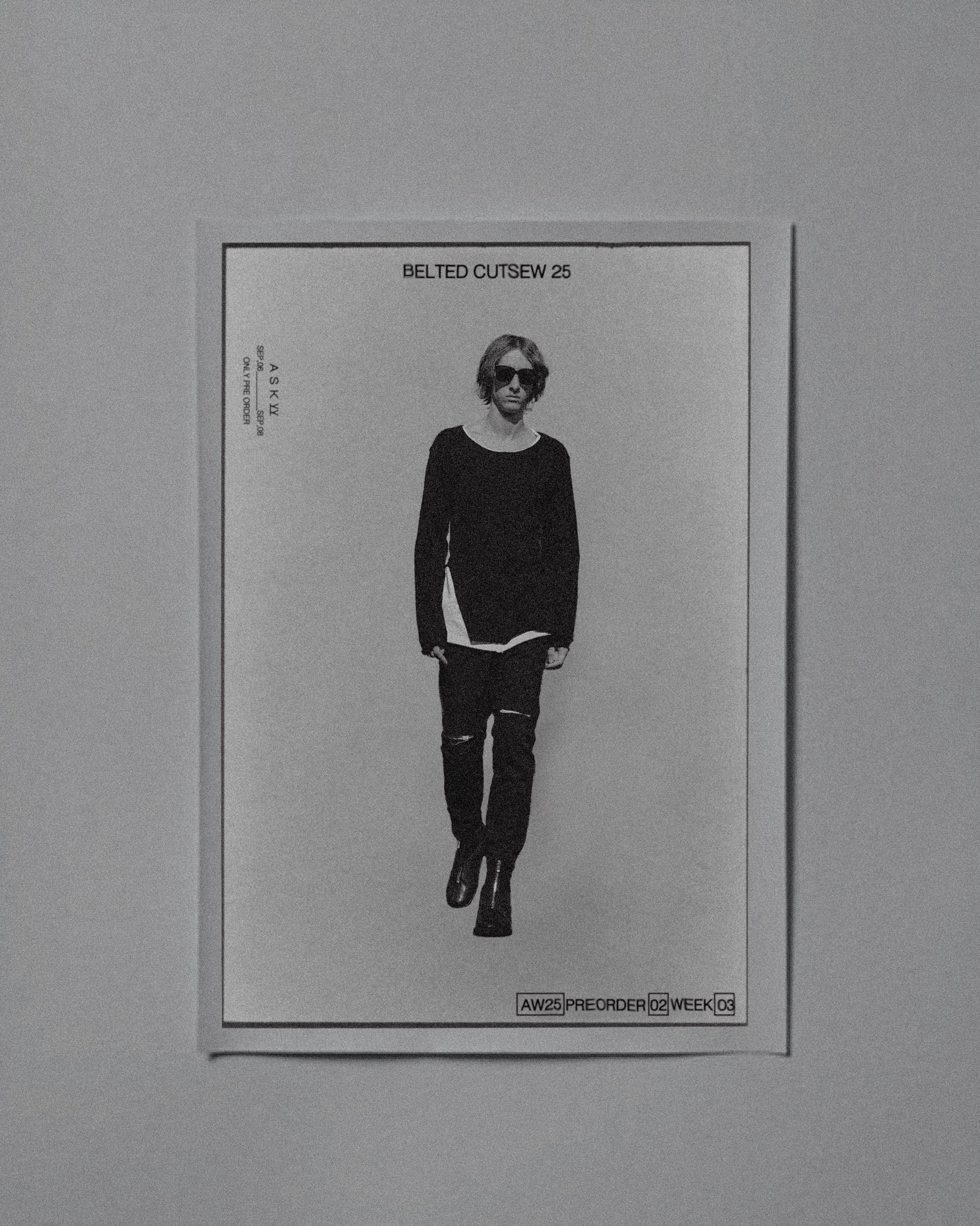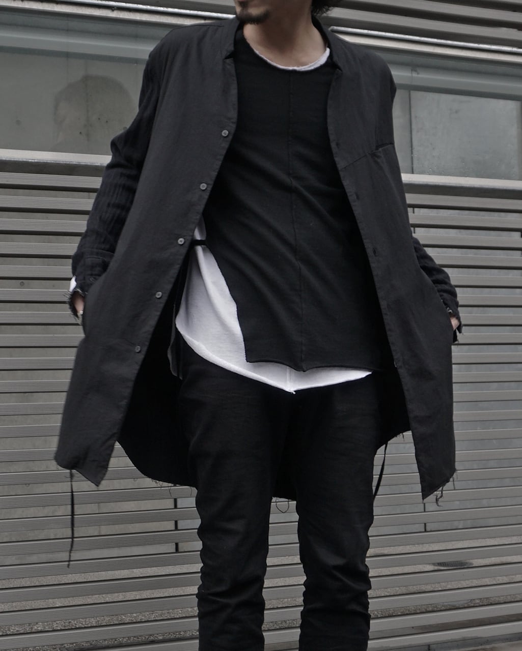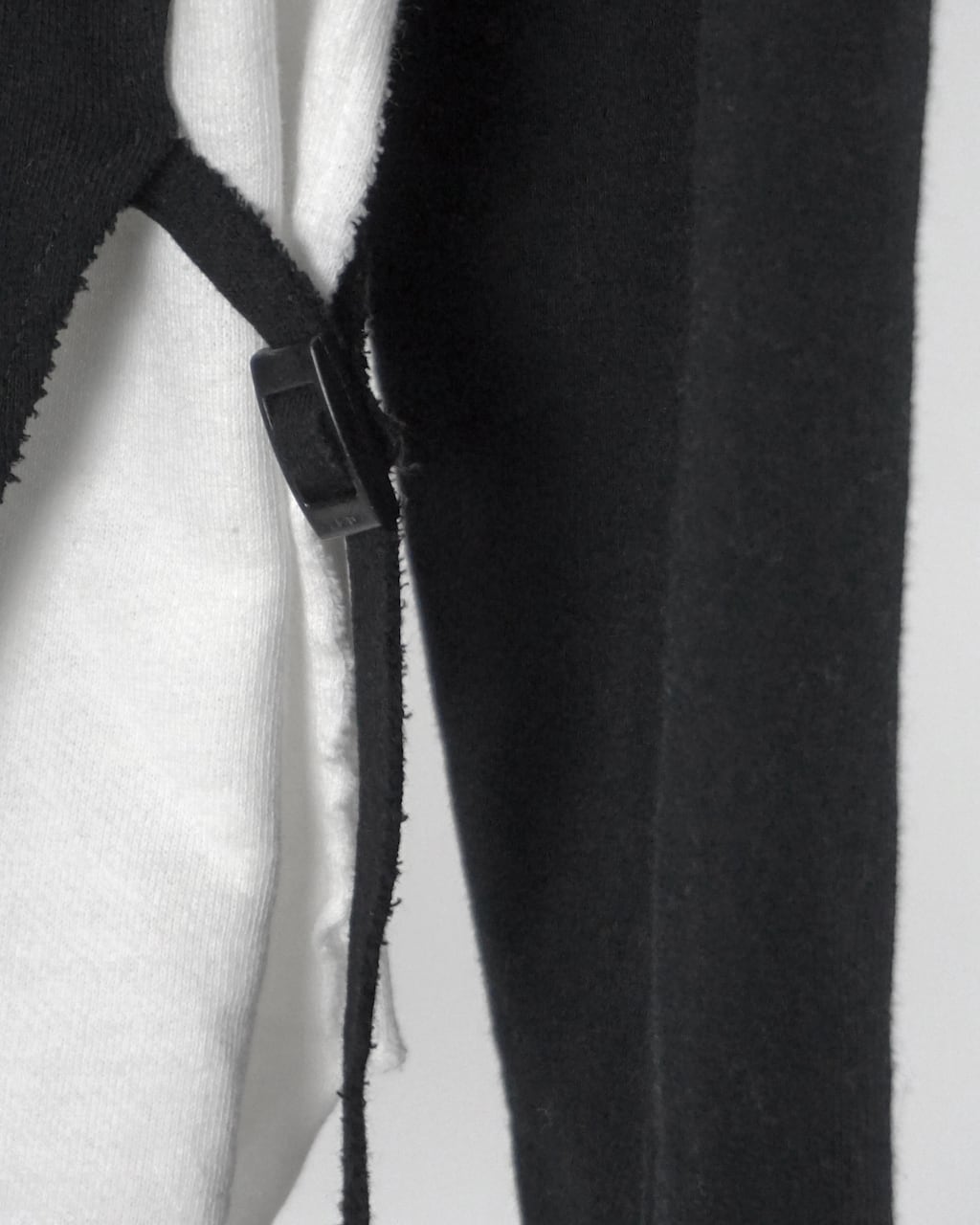 サイドストラップがついたレイヤードスウェット。ミニマルさを保ちつつ、側面の大きなスリット、垂れた細身のベルトコードにより差別化を図る。繊細な素材ながら身頃を2枚重ねにすることによって物性が安定し、透け感も気にせず着用が可能。サイズはレギュラーフィットとリラックスフィットの2サイズ展開。洗い加工済み。
