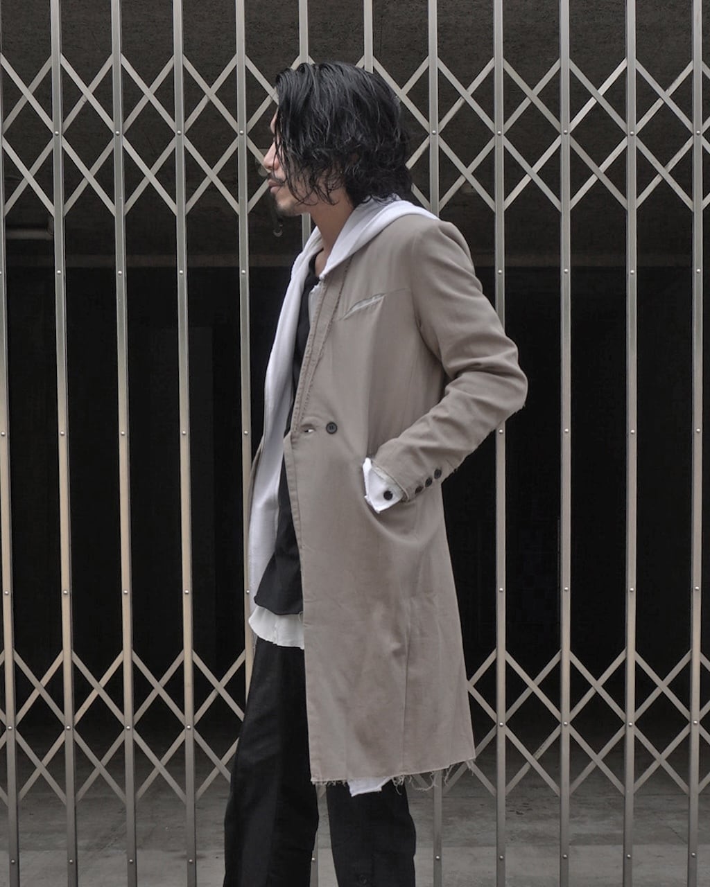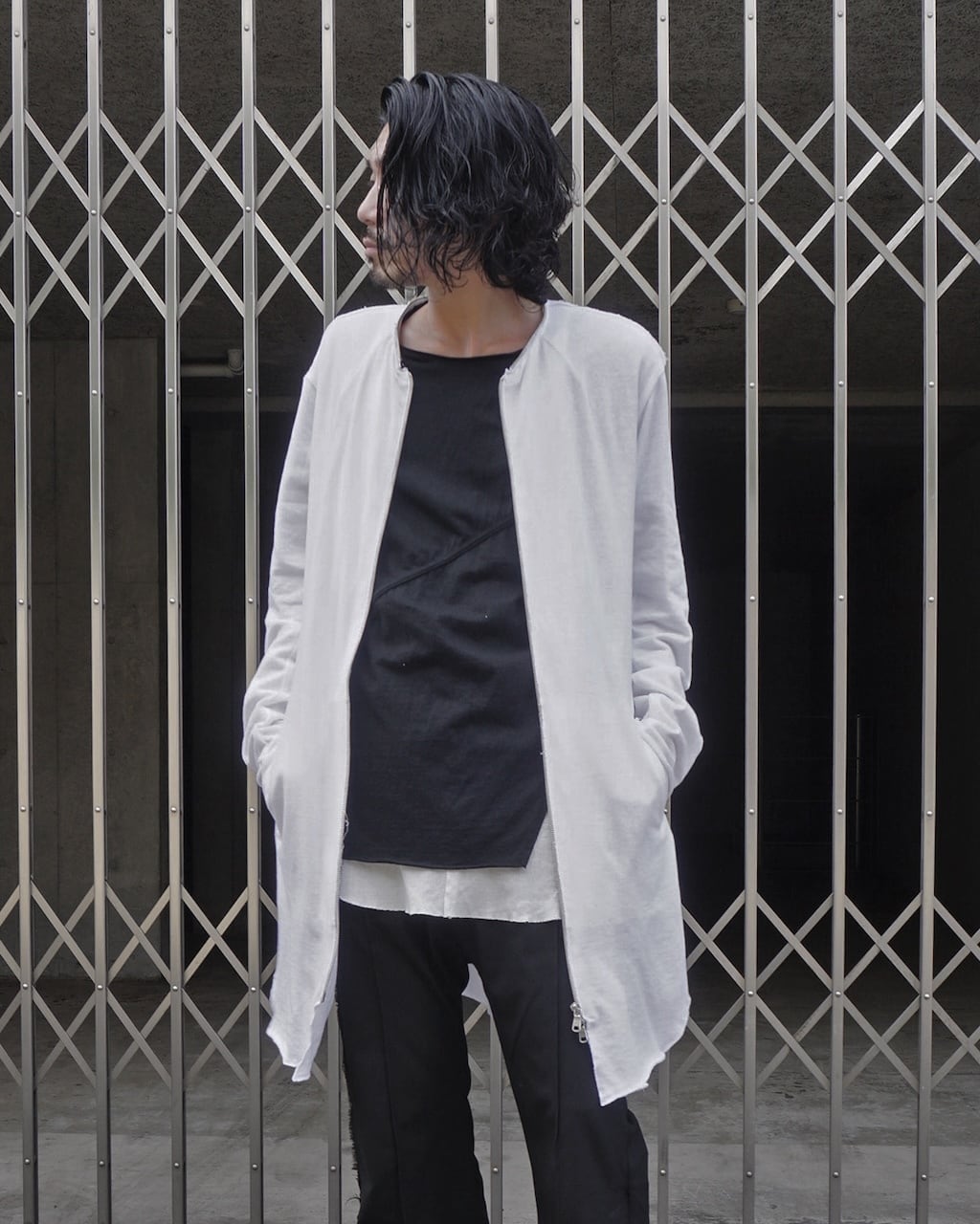 ロングジップブルゾンとしての振る舞いもあれば、フォーマルやモードな印象が強いコート類をカジュアルダウンさせるハズしアイテムとしての側面をもつ。袖口はジャケットのように3つボタン仕様でラフになりすぎない工夫。背面もセンターベント仕様。形はシンプルながら、機能・普遍性・細部にまでこだわった。スタイリングの拡充を担えるレイヤード用の作品。