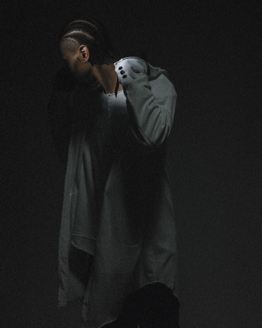 It can act as a long zip-up blouson, or as a “disruptive” item to dress down formal or mode-oriented coats, giving them a casual edge. The cuffs are designed with a three-button detail, like a tailored jacket, to prevent the look from becoming too relaxed. The back features a center vent. While the silhouette is simple, the garment is rich in function, versatility, and attention to detail. Designed as a layering piece, it expands the scope of styling possibilities.