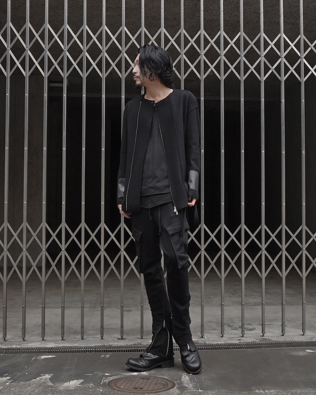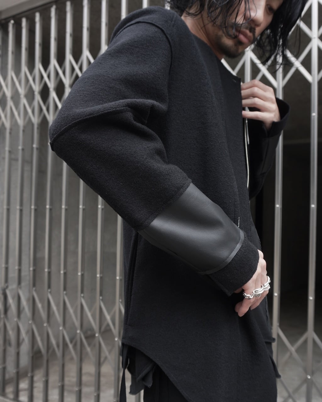 Asymmetrical, collarless riders jacket.The front is kept minimal and restrained, with design emphasis placed on the sleeves to create a calm and timeless appearance.Light enough to wear as an outer layer in early autumn, yet slim enough to style as an inner piece during winter—versatile across seasons.