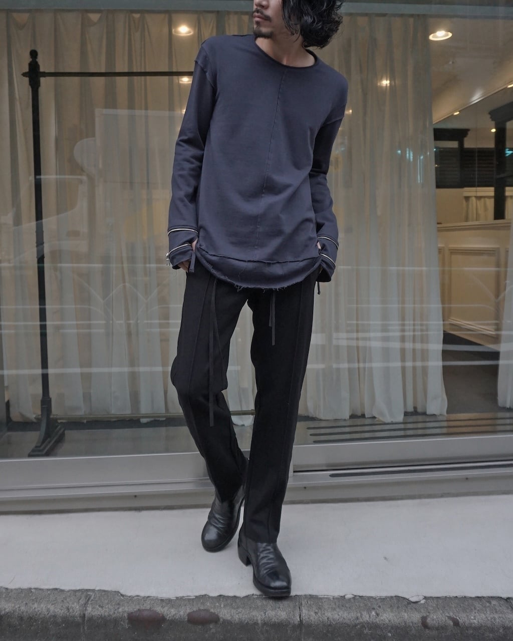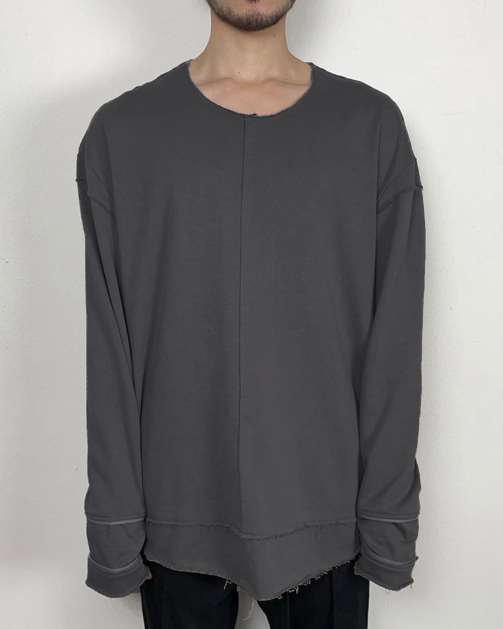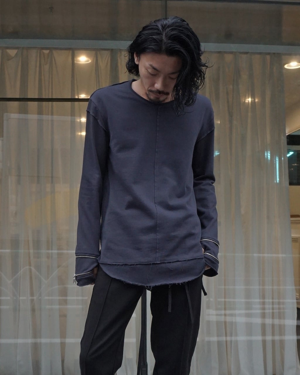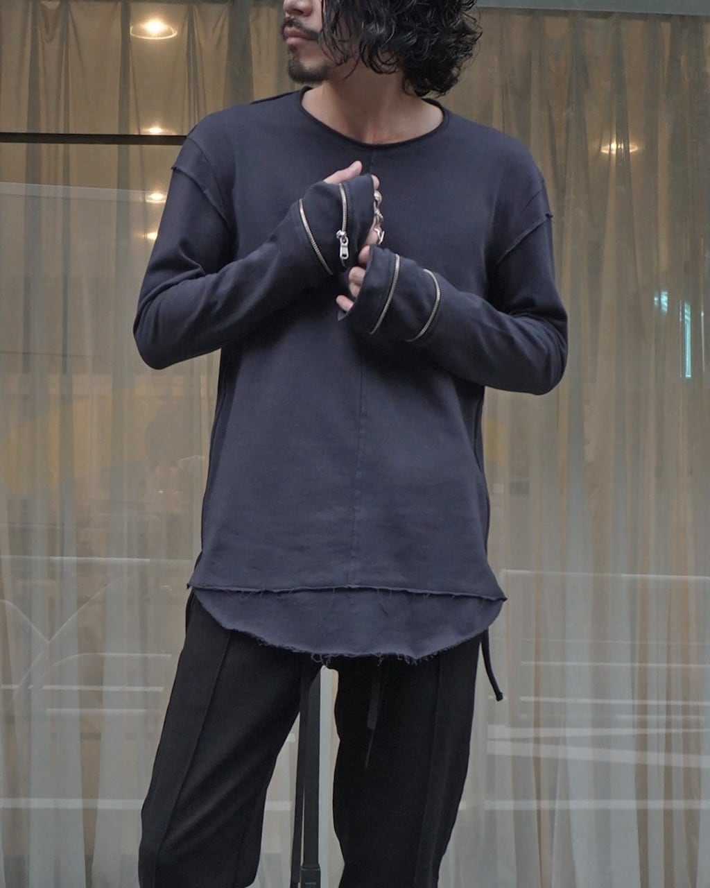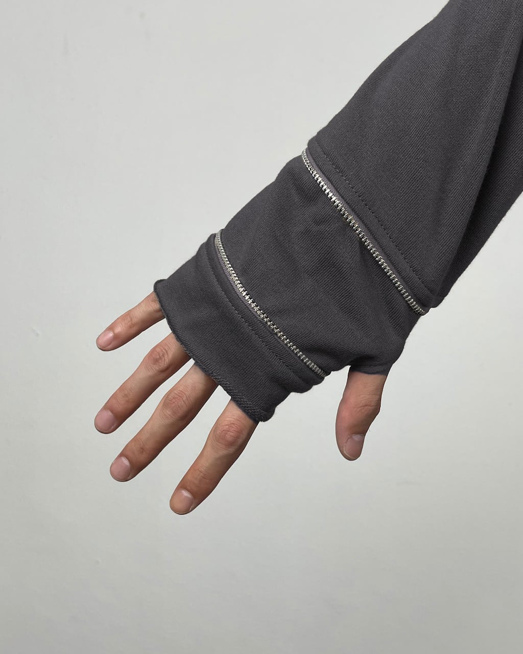 袖のジップを開けることでグローブのように変化するインナーカットソー。手が寒い時の防寒用、あるいはスタイリングの味付けとして実用性・装飾性に優れた作品に仕上がっている。(ジップ裏は金属が肌に触れないように設計済み。)