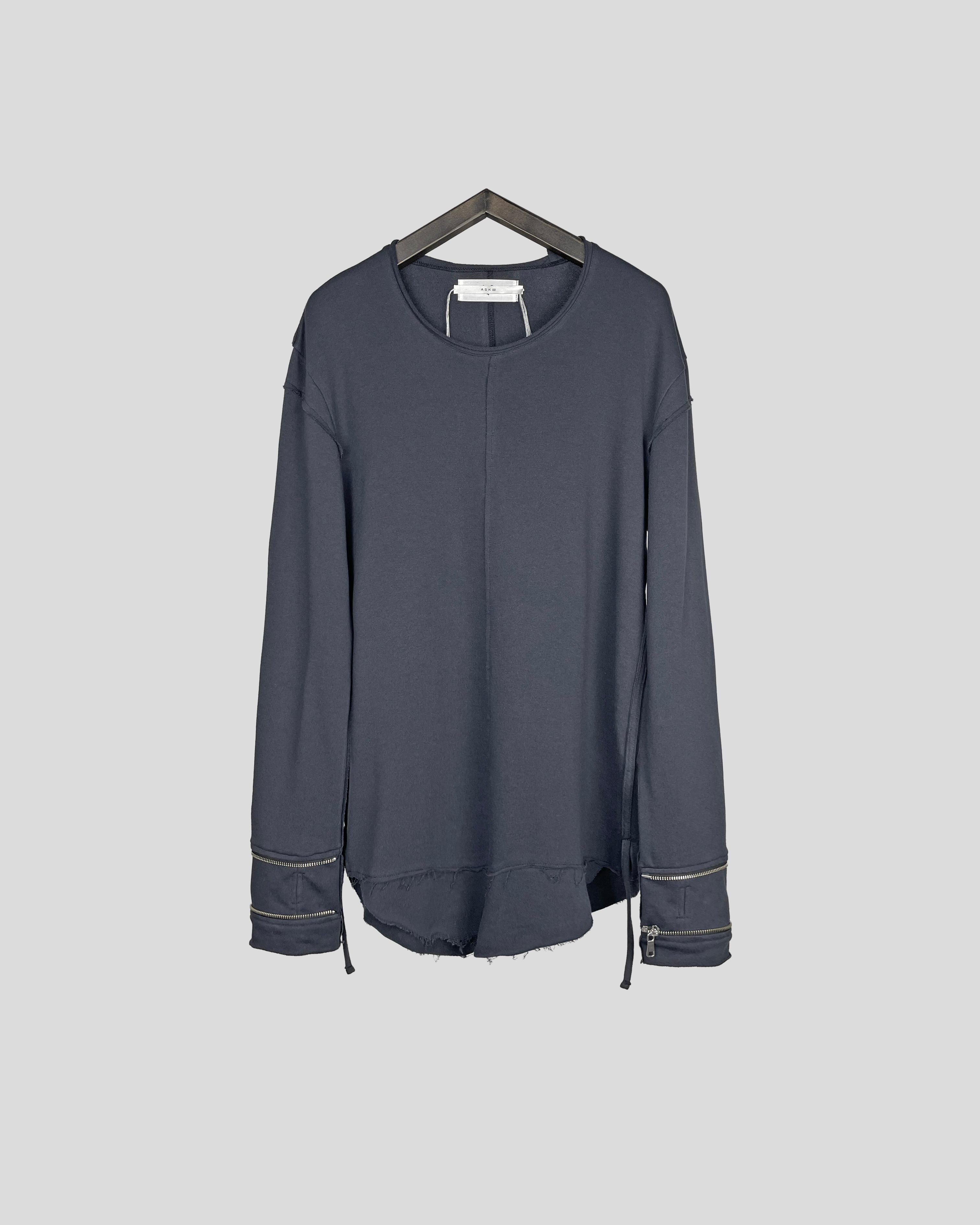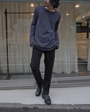 ダブルショルダーの肩線、レイヤーの裾など細部まで作り込むことで、立体的で主役級の1枚となっている。また、裾にはコードを垂らすなど繊細なASKYYのアイコンが凝縮。25AWシーズン唯一のインナーとしてリリースする渾身の作品。製品後に洗い加工でエイジング済み。