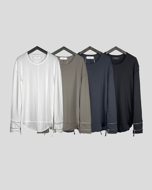 Detailed with double-shoulder seams and layered hems, the piece has been carefully crafted to achieve a three-dimensional silhouette that can stand on its own. The hanging cords at the hem embody ASKYY’s delicate signature details. This is a masterpiece released as the sole innerwear item of the 25AW season, aged through a post-production wash process.
