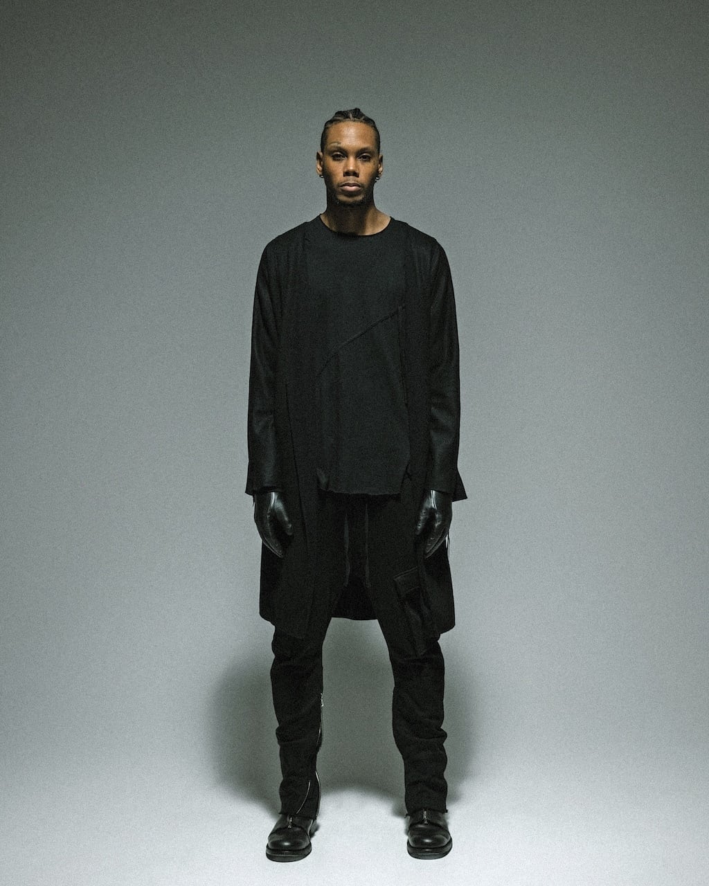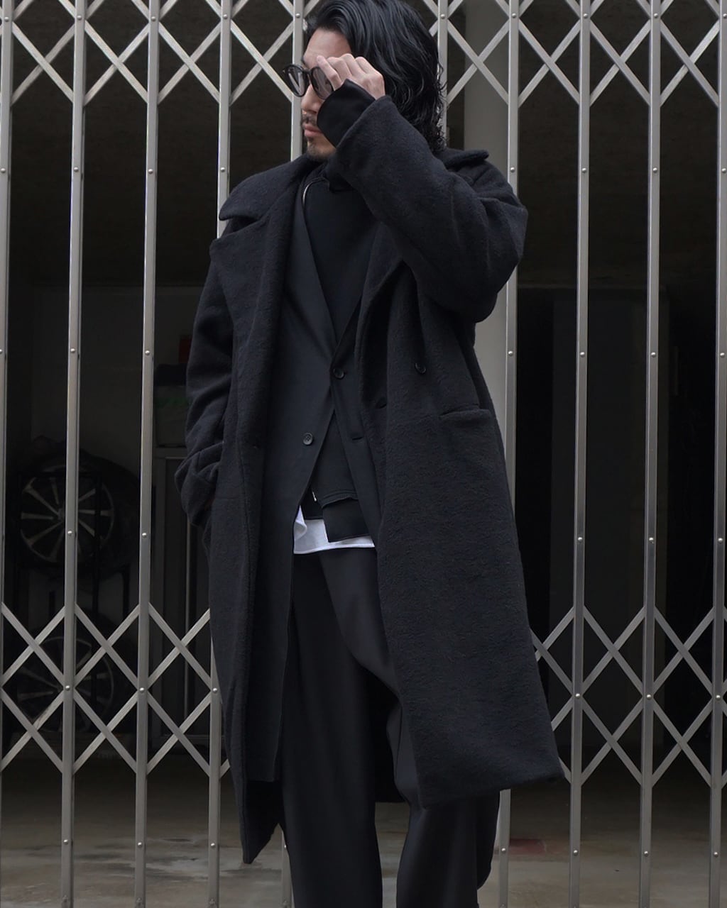 アームホールを排除したドルマンスリーブ型もフリーな着用感をもたらし、この設計でしかなし得ない美しいドレープを作り出す。裾には2本のコードが垂れており、ボヘミアンな雰囲気を加えて印象を緩和。気温の嫦娥が激しく服選びが難しいこの時期に重宝する、「アウターすぎない」アイテムが完成した。