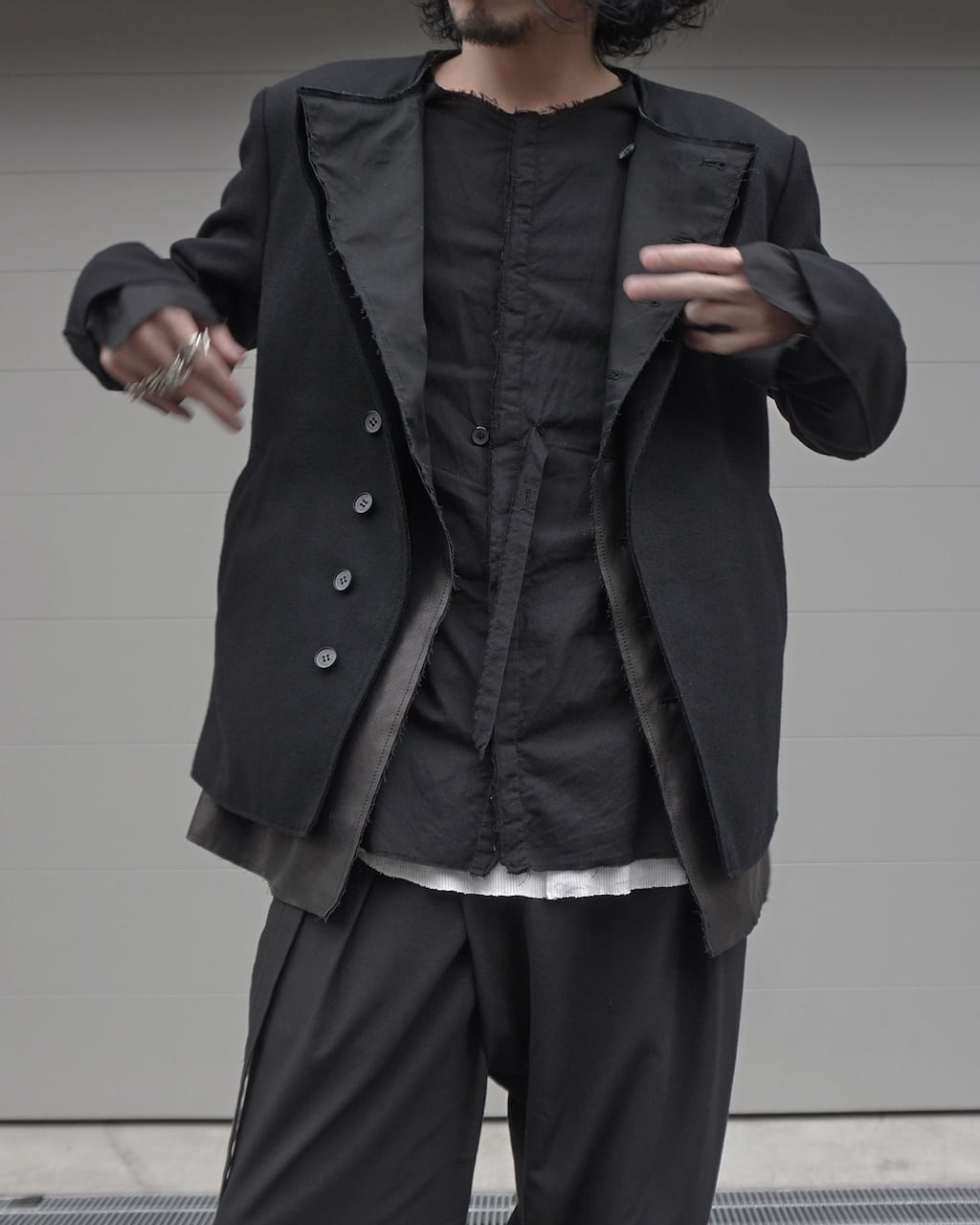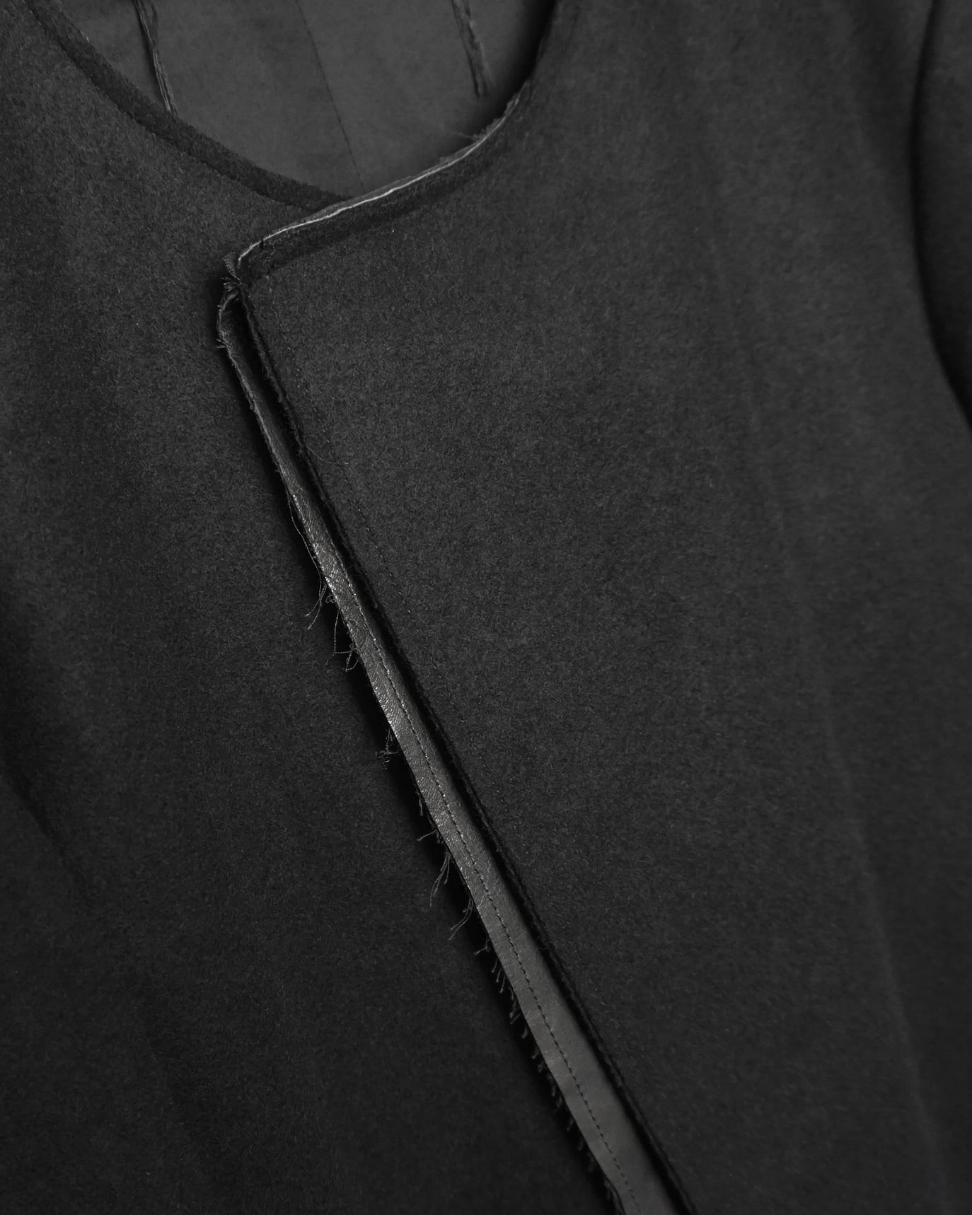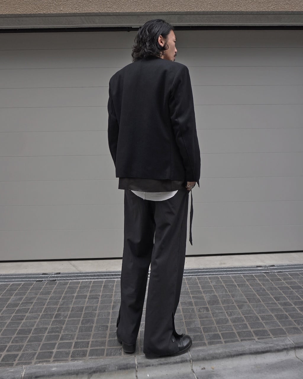 リアルレザーを表地ではなく、あえて裏地に配した仕様。表層的な派手さではなく、わきまえた静かなラグジュアリーを宿す。今季より襟はノーカラーへと仕様変更し、レイヤードスタイルを際立たせている。フロントは、ボタンが見えないフラットな設計とし、より研ぎ澄まされたミニマルな印象。袖は完全二枚仕立て。