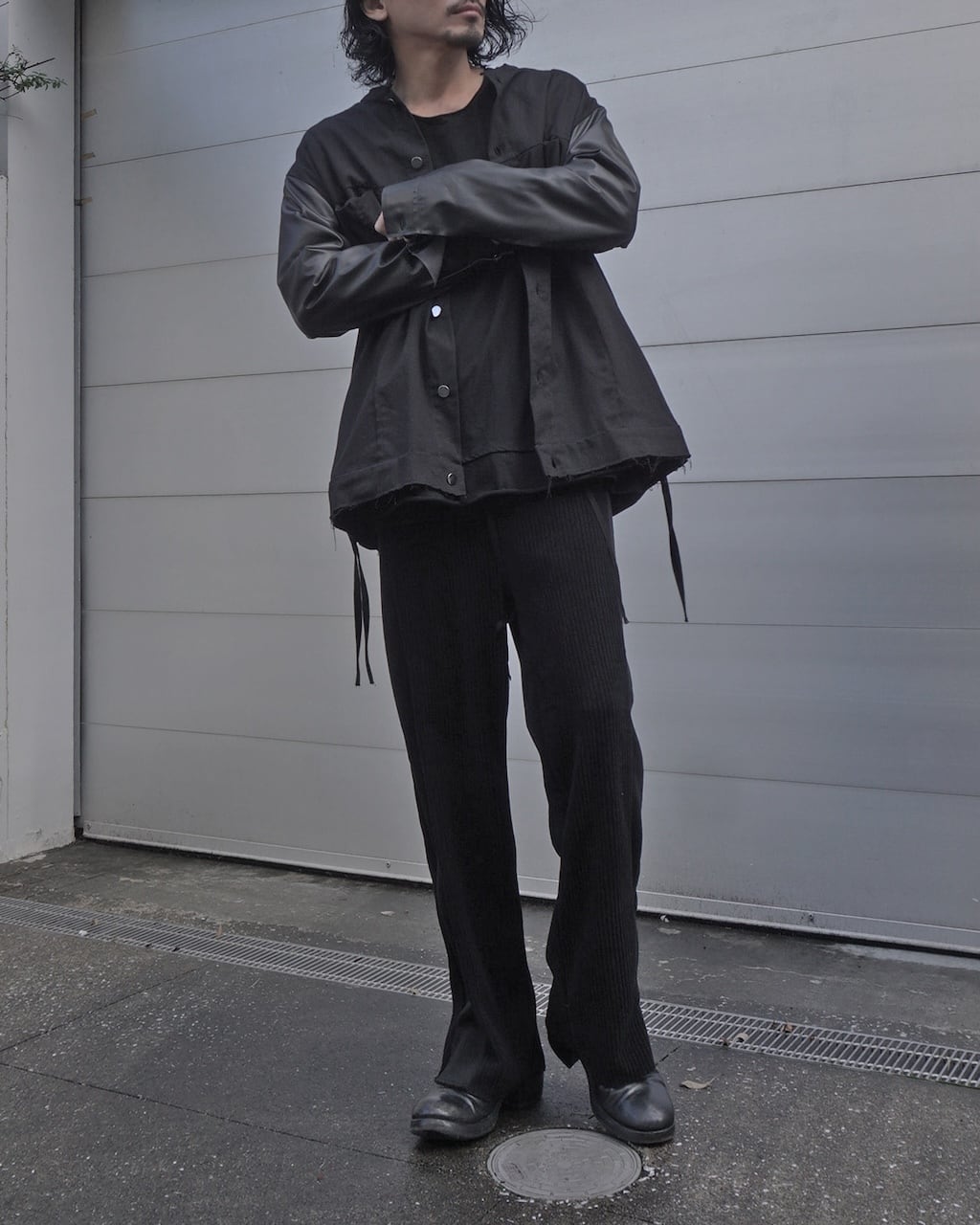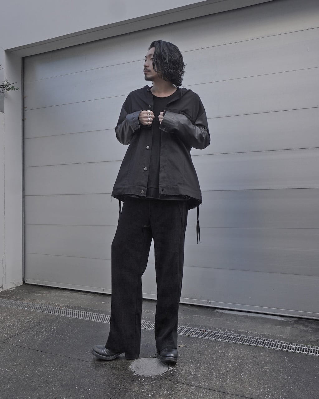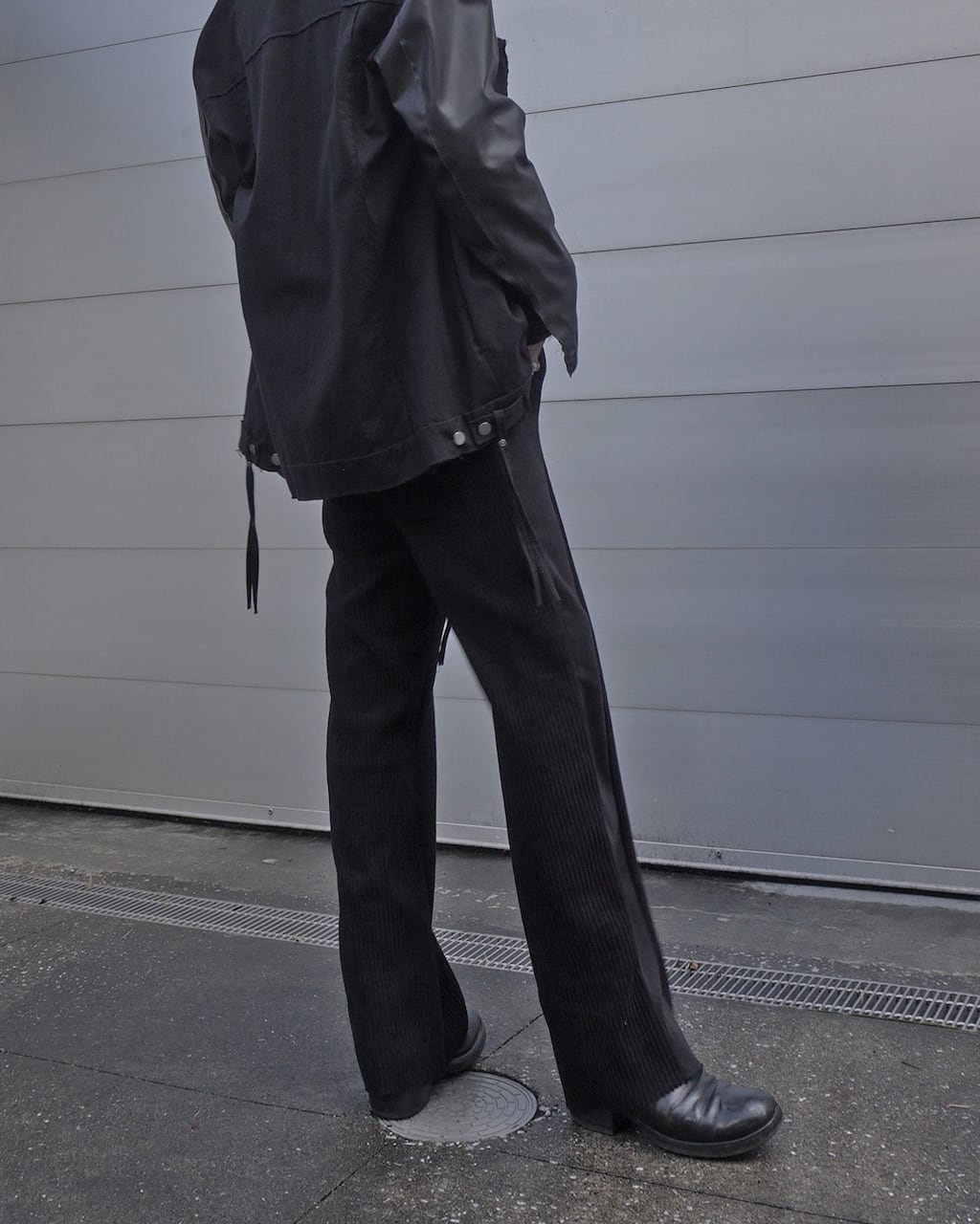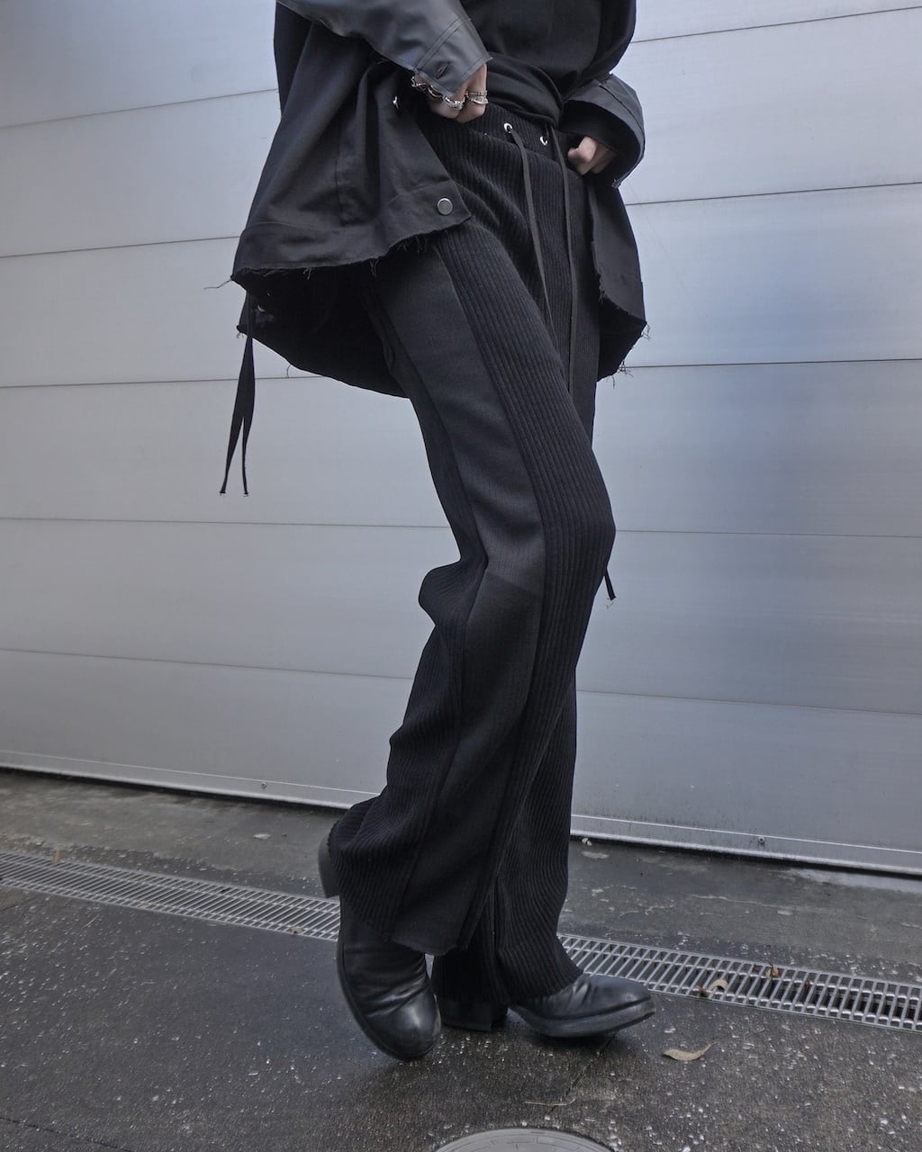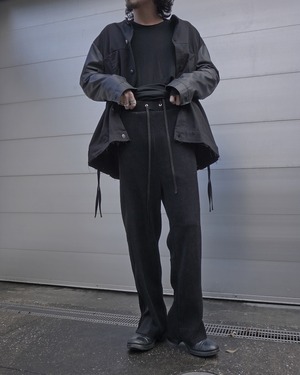 The rise is set slightly deeper, achieving a balanced silhouette that’s neither too wide nor too slim. The side panels are switched with the reverse side of the fabric, creating a side line reminiscent of track pants.