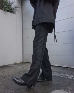 股上はやや深めに設定し、太すぎず細すぎない絶妙なバランスのシルエットに。側面には裏返しの生地パーツを切り替えとして使用し、トラックパンツを思わせるサイドラインを形成している。
