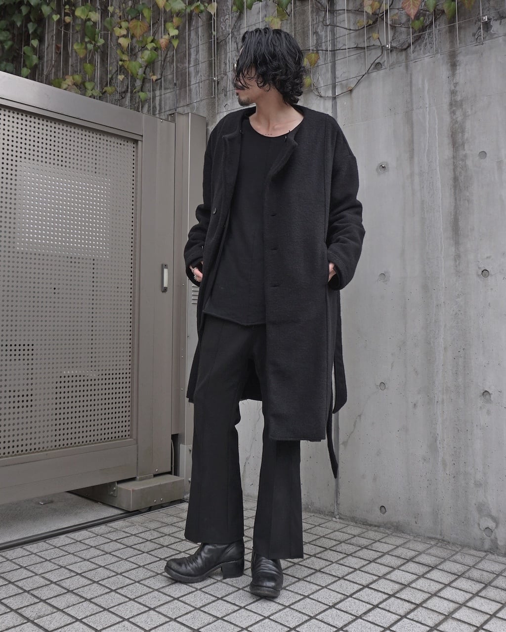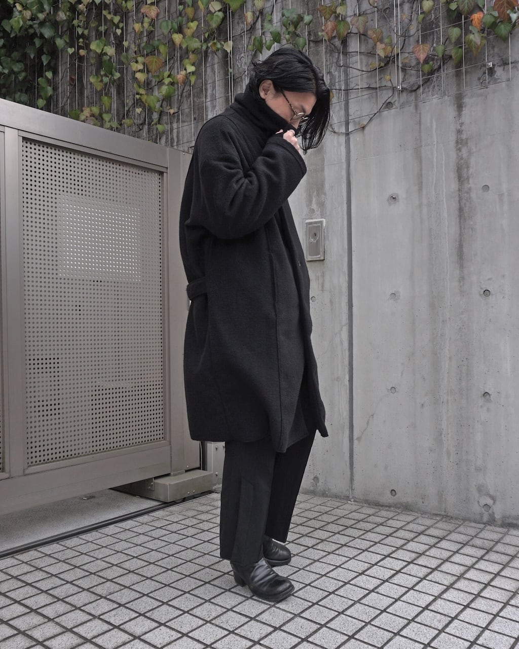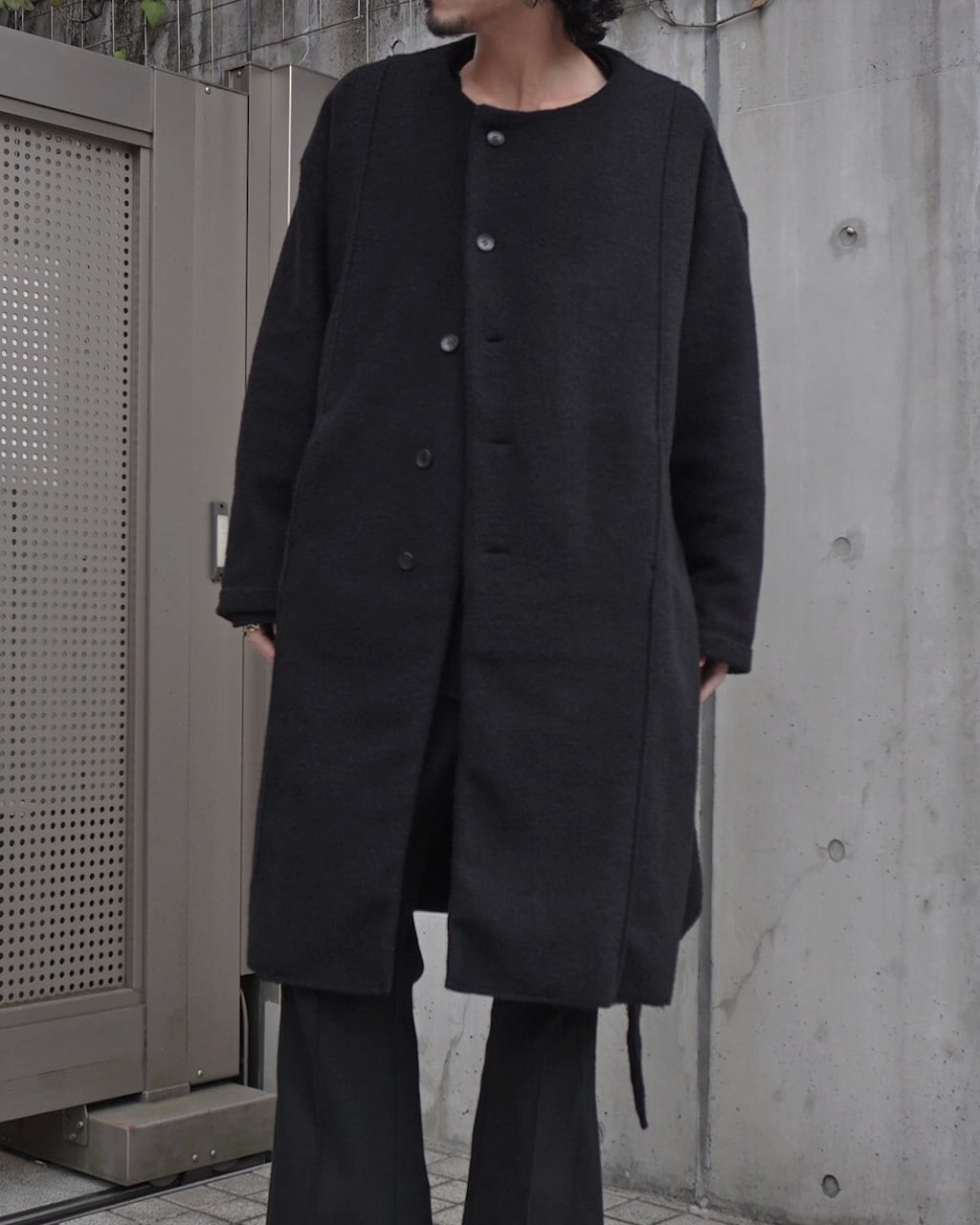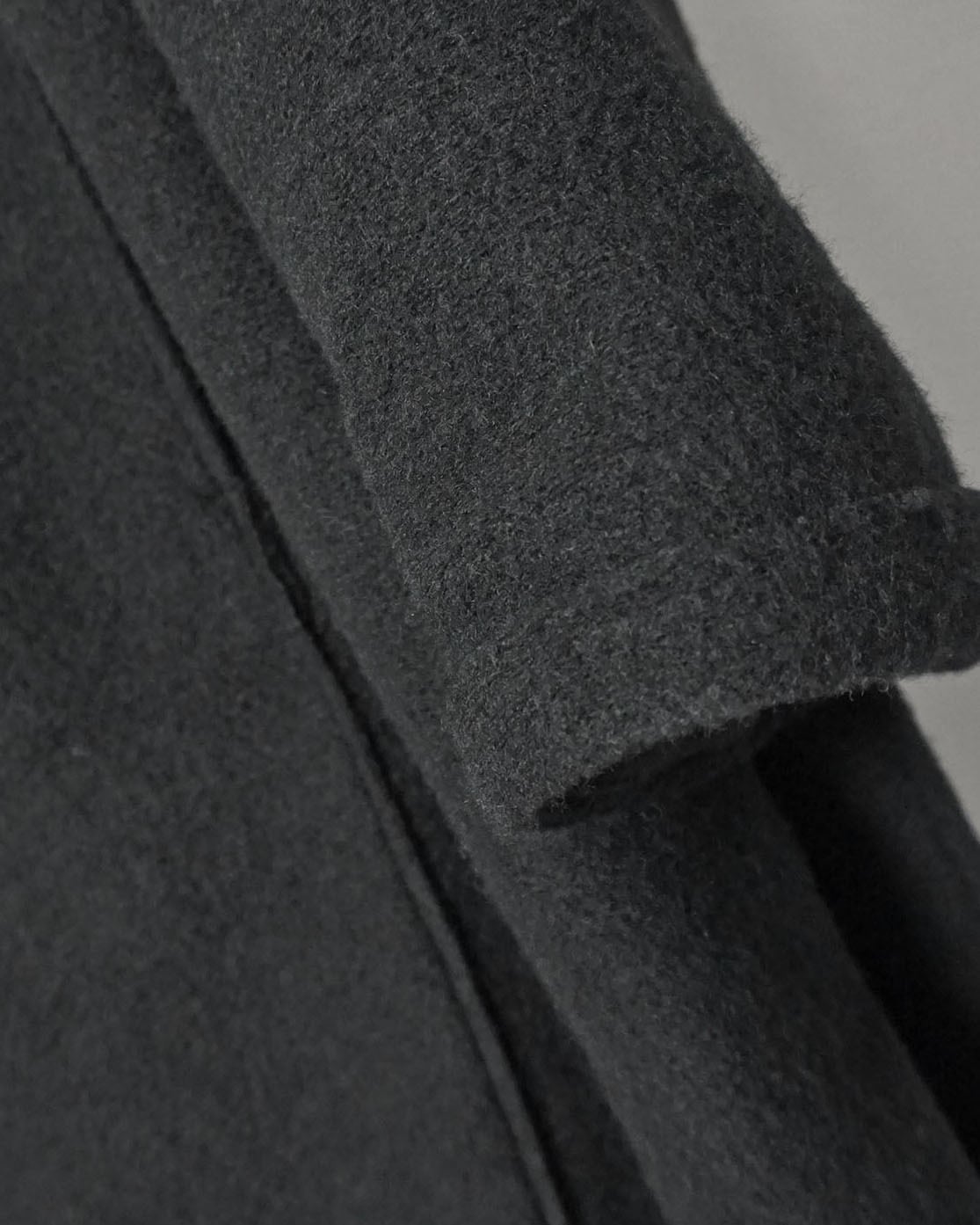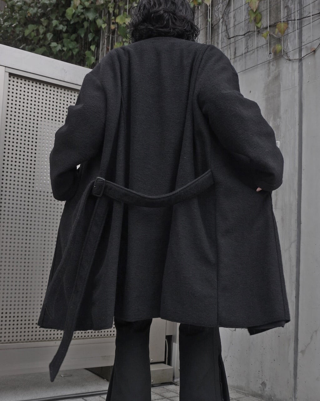 ゆとりを持たせた身幅は、包み込むような安心感とリラックスしたシルエットを演出。よって、薄手のアウターにも羽織ることが出来る設計。背面には2本のベルトを束ねて垂らすデザインを採用し、さりげないアクセントに。重厚なメルトンコートのような見た目でありながら、驚くほど軽く、肩への負担を感じさせない快適な着心地に仕上げている。内ポケット有。