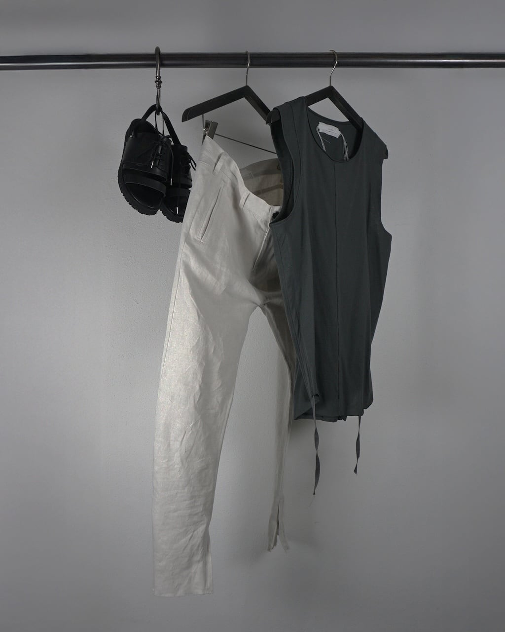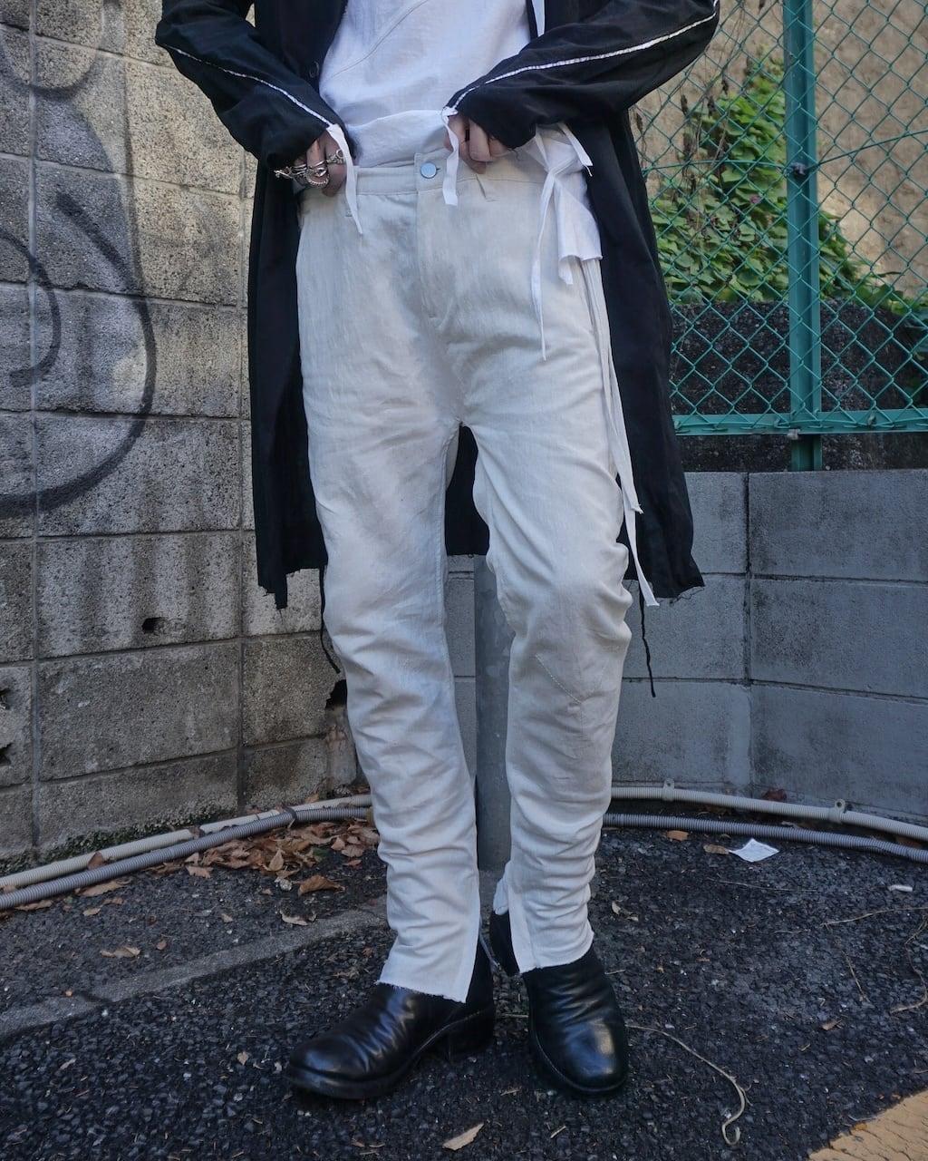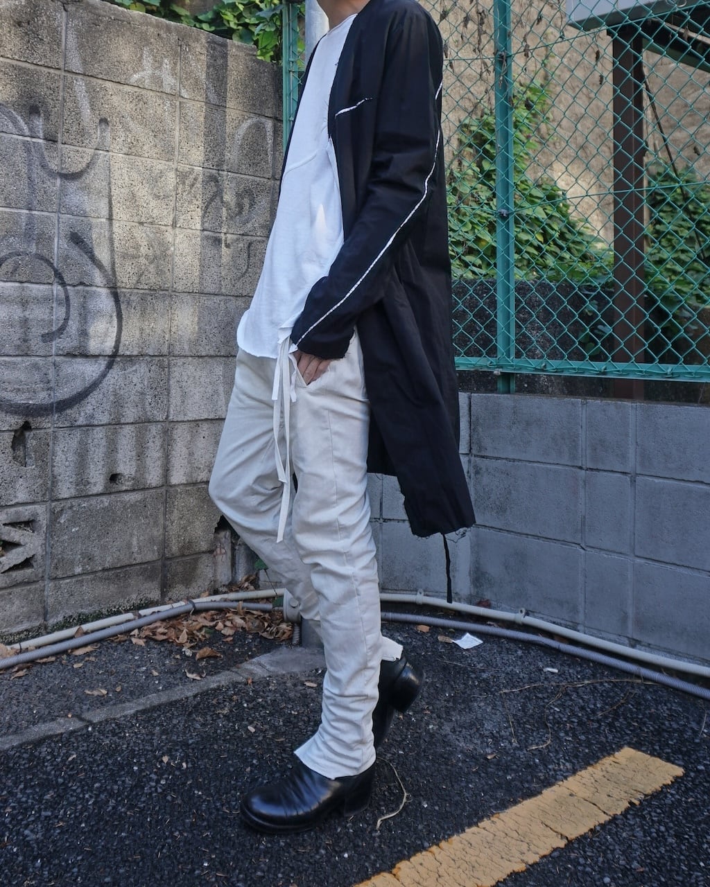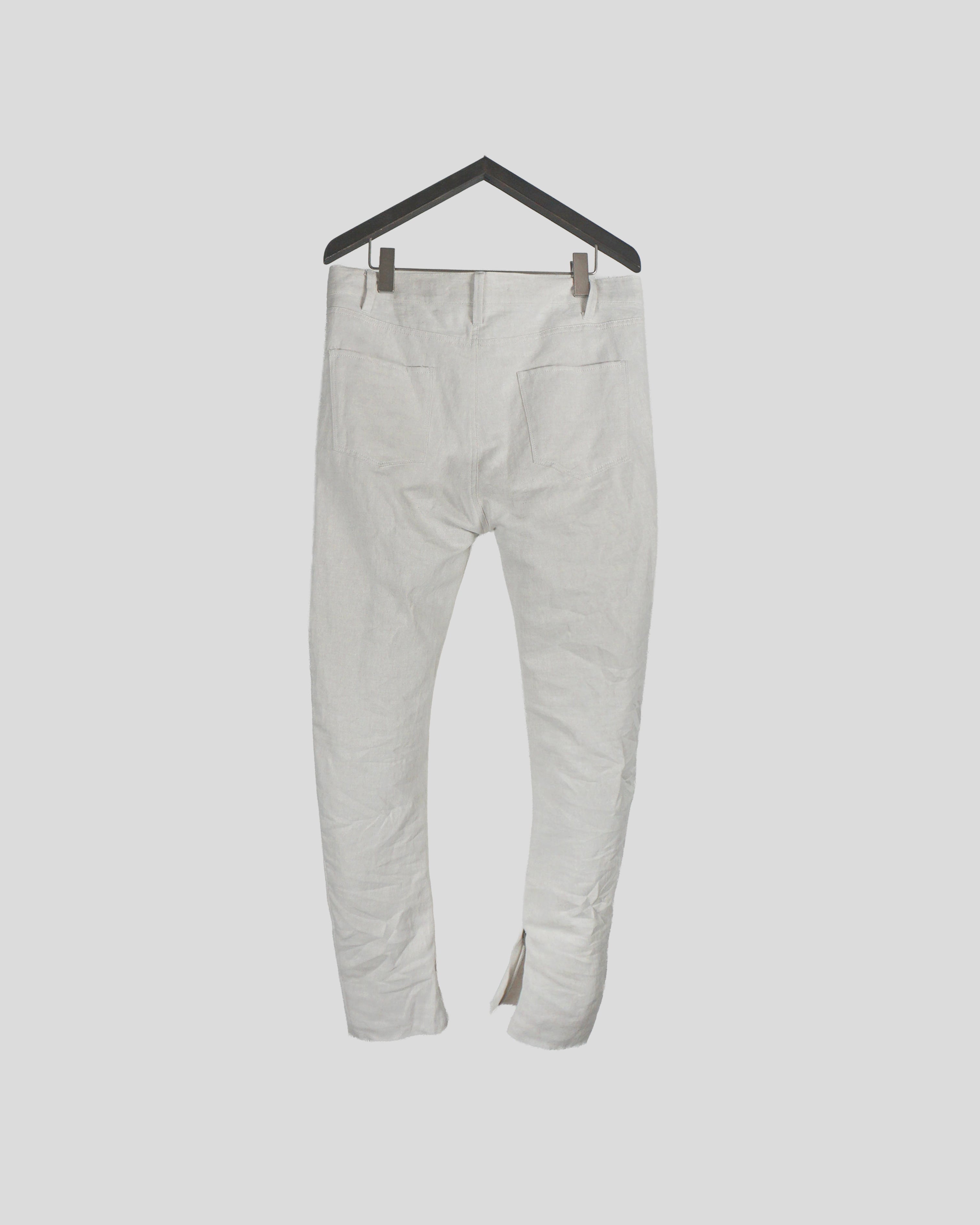 夏場のリネンシャツや、くたっとしたカットソーに大変相性がよいテクスチャーで、夏の装いを際立たせる一品。シルエットや細部の作りは変わらず、内側に湾曲させた立体シルエットでやや深めに設定された股上もY DENIMならではの特徴。膝にはさりげないYのステッチがあり、裾のジップで靴とのつながりを綺麗に見せる。