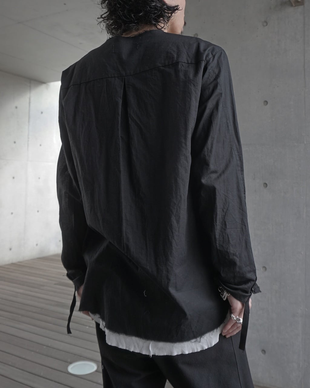 リネン100%に比べてごわつきが抑えられ、ガーゼのような繊細さを持ちながらもしっかりとハリがある。生地自体は薄く、肌にまとわりつかない軽さとドライな爽やかさが特徴。製品後に施した洗い加工で、さらにグランジ感を強調させた。