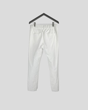 縦方向に走るピンタックが特徴で、脚線を美しく見せるだけでなく、日々のプレスを不要にした実用性を備える。ウエストは背面のみゴム仕様とし、フロントのシャープな見た目を崩さずに快適さを両立。フロントにはドローコードが付属し、スウェットパンツのような気軽さで着用可能。