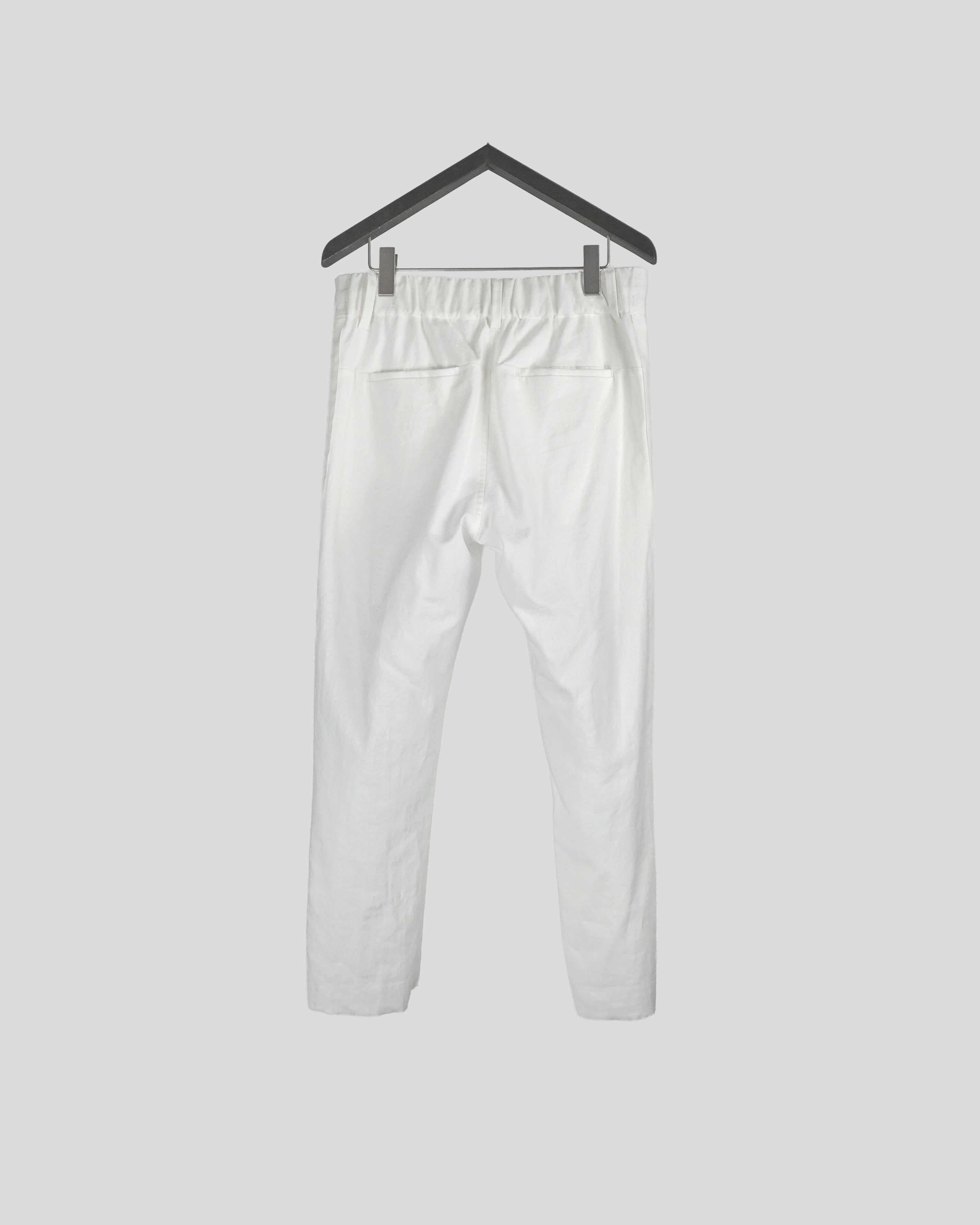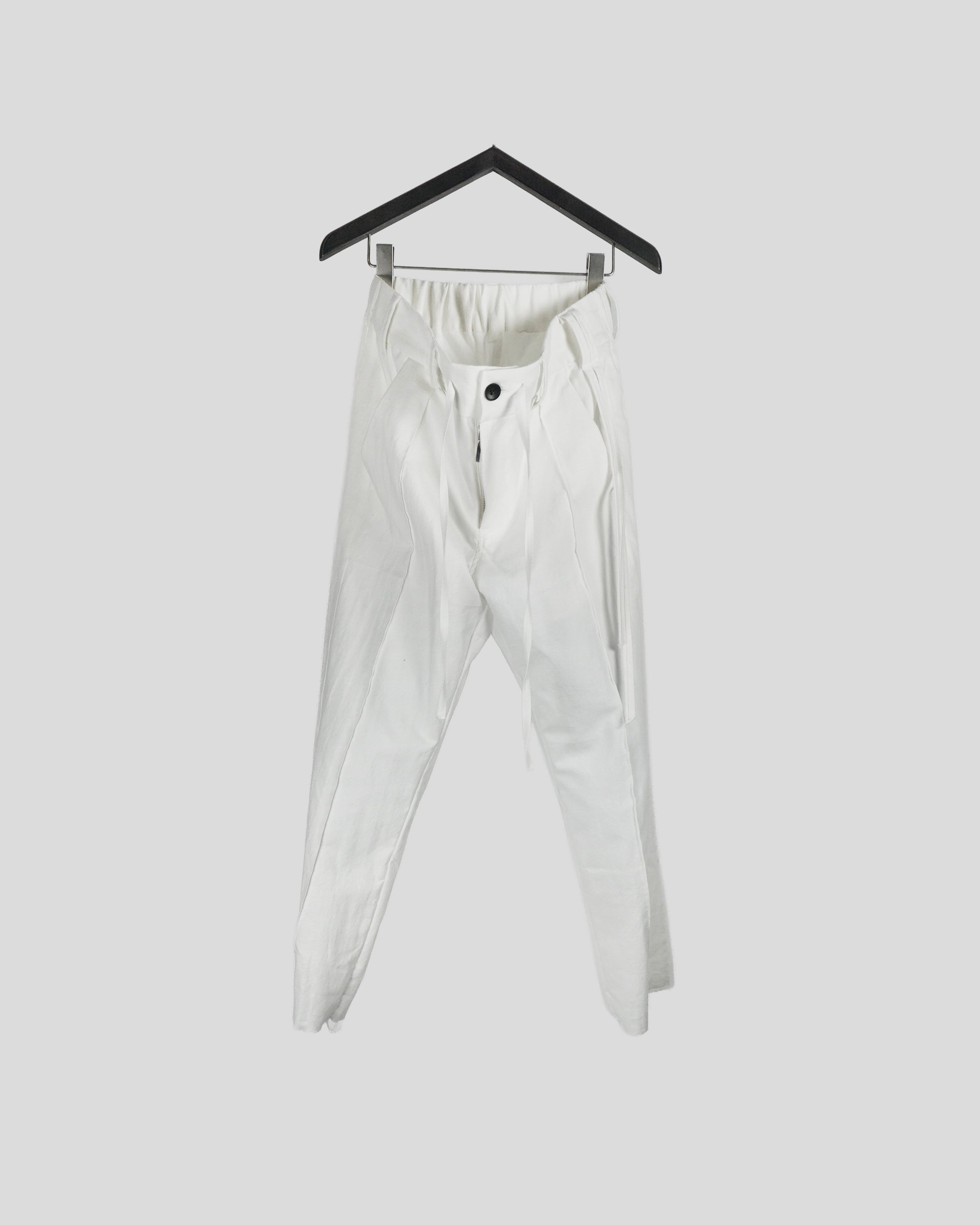 裾だけはあえて裁ち切りとし、フォーマルさとグランジ感のバランスを調整。ロールアップも容易で、カジュアル〜モードまで幅広く対応する懐の深さを持つ。ほどよく細身のシルエット。