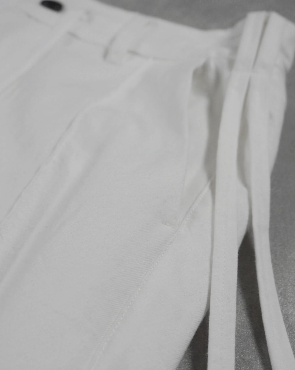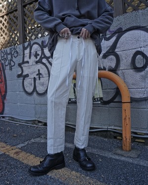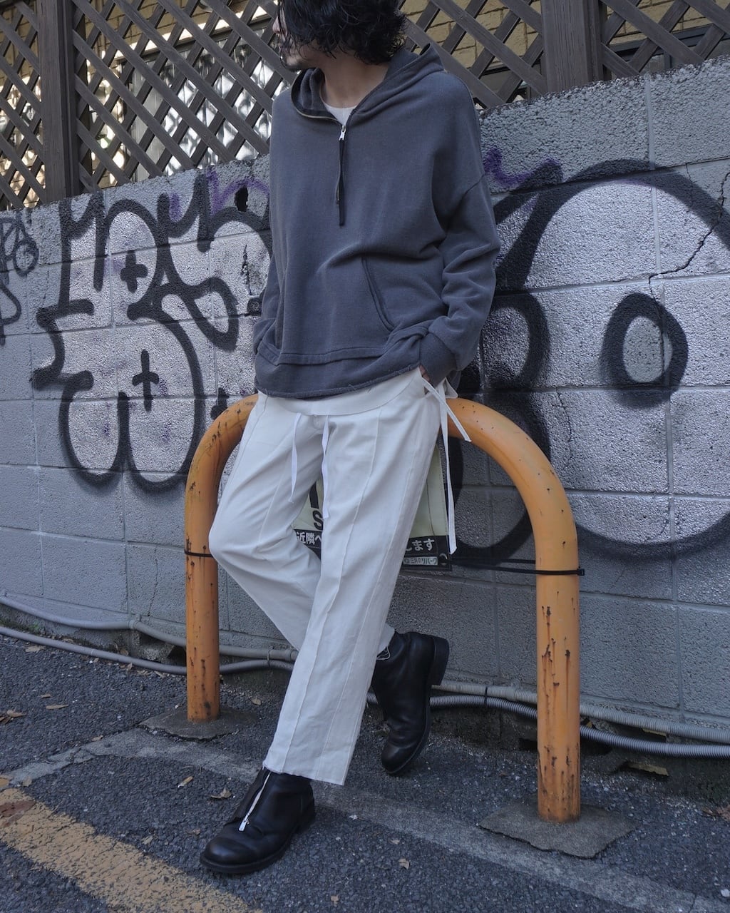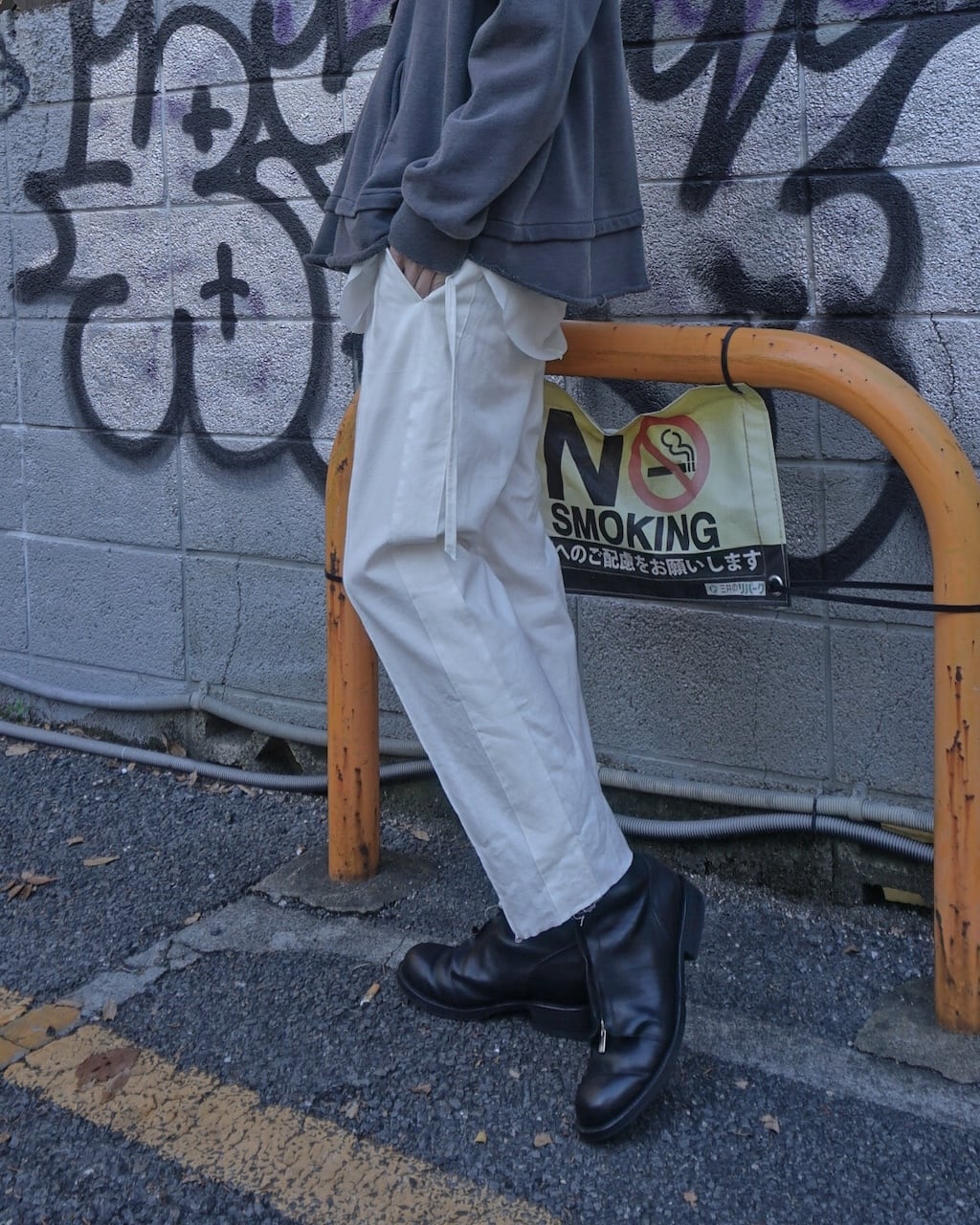白パンの可能性をASKYYらしく再定義した一本。モノトーンを主軸とするブランドにとって“白”は欠かせない存在でありながら、品の良さと扱いやすさを両立させる難しさがあったが、ようやくブランドとして提示できる作品が完成。