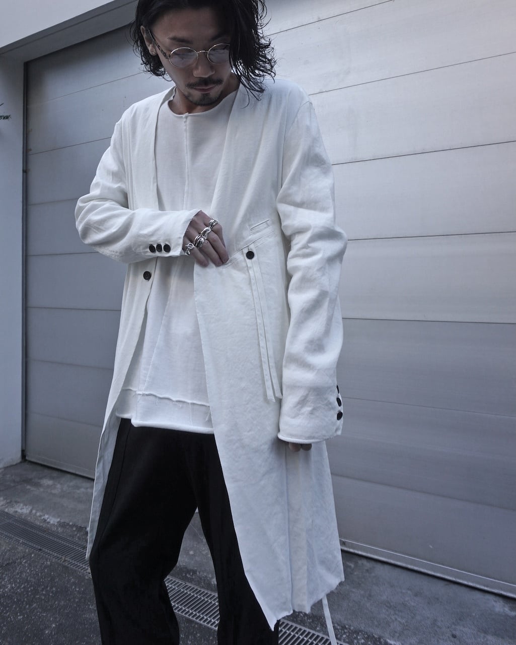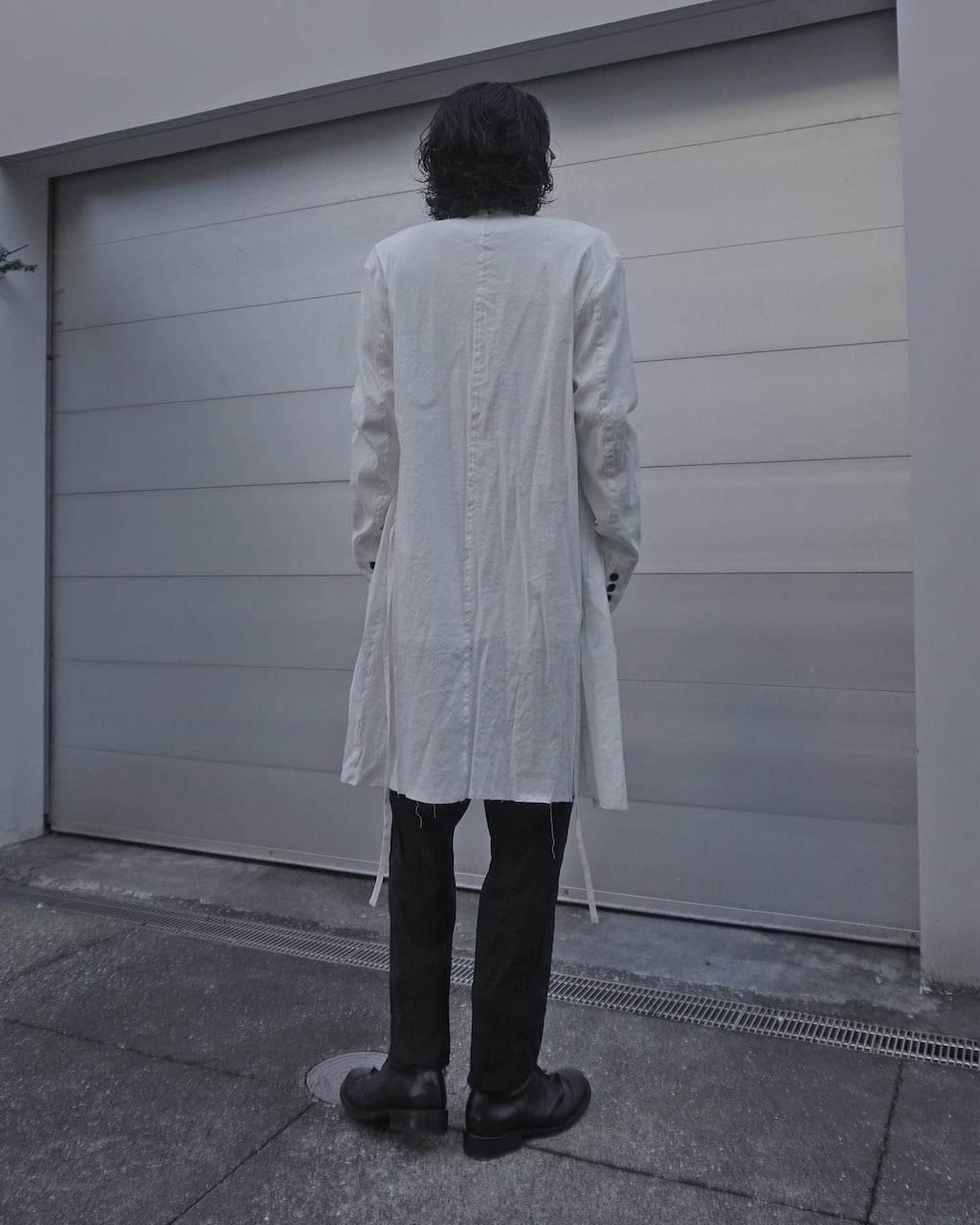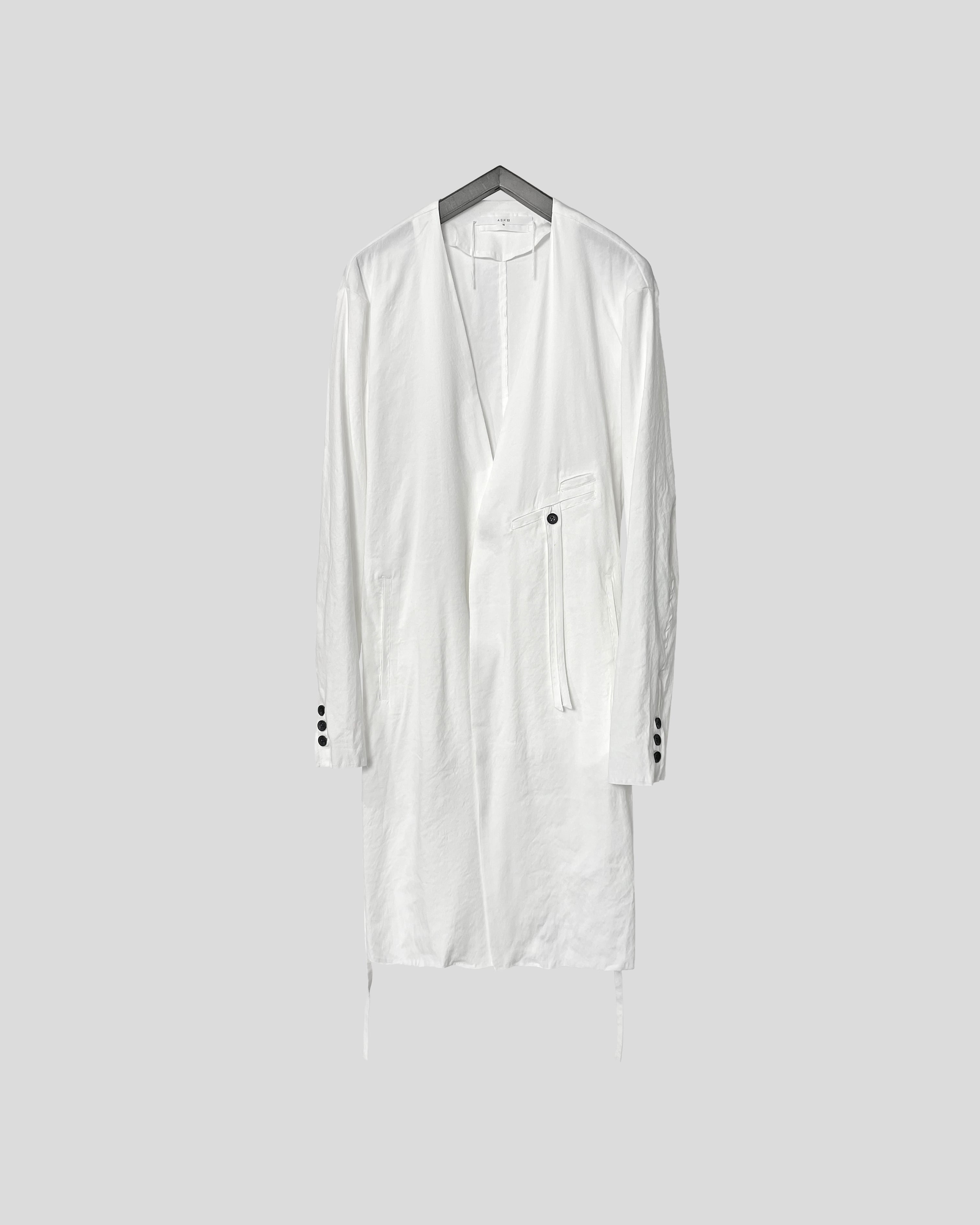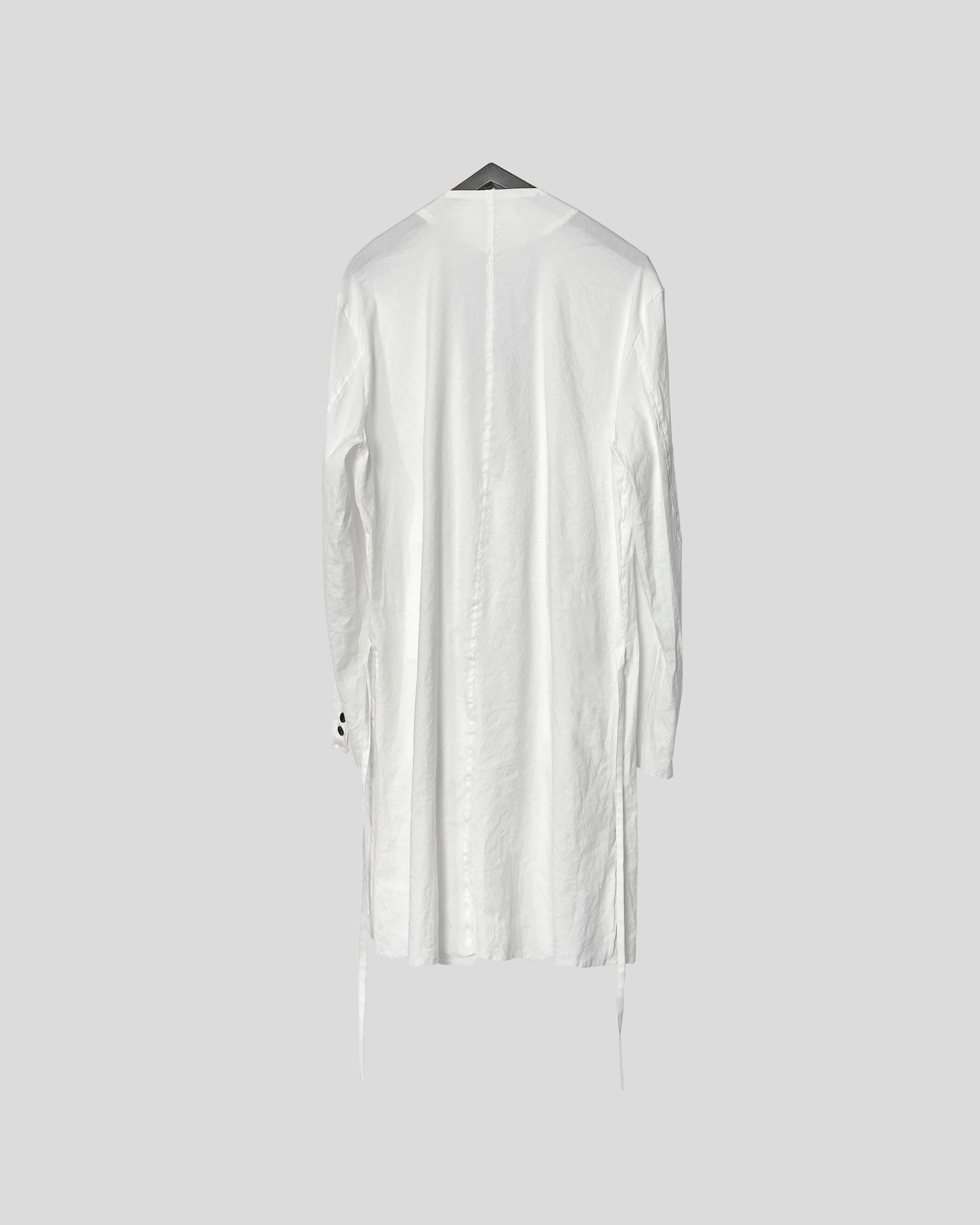 薄手のリネン素材で夏でも蒸し暑くならず軽やかせ清涼な着心地。着用毎にリネン特有のシワが深くなり、垢抜けた渋みのあるスタイルを形成していく。胸元にはアイコニックであるツインコード、腰紐は背面で軽く結ぶことでローブのようなニュアンスも持ち合わせる。また脇線にさりげなく配したホールで内側にも収納可能。裾のみ裁ち切りにすることによりグランジ感を演出し、揺れるコードがそのムードを強調させる。