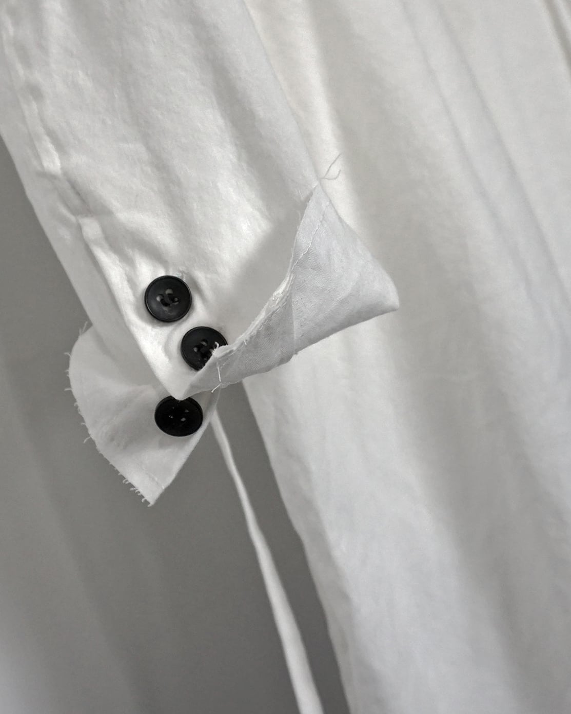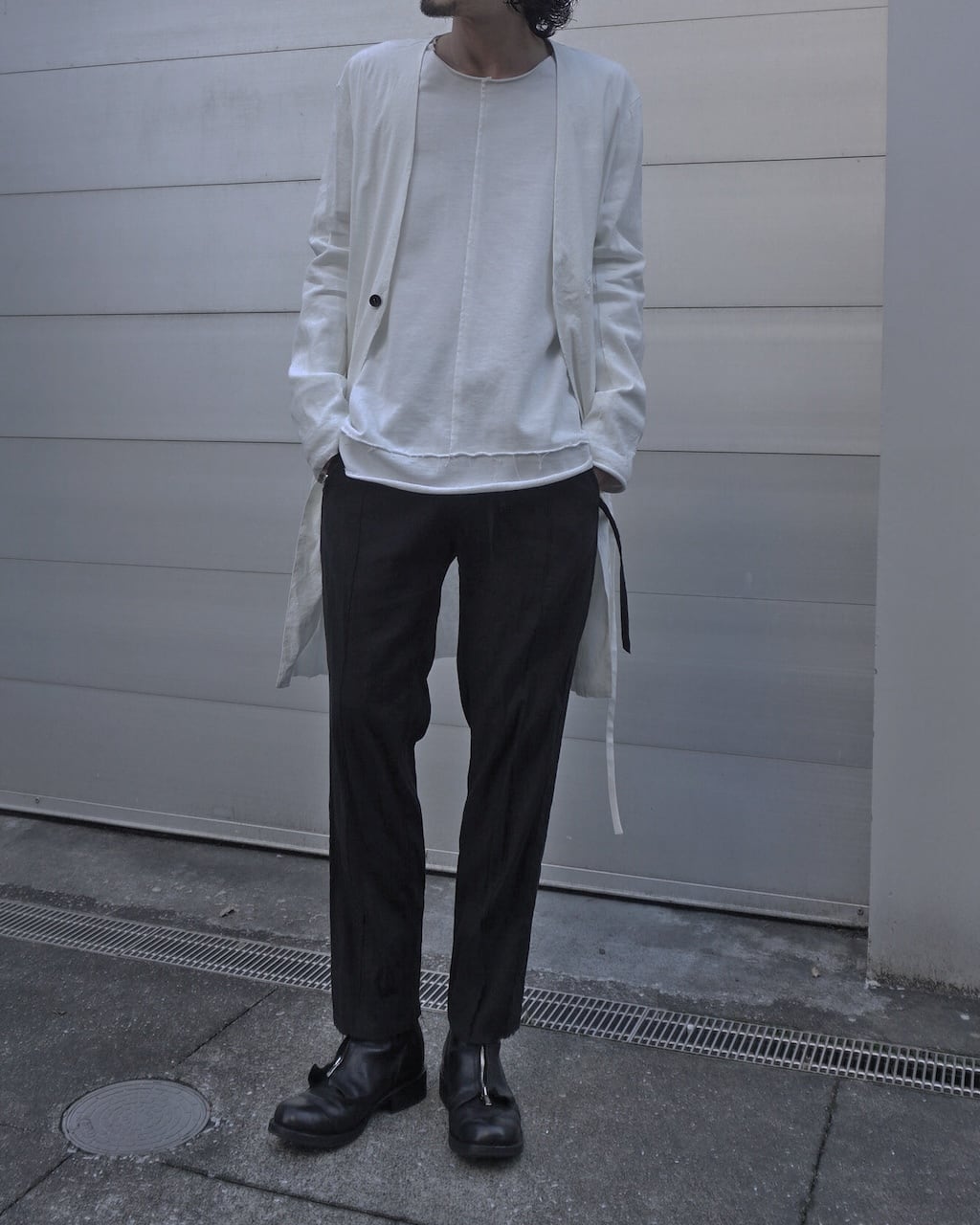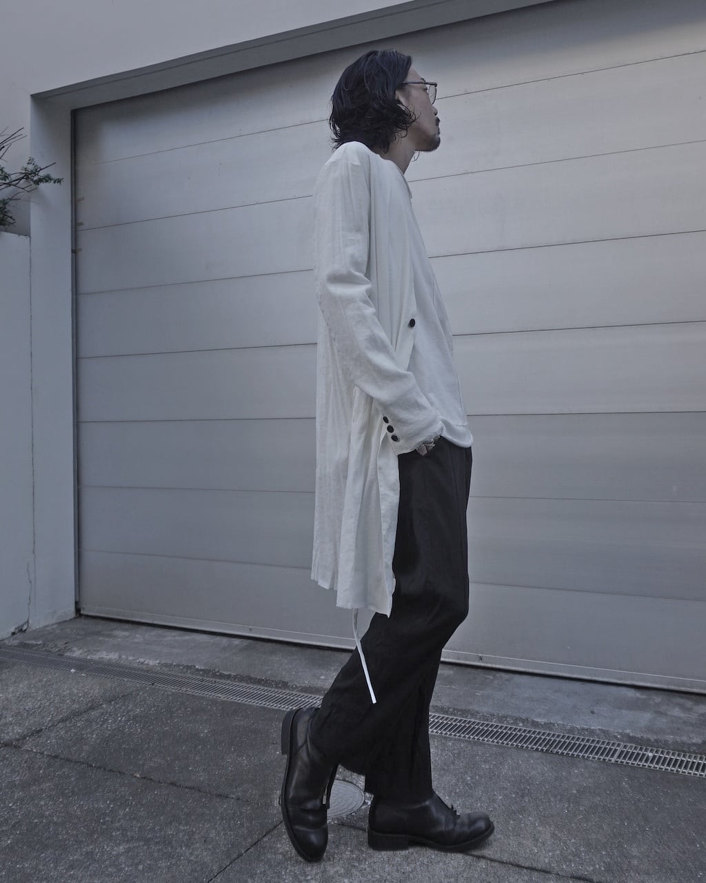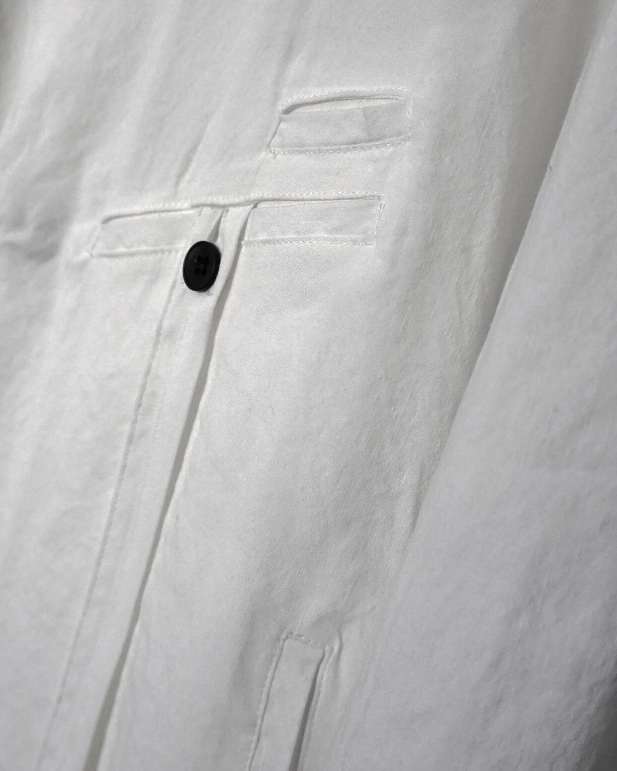 薄手のリネン素材で夏でも蒸し暑くならず軽やかせ清涼な着心地。着用毎にリネン特有のシワが深くなり、垢抜けた渋みのあるスタイルを形成していく。胸元にはアイコニックであるツインコード、腰紐は背面で軽く結ぶことでローブのようなニュアンスも持ち合わせる。また脇線にさりげなく配したホールで内側にも収納可能。裾のみ裁ち切りにすることによりグランジ感を演出し、揺れるコードがそのムードを強調させる。