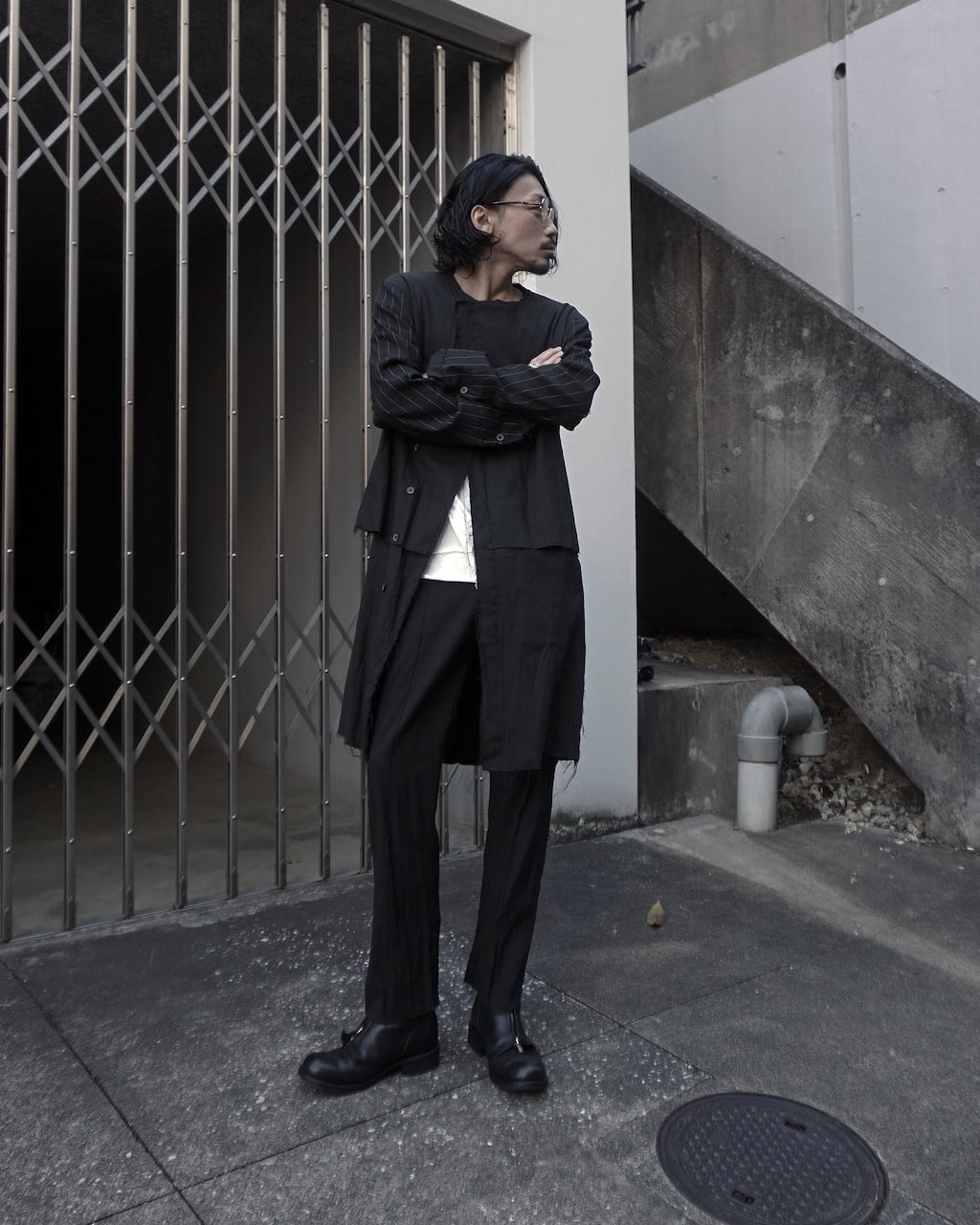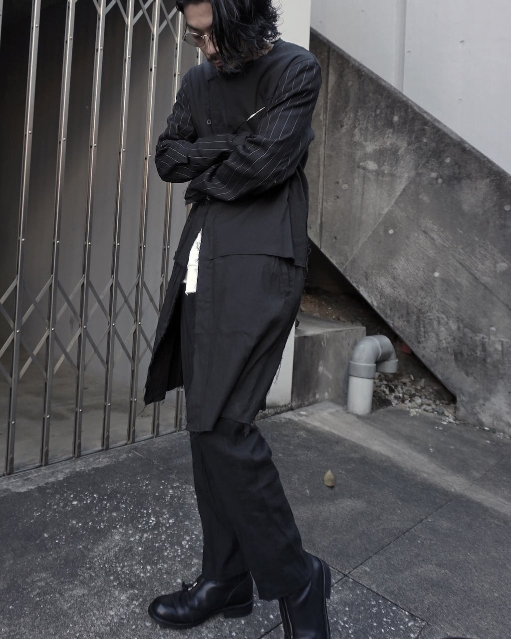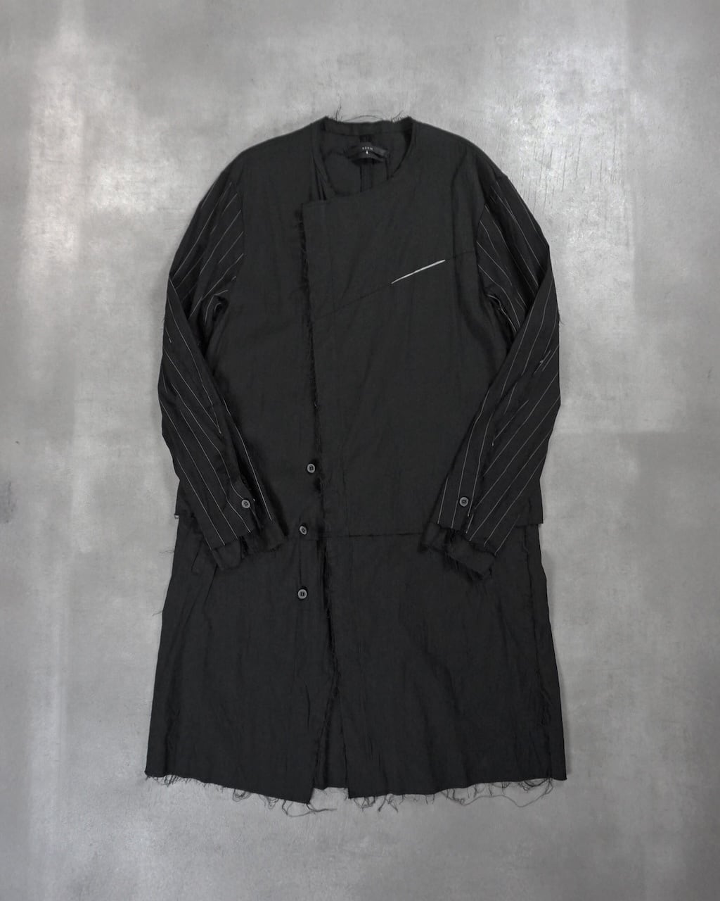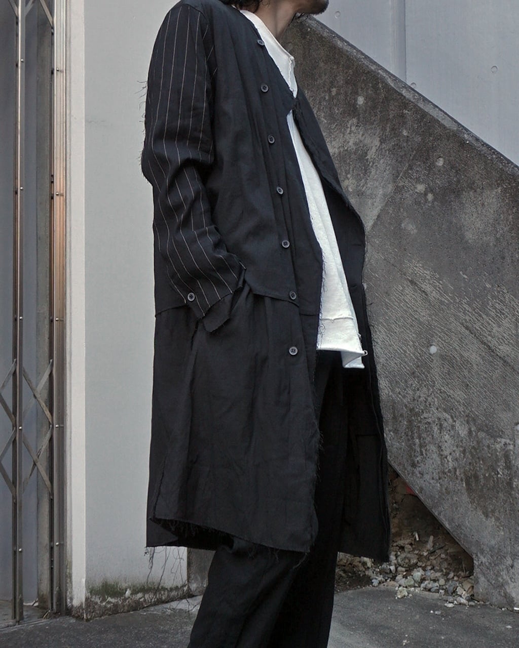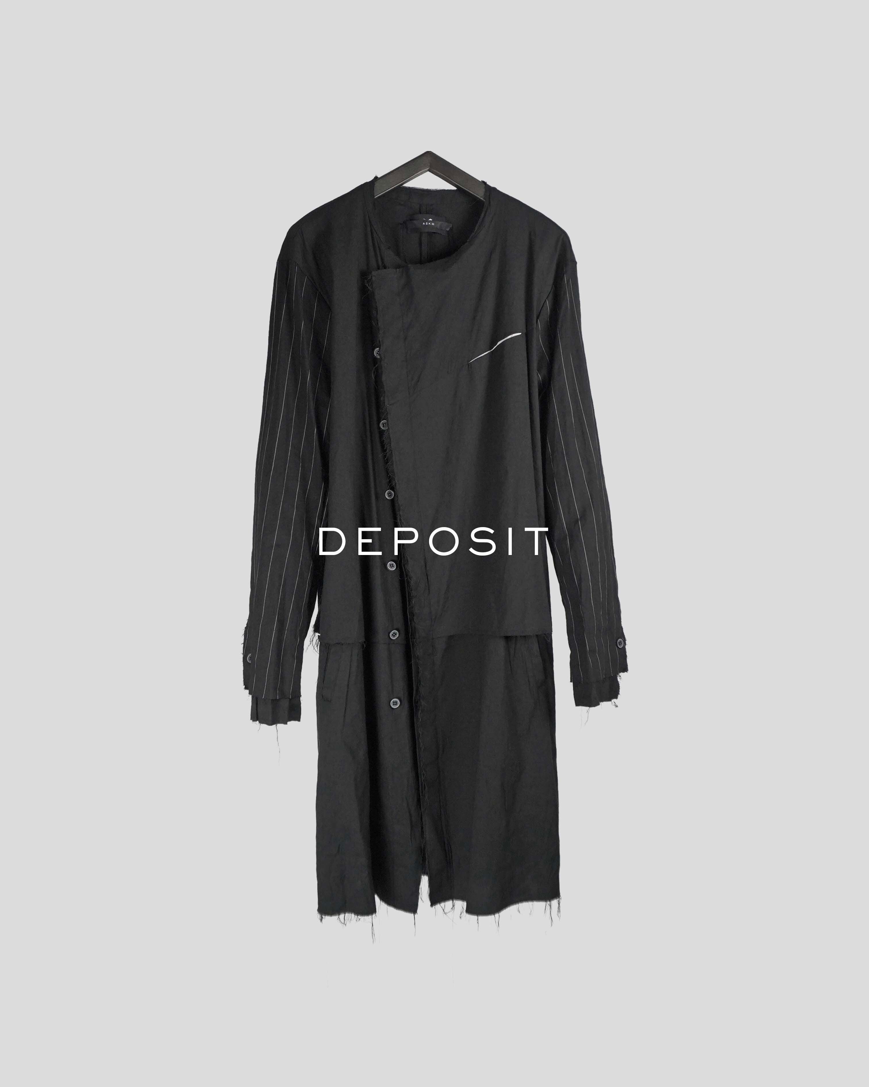 袖生地はストライプに変更され、胸ポケットには白生地にてコントラストを。中世的でアンティークのようなクラフト感は従来の生地では演出できなかった特別仕様。フロントボタンは比翼で隠しミニマルに。袖口はフロント同様にレイヤー仕様であり、スリットは拝みボタンで閉じることが可能。作り込み、生地ともに、プレコレクションの目玉となる作品に仕上げた。