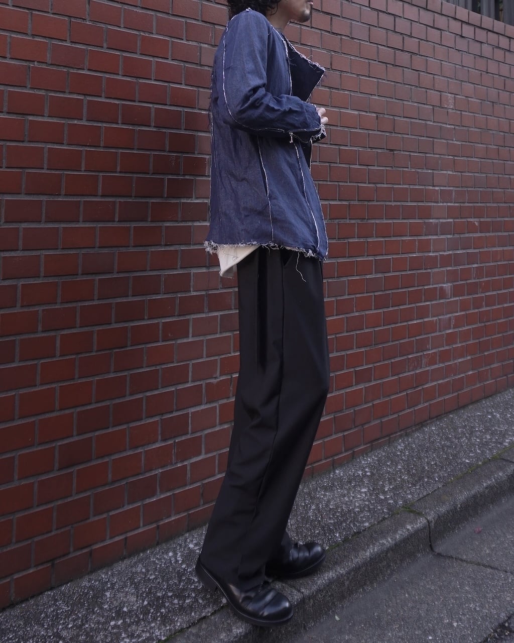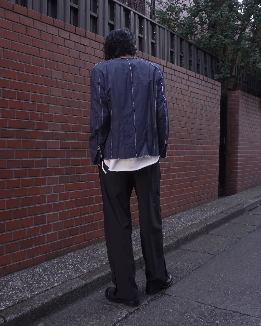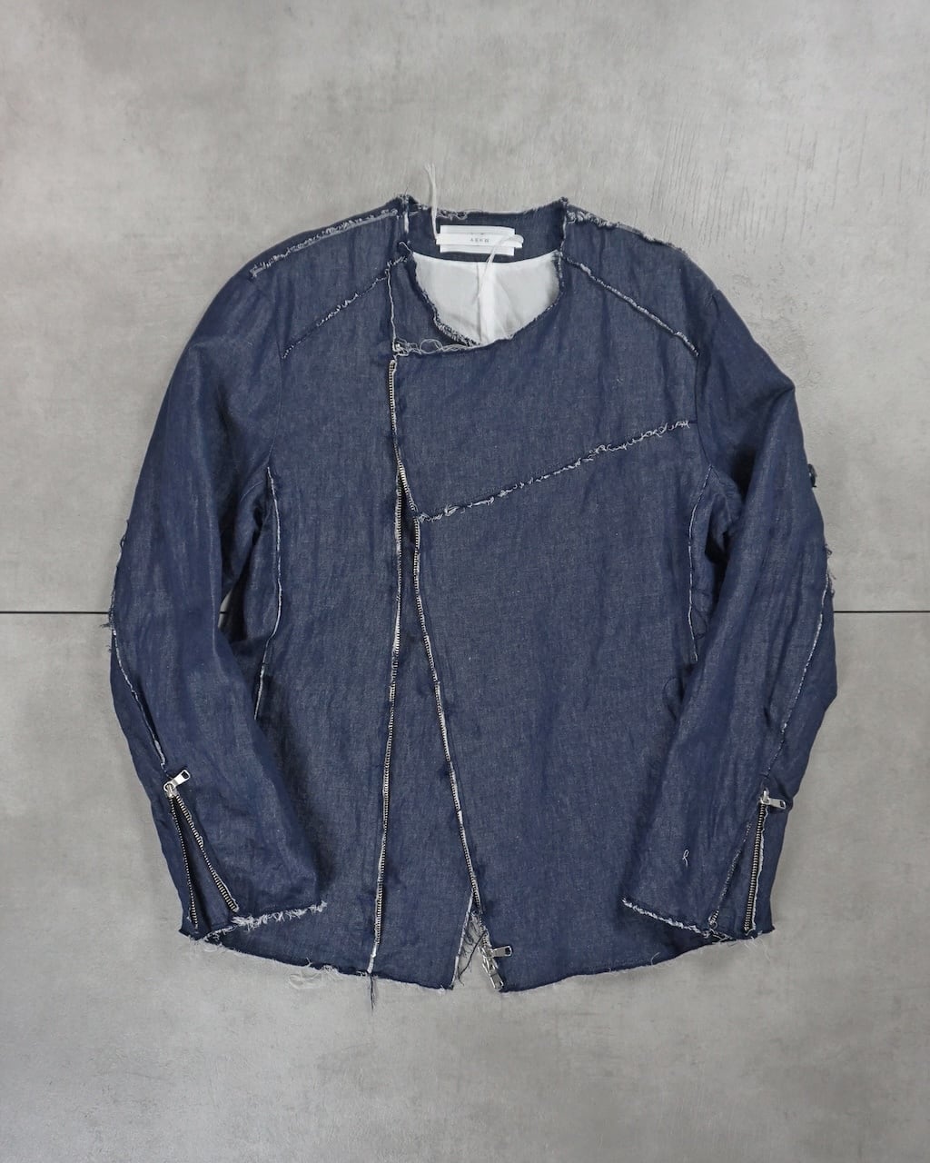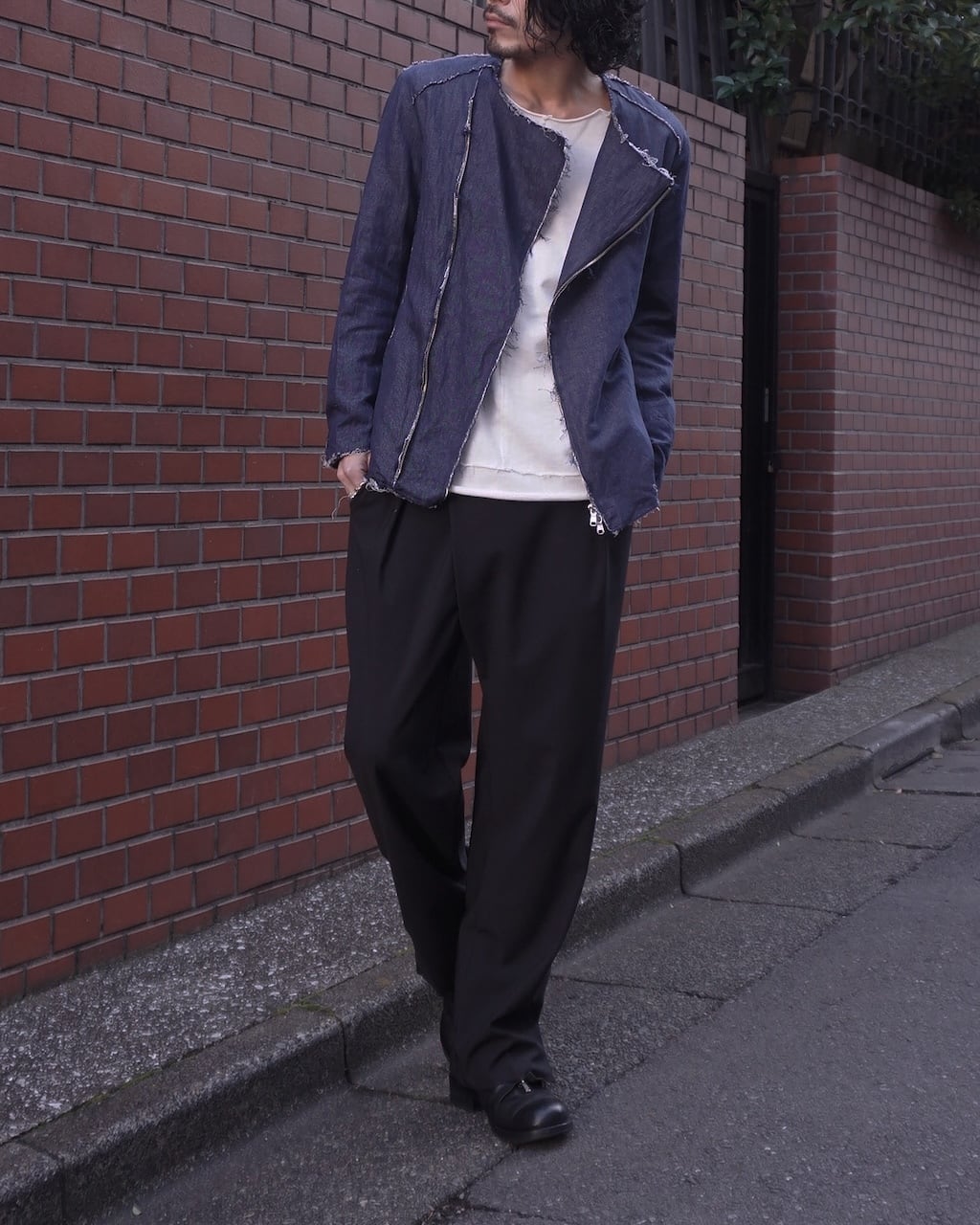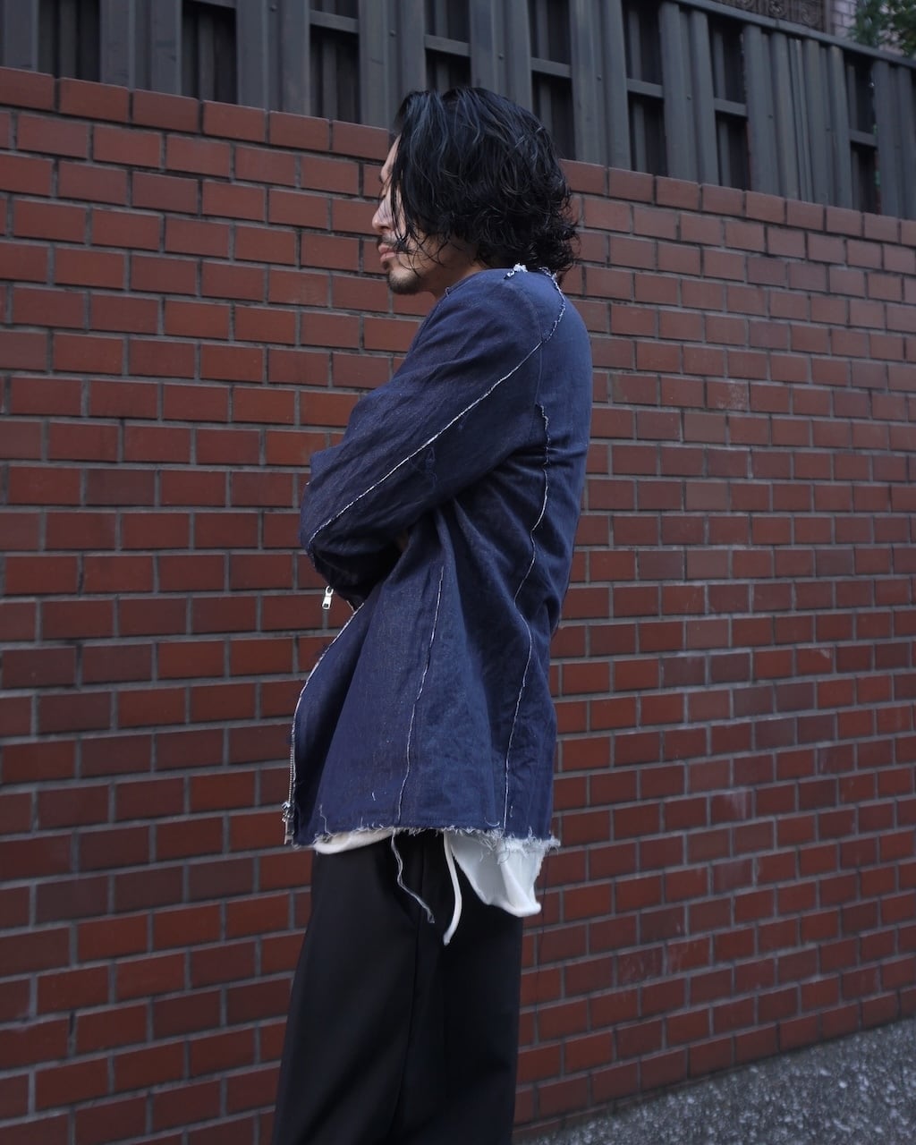 レザーでリリースしてきた定番ダブルライダースをフレンチリネン素材に落とし込んだ夏の薄手デニムライダースジャケット。暑い日に最適な軽量のリネン素材を用いており、リネンならではのグランジ性と退廃性を持ち合わせている。深い経年変化が見込め、着用ごとに小慣れた皺を形成していく。ノーカラーゆえの脱力感は夏のリラックスした気分を解放し、ほつれた糸の吹き出しが渋みと余裕を高める一品。