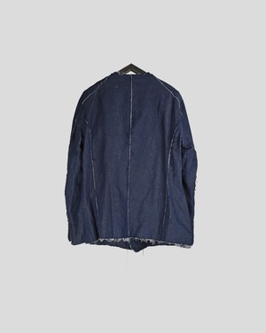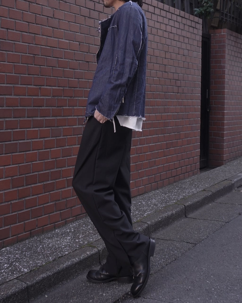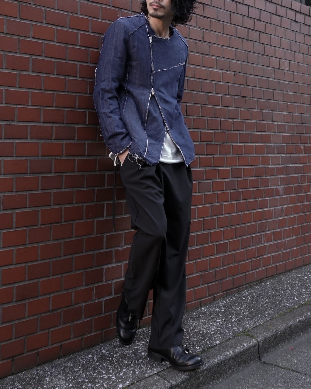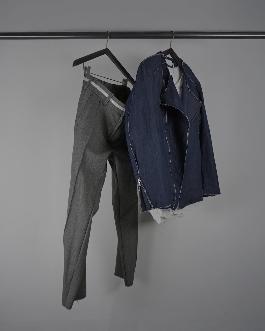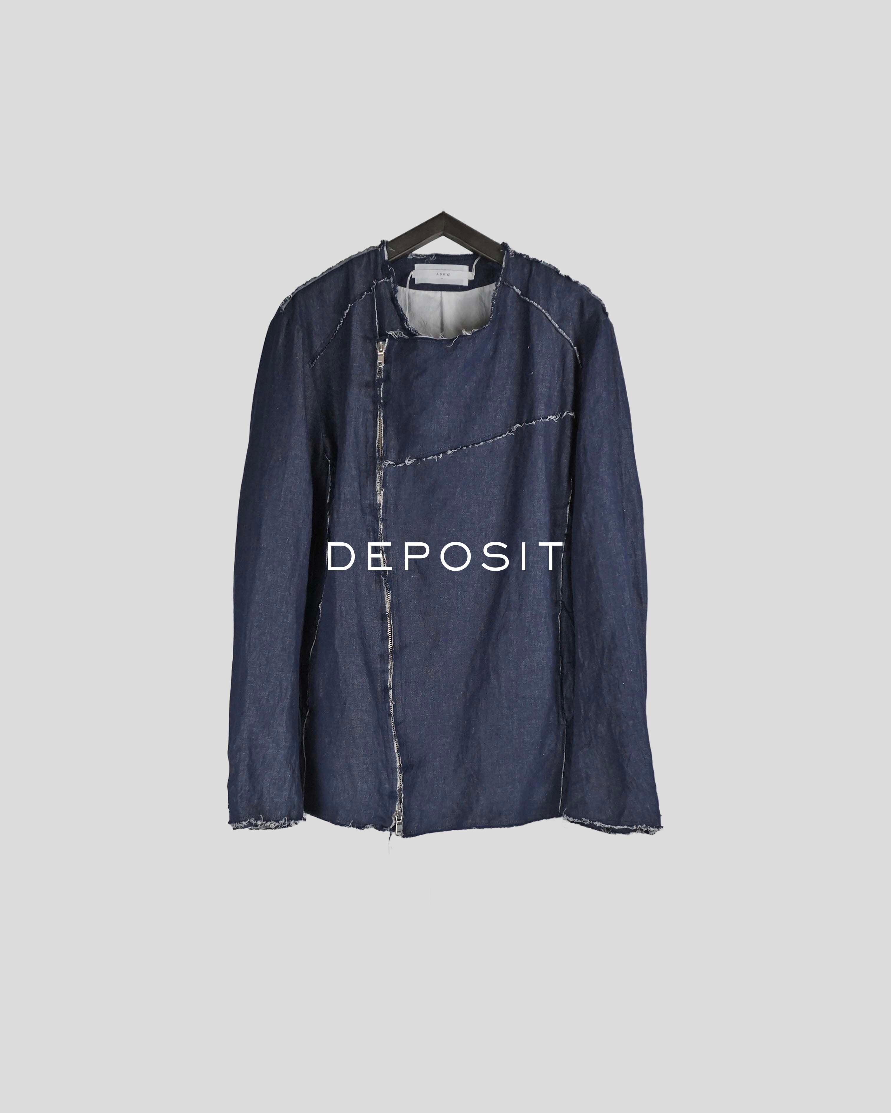 レザーでリリースしてきた定番ダブルライダースをフレンチリネン素材に落とし込んだ夏の薄手デニムライダースジャケット。暑い日に最適な軽量のリネン素材を用いており、リネンならではのグランジ性と退廃性を持ち合わせている。深い経年変化が見込め、着用ごとに小慣れた皺を形成していく。ノーカラーゆえの脱力感は夏のリラックスした気分を解放し、ほつれた糸の吹き出しが渋みと余裕を高める一品。