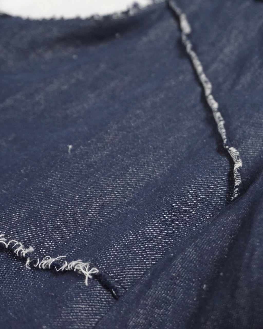 フレンチリネンを交織させたデニム生地。ドライなタッチでサラッとした肌触り。大変軽く、動きやすい。厚みも薄いため、夏でも涼しく快適に着用可能。デニムだけでは表現しきれないリネン特有の色味が差別化を図る。