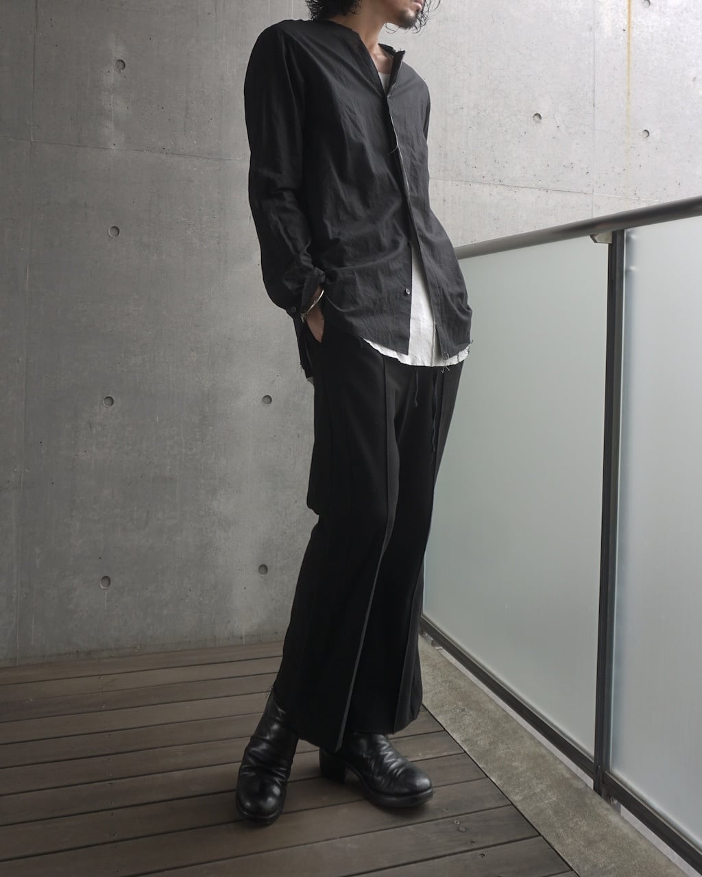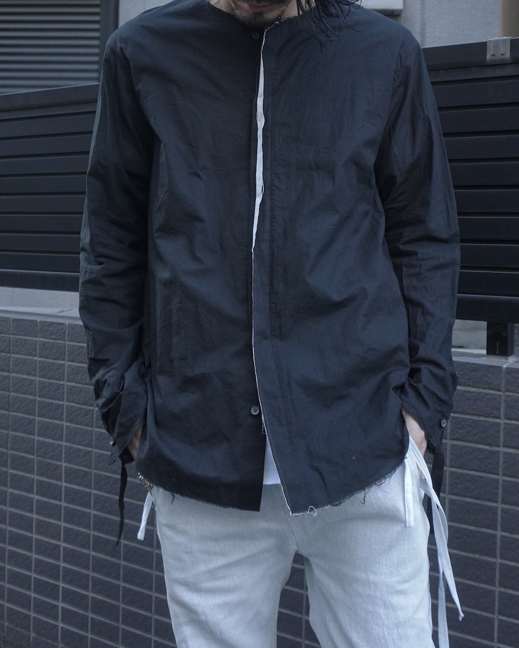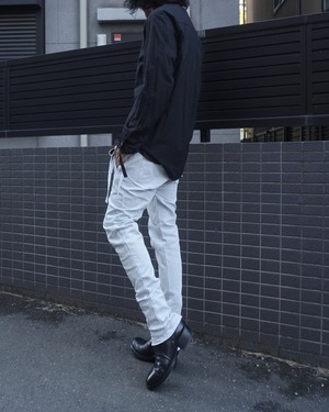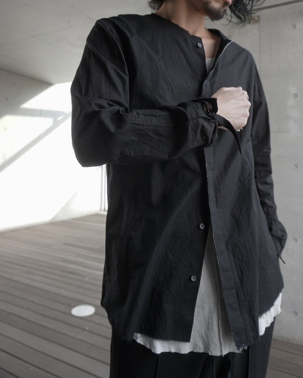 リネン100%に比べてごわつきが抑えられ、ガーゼのような繊細さを持ちながらもしっかりとハリがある。生地自体は薄く、肌にまとわりつかない軽さとドライな爽やかさが特徴。製品後に施した洗い加工で、さらにグランジ感を強調させた。