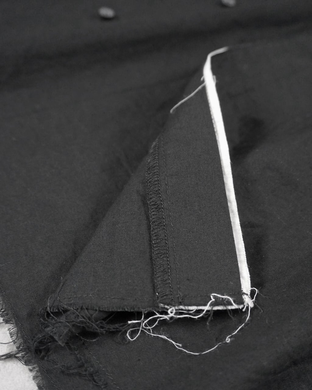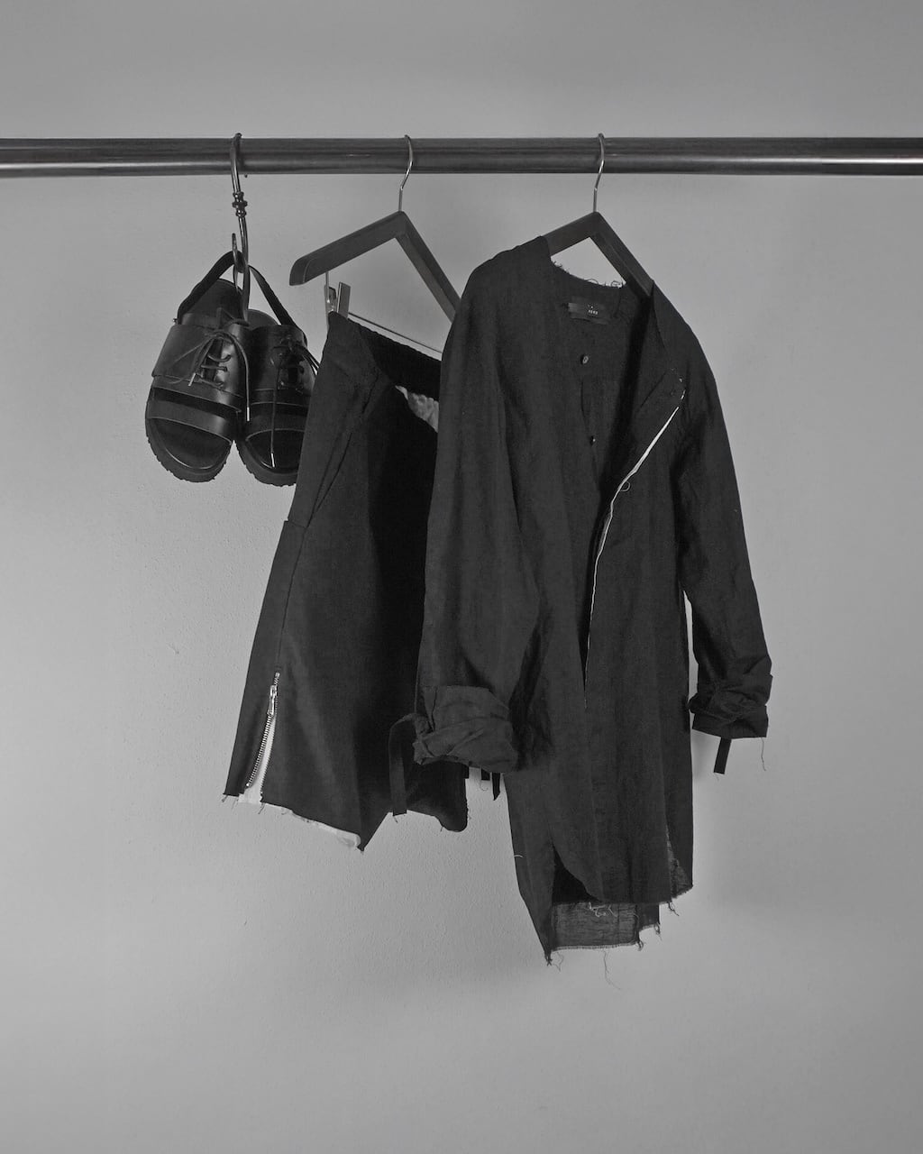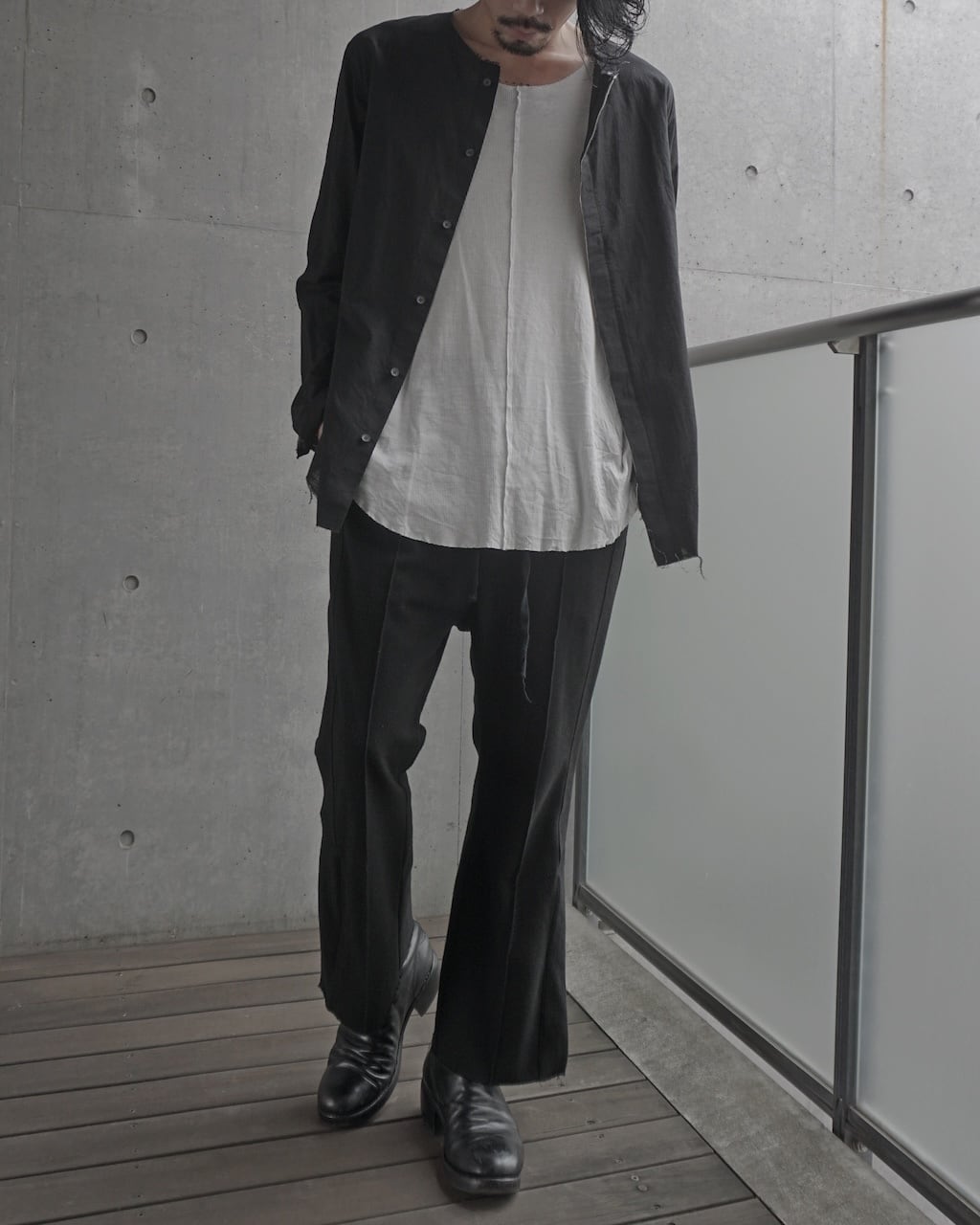 リネン100%に比べてごわつきが抑えられ、ガーゼのような繊細さを持ちながらもしっかりとハリがある。生地自体は薄く、肌にまとわりつかない軽さとドライな爽やかさが特徴。製品後に施した洗い加工で、さらにグランジ感を強調させた。