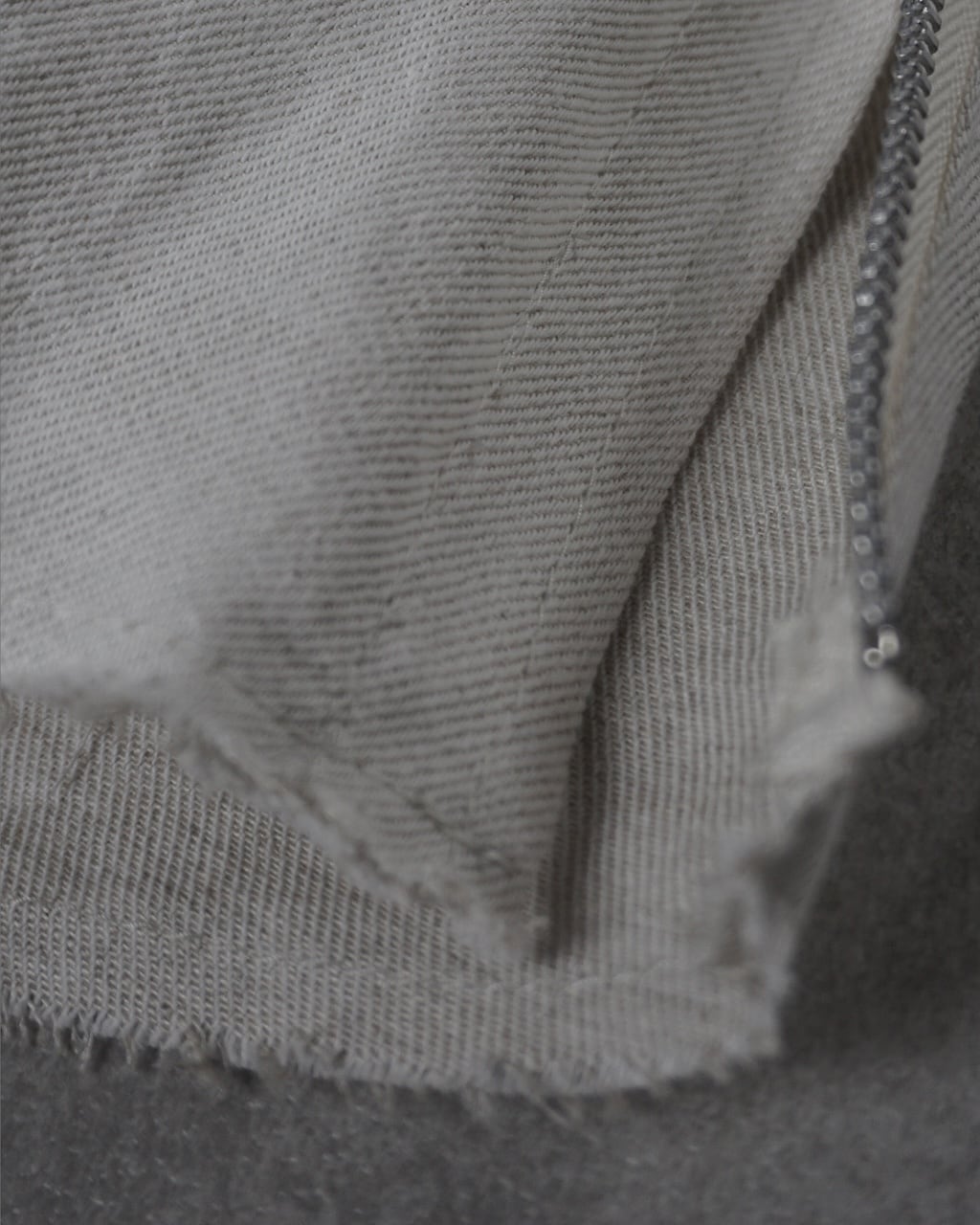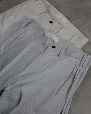 フレンチリネンを交織させたデニム生地。ドライなタッチでサラッとした肌触り。大変軽く、動きやすい。厚みも薄いため、真夏でも涼しく快適に着用可能。デニムだけでは表現しきれないリネン特有の色味が差別化を図る。
