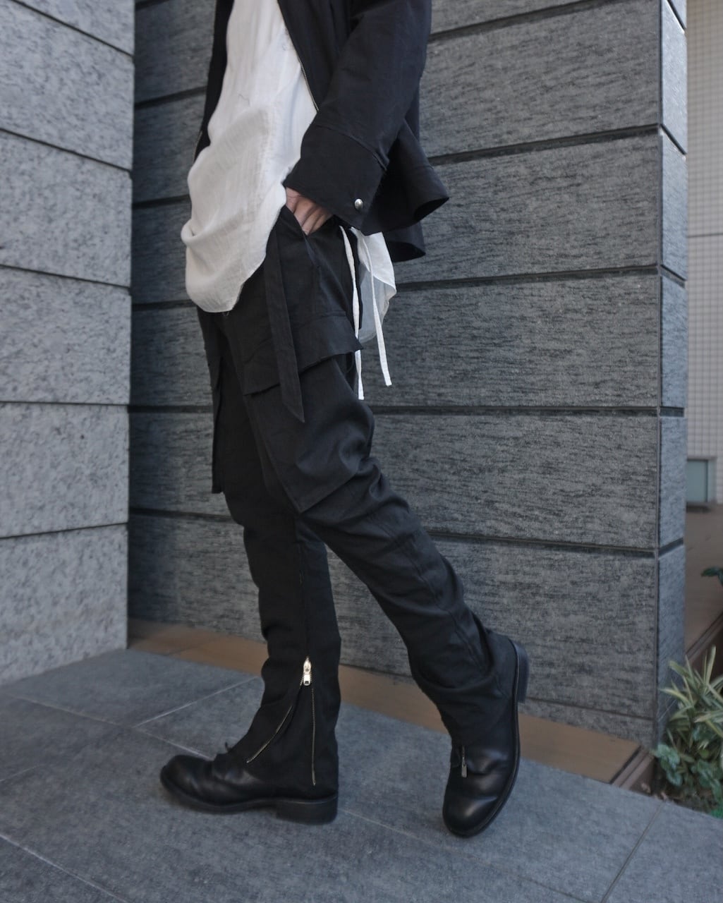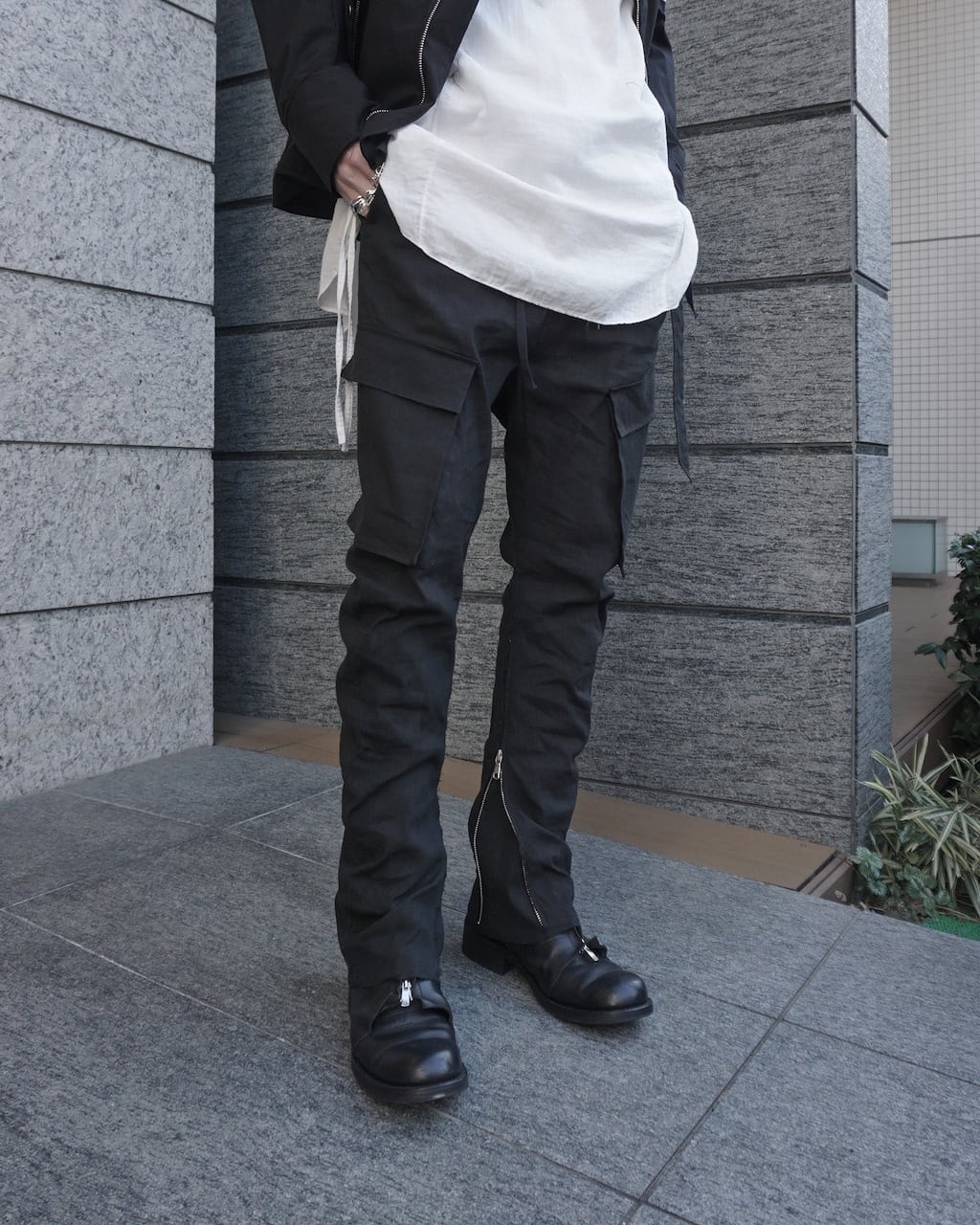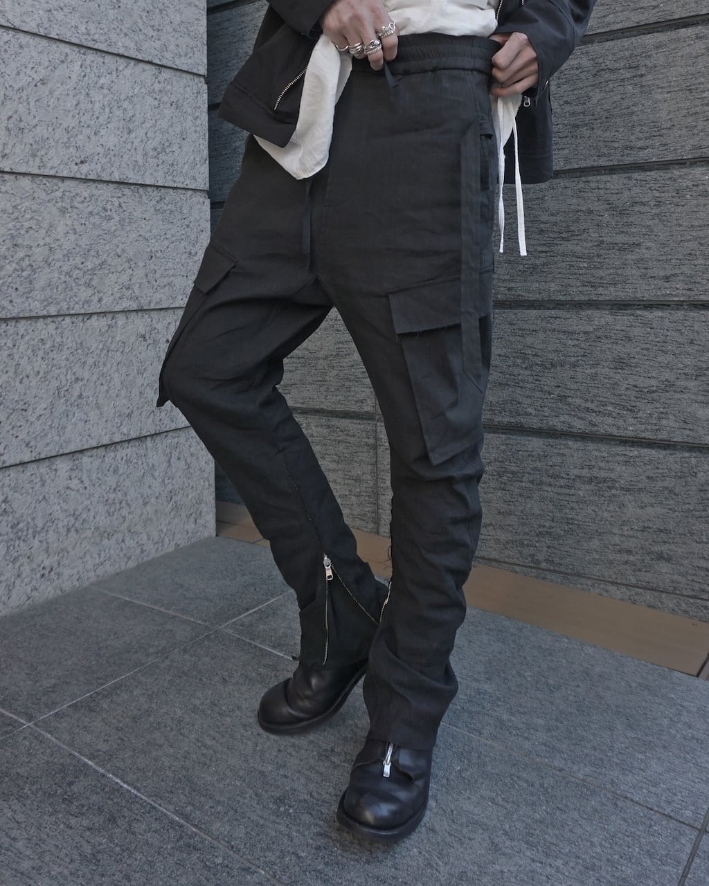 裾には長いジップを備えており、フレアシルエットにも変形可能。左ポケットにはアイコンのストラップを装着。右ポケットのフラップにはY刺繍がさりげなく入る。普遍的なカーゴパンツながらも細部や色味、素材にこだわることで差別化を図っている。