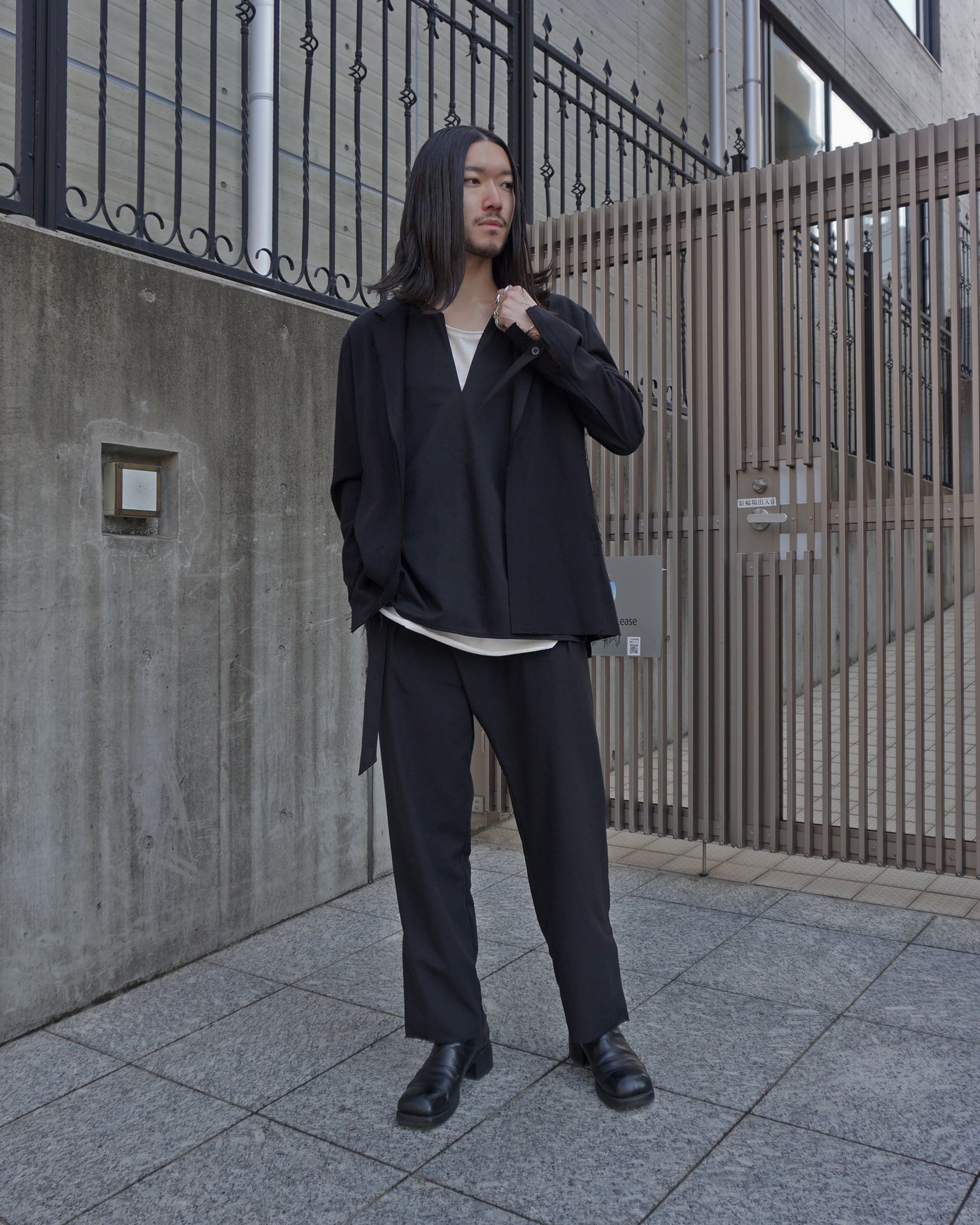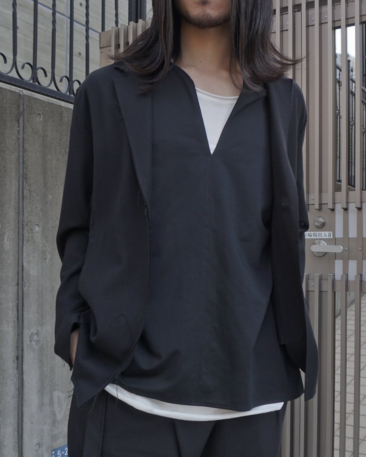コットンリネンを用いた通気性の高いカットソー素材。清涼感も高く、肌触りはサラサラのドライタッチ。しっかりハリがありつつも、伸縮性が高く、それでいて軽量。リネン特有の微光沢が高級感を醸し出す。