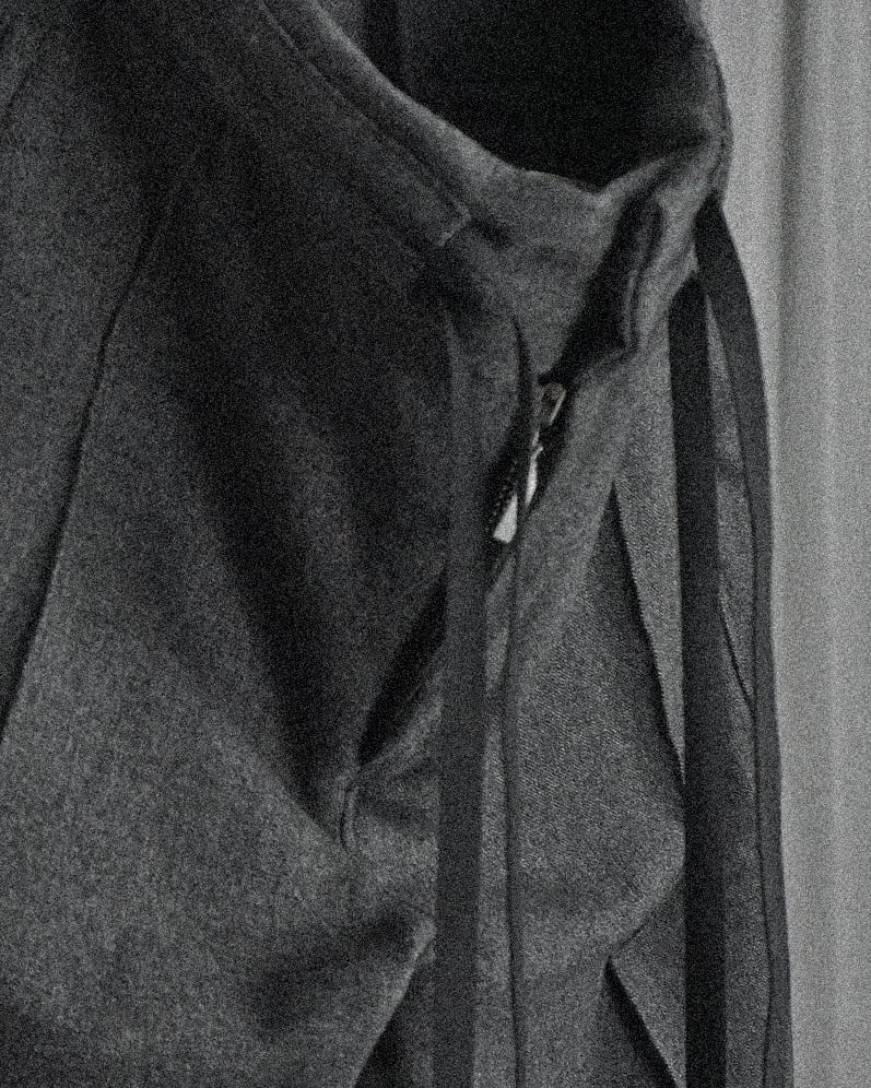 Designed to be worn for years without losing appeal, these slacks are finished in a minimal style. Yet, details such as pintucks that emphasize vertical lines for an elegant silhouette, and side stripes expressed through stitching to avoid an overly casual look, show the meticulous attention to detail.The standout feature is the waist cord that looks almost like it was added afterwards. Crafted from faux leather–like material, they offer the refined structure of slacks with the comfort of relaxed wear. Carrying over the signature details of the 23SS Ribbon Pants, this piece becomes an iconic item true to the brand.