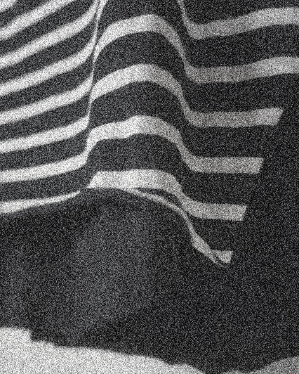 The body is constructed with a double-layered front panel to reduce transparency while maintaining lightness. The outer layer features stripes, paired with a solid inner layer, allowing the piece to stand on its own as a statement even when worn alone. Raw-cut edges create a minimal, compact appearance, and the sleeves are intentionally folded and secured at the cuffs to give a slightly rough, effortless character.