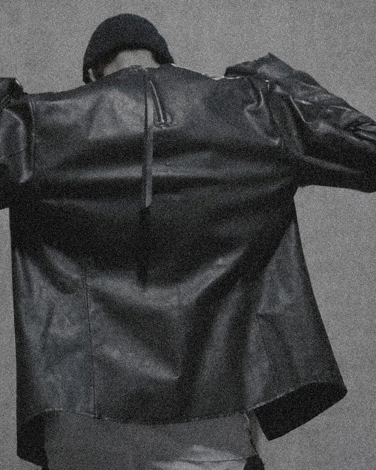 Long zippers are installed along the stitching that runs from the shoulders to the cuffs, reinforcing its minimal, industrial aesthetic. The hem is softly rounded, and the neckline rises with a balanced structure that frames the collar naturally.