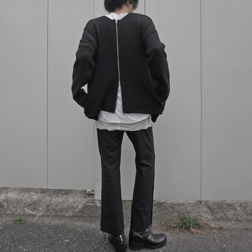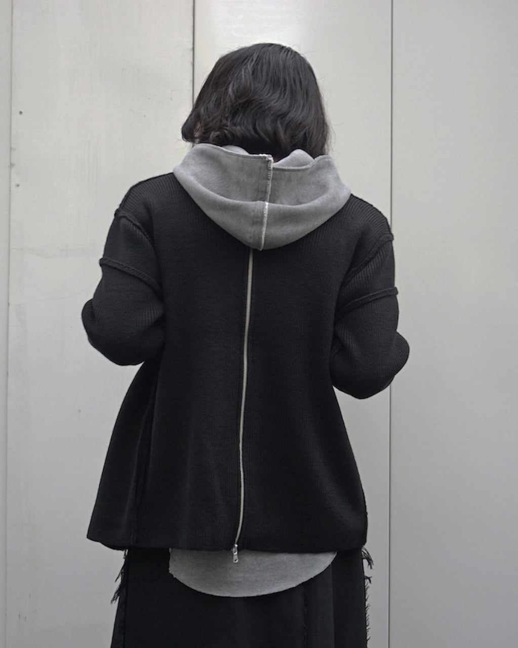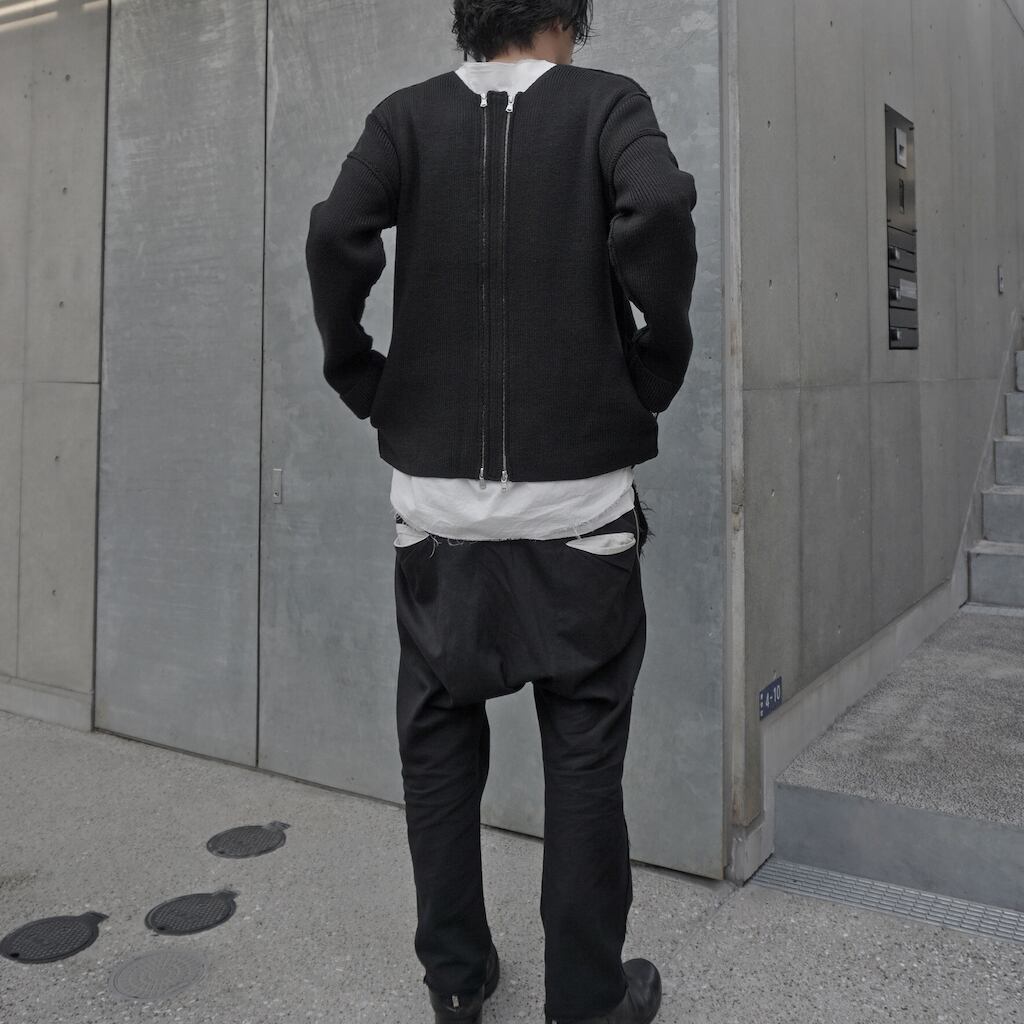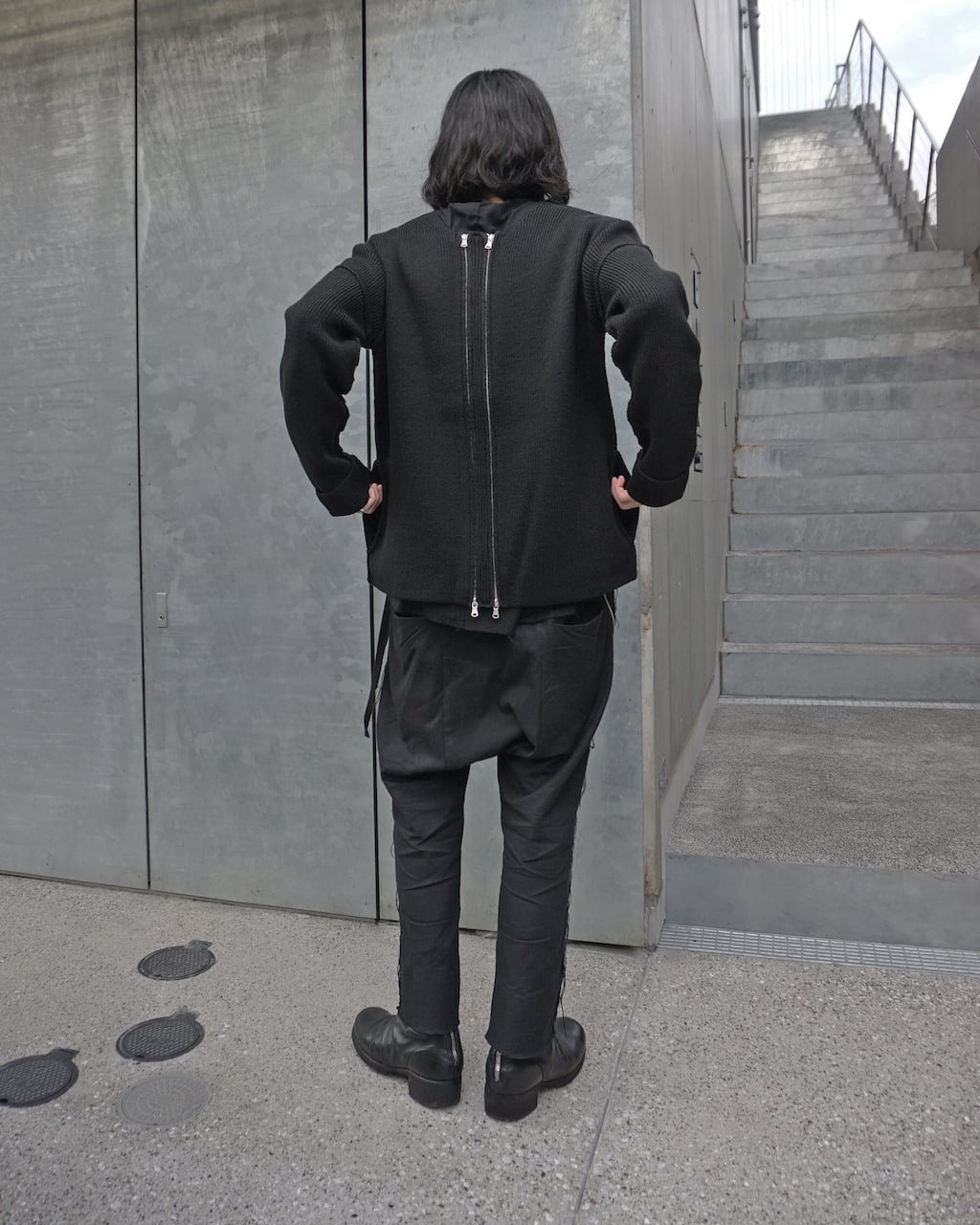 ファスナーのムシ隠しをすることで主張を抑えた前面のツインジップ、ムシを敢えて隠さずにシルバーを見せることでニットとのコントラストを出した背面のシングルジップ。スタイリングによって使い分けを楽しんで頂ける作品。ツインジップの中央パネルは取り外しが可能な為、前後双方シングルジップとしても着用可能。