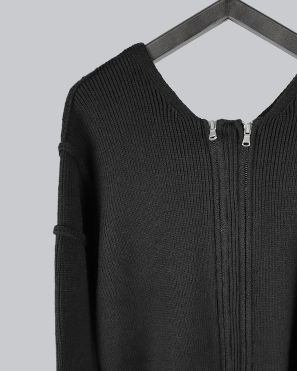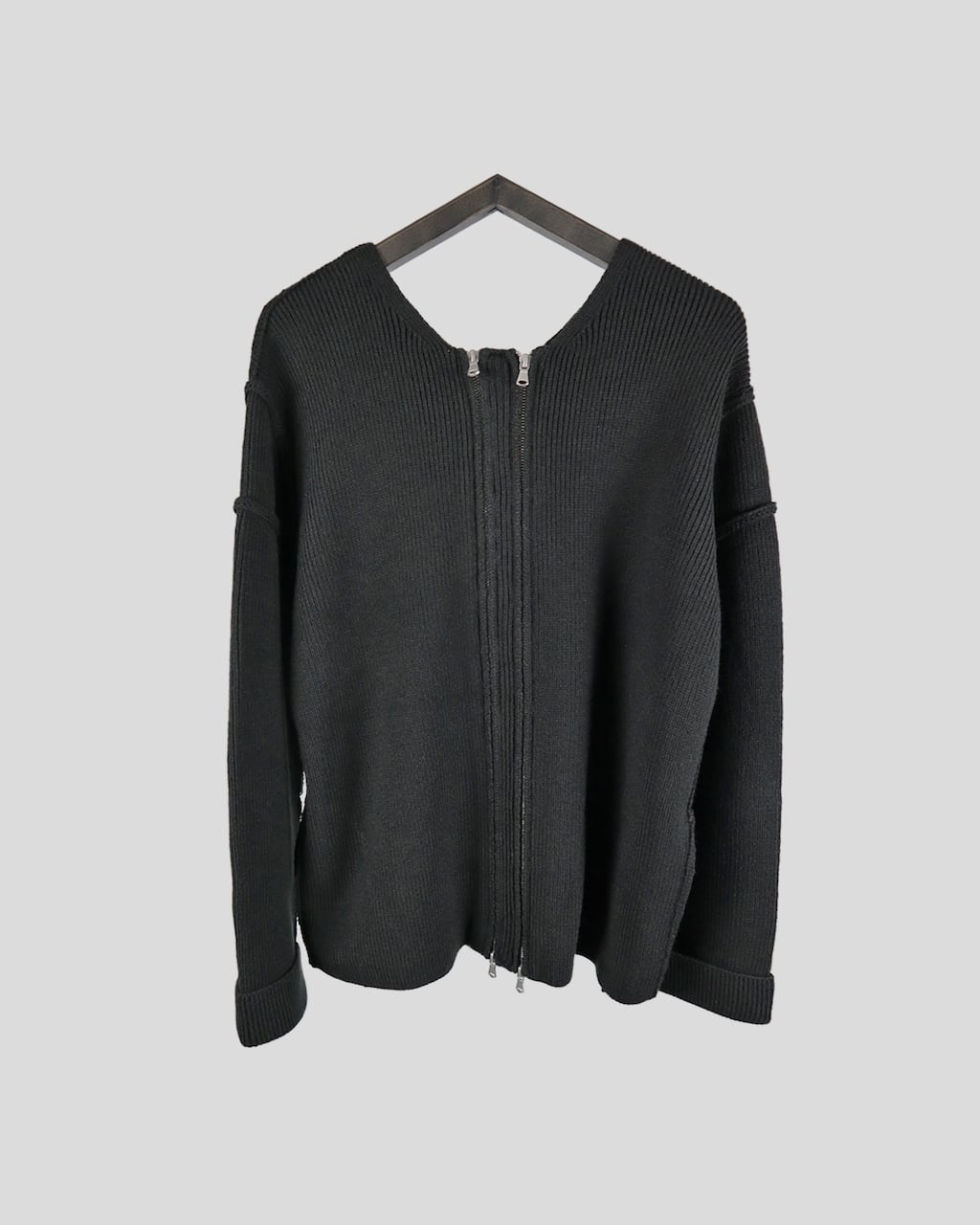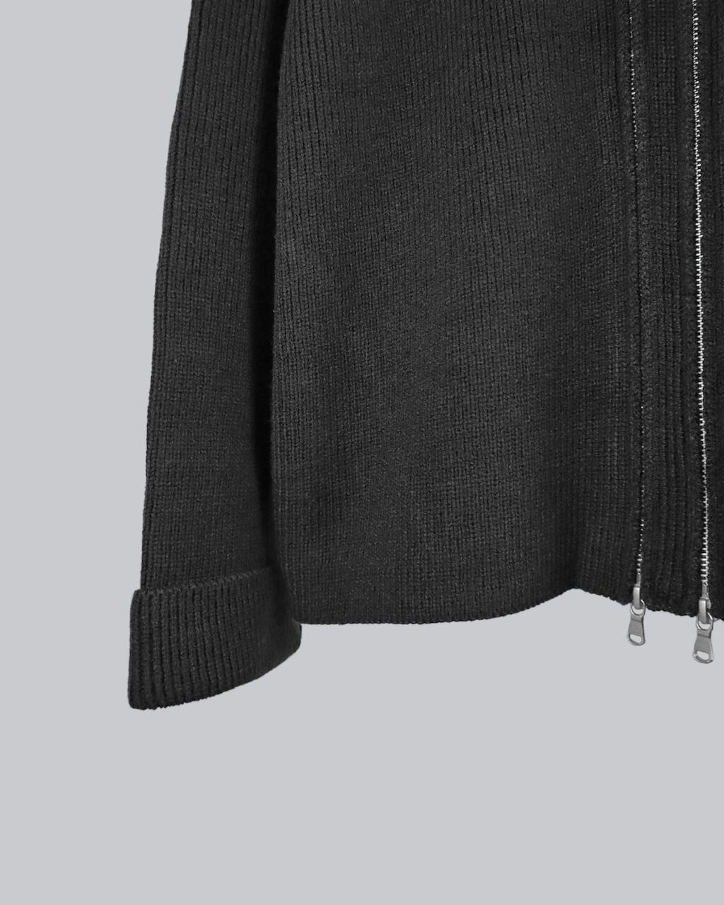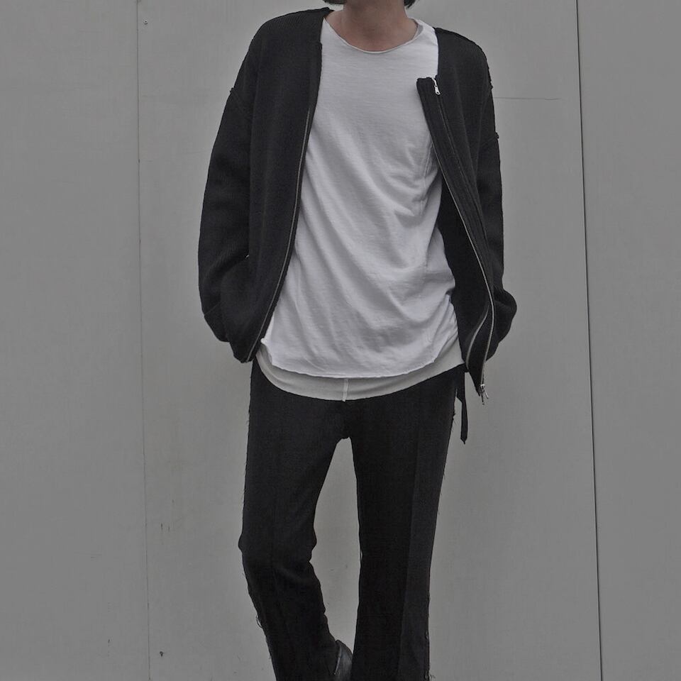 ファスナーのムシ隠しをすることで主張を抑えた前面のツインジップ、ムシを敢えて隠さずにシルバーを見せることでニットとのコントラストを出した背面のシングルジップ。スタイリングによって使い分けを楽しんで頂ける作品。ツインジップの中央パネルは取り外しが可能な為、前後双方シングルジップとしても着用可能。