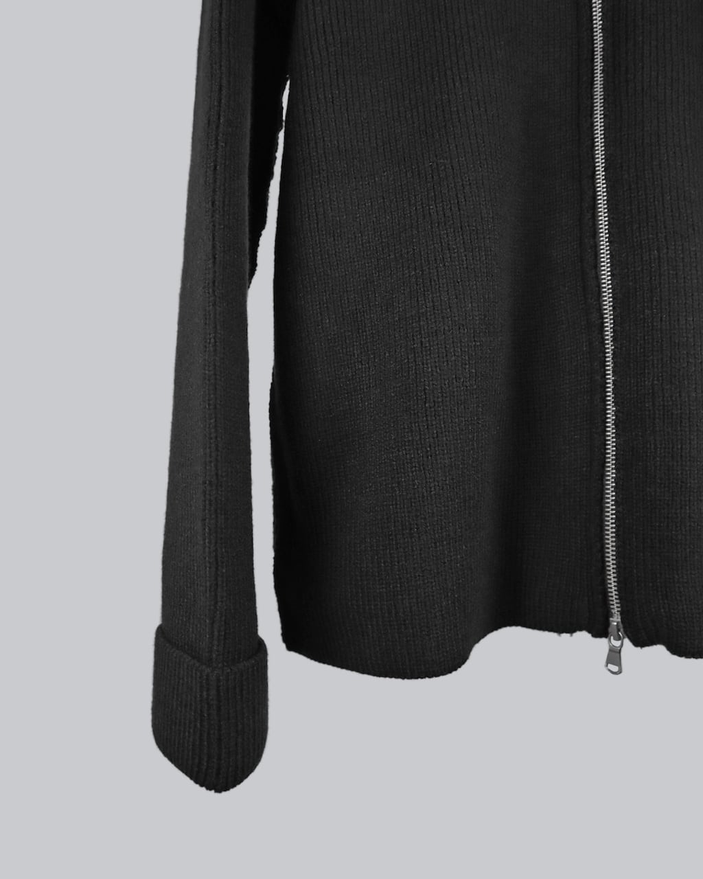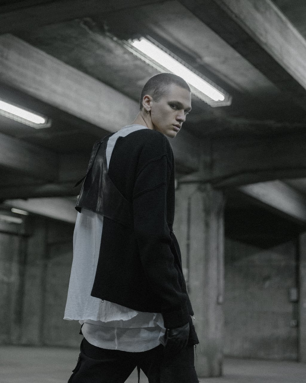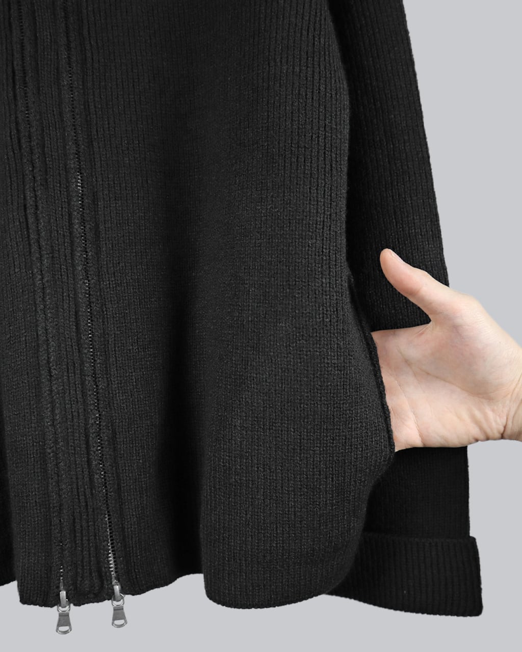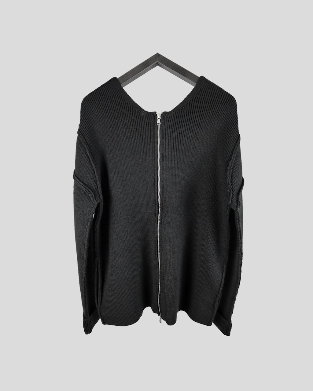 ファスナーのムシ隠しをすることで主張を抑えた前面のツインジップ、ムシを敢えて隠さずにシルバーを見せることでニットとのコントラストを出した背面のシングルジップ。スタイリングによって使い分けを楽しんで頂ける作品。ツインジップの中央パネルは取り外しが可能な為、前後双方シングルジップとしても着用可能。