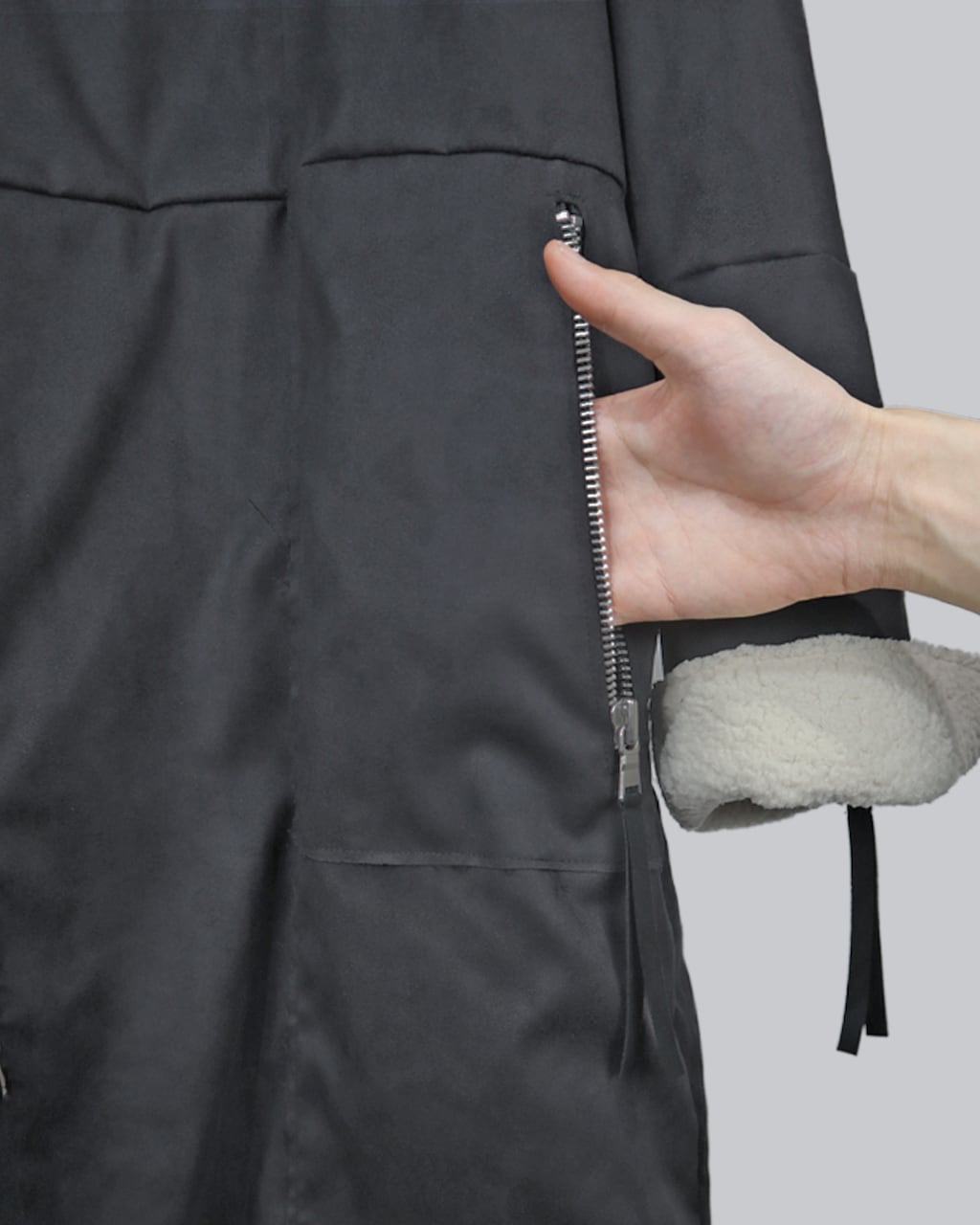 また、デザインとして折り返された袖口、ジップポケット、裾や肩のデザインなど細部までこだわり抜いた作品。