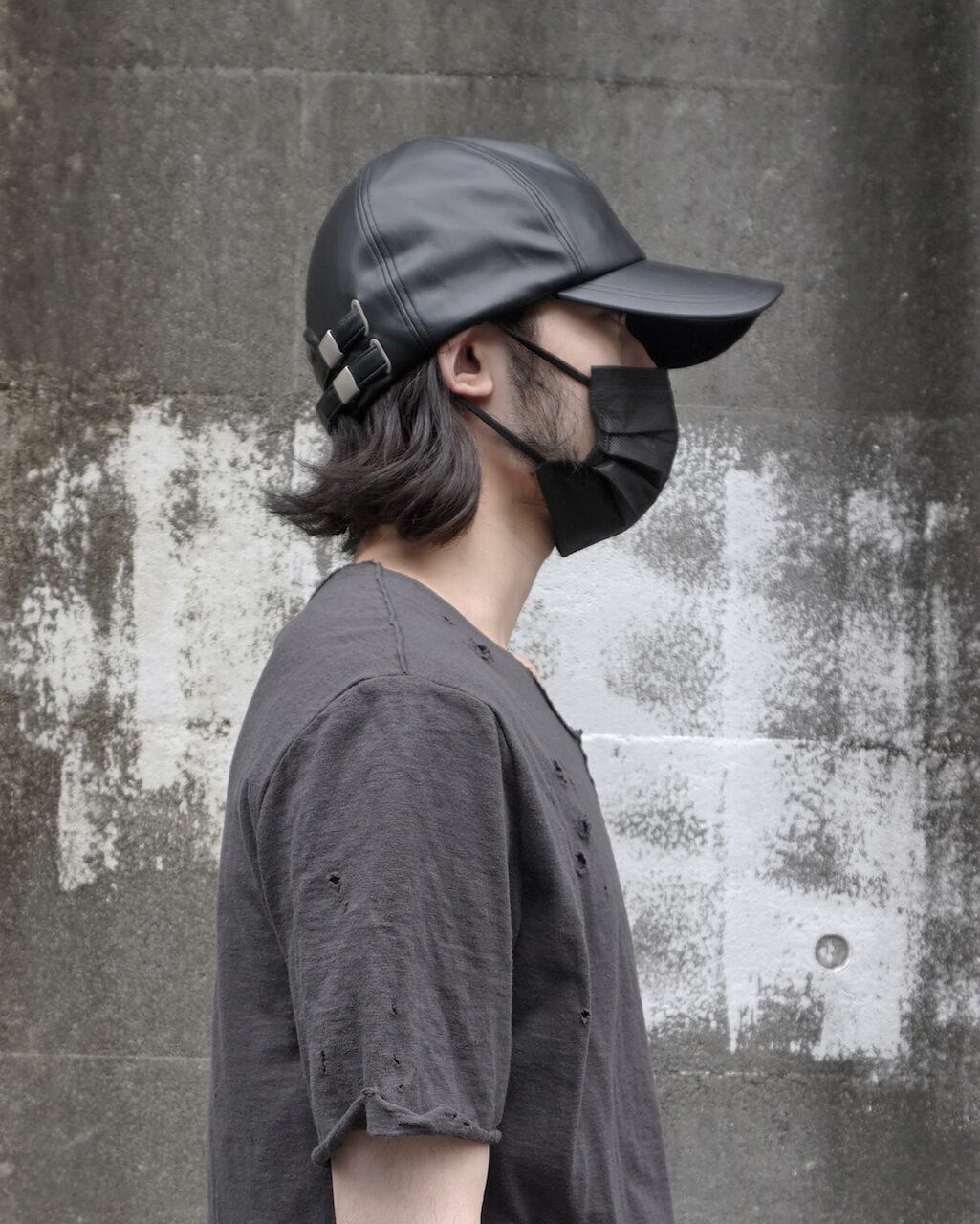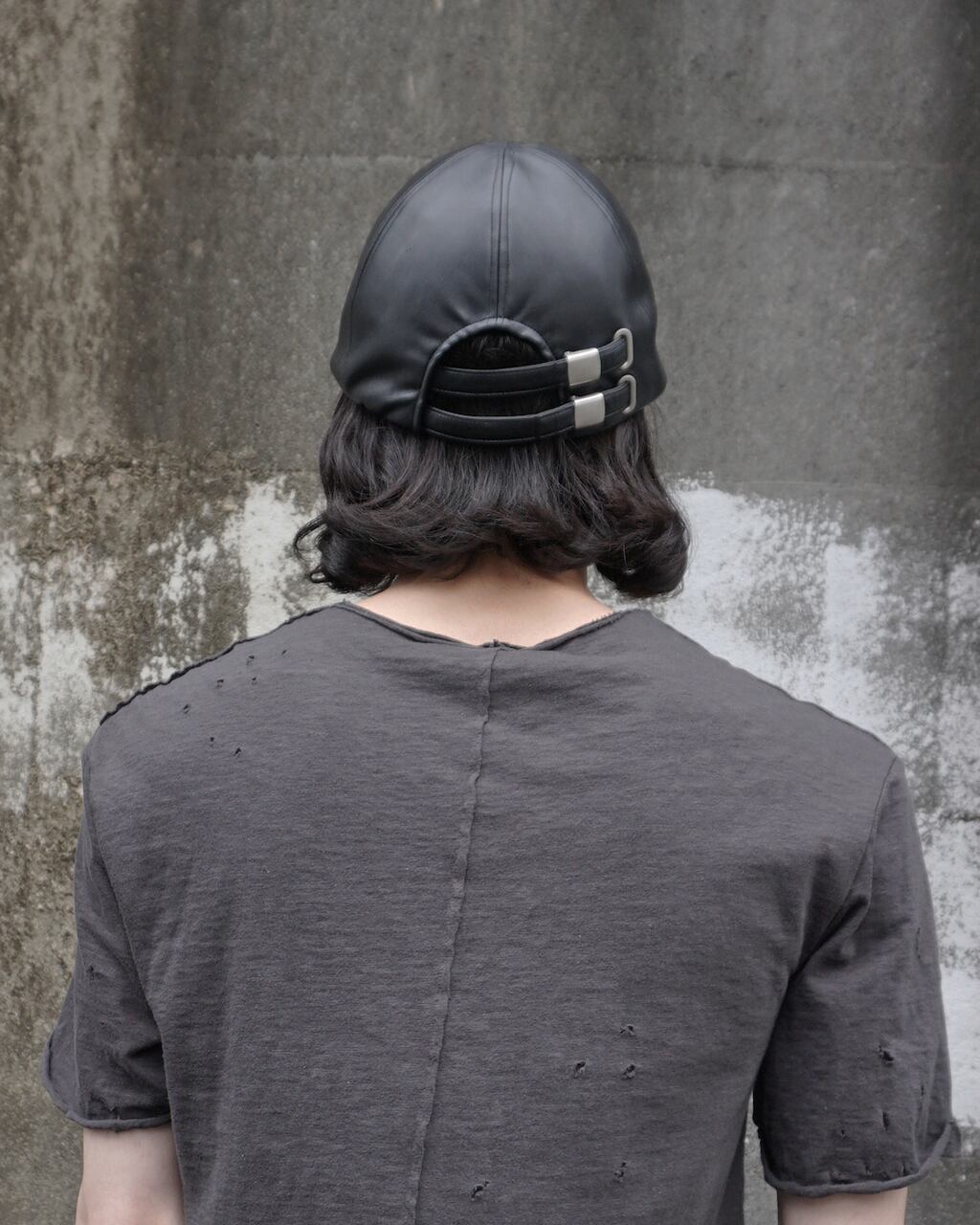 後頭部にはASKYYのアイコンであるツインベルト。服がシンプルな場合のアクセントに。ベルトを垂らさずに収納する場合は本体とスベリの間に収納可能。肌にあたるスベリ部分を太めの設定にしているため収まりがよい。バックルなど各パーツは燻加工済み。