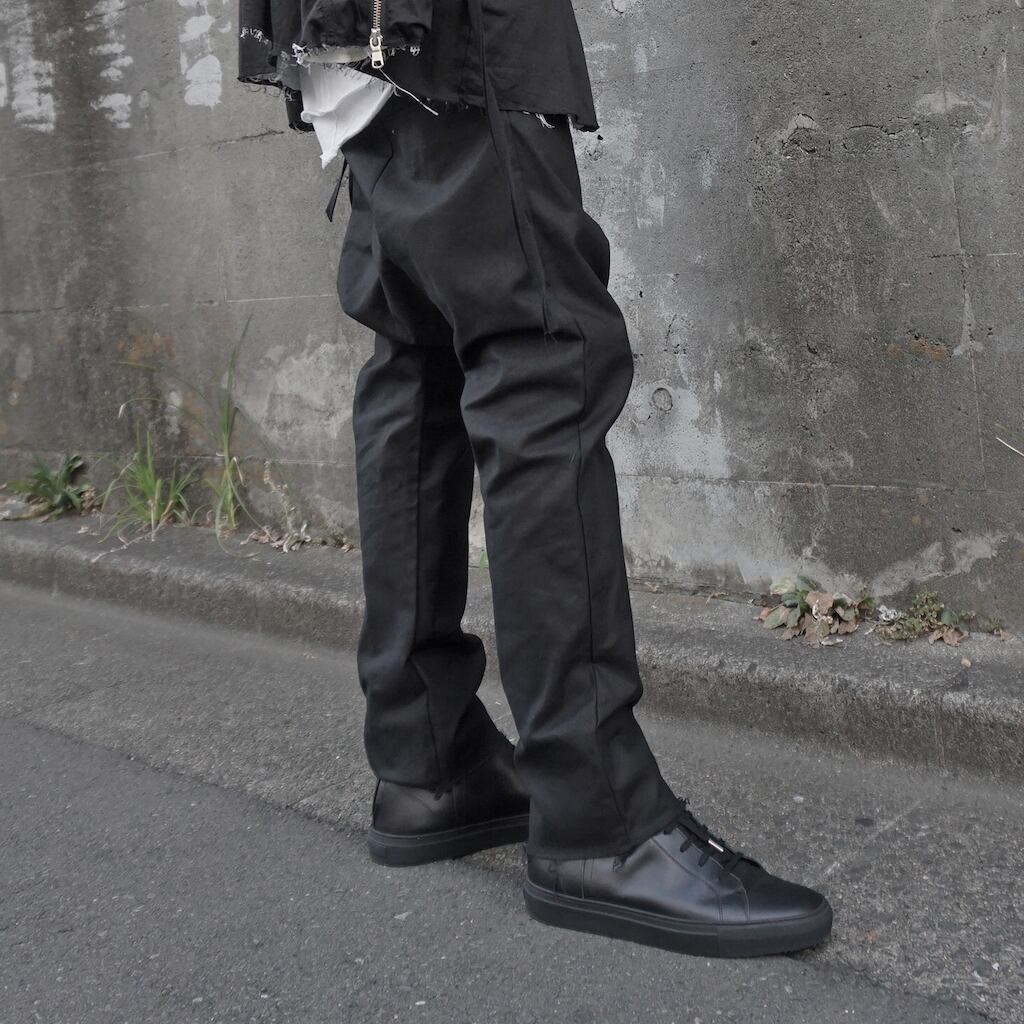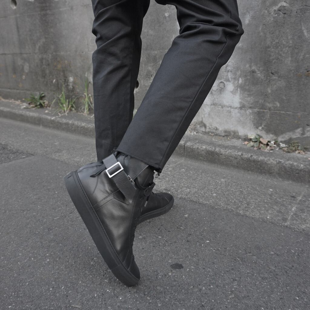 ASKYY初となるスニーカー。アッパーの後面をレイヤードさせ、本体を包み込むようにしたデザイン。履き口にわずかなズレを作ることでクラフト感のある仕上がり。側面についたベルトストラップは前面、後面の双方に留めることが出来るようにし、その時のスタイリングによってアレンジを可能にする。