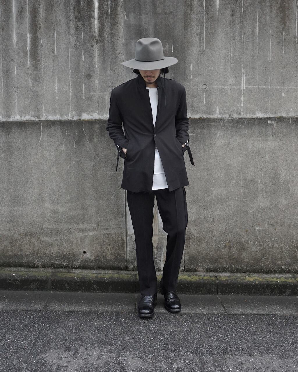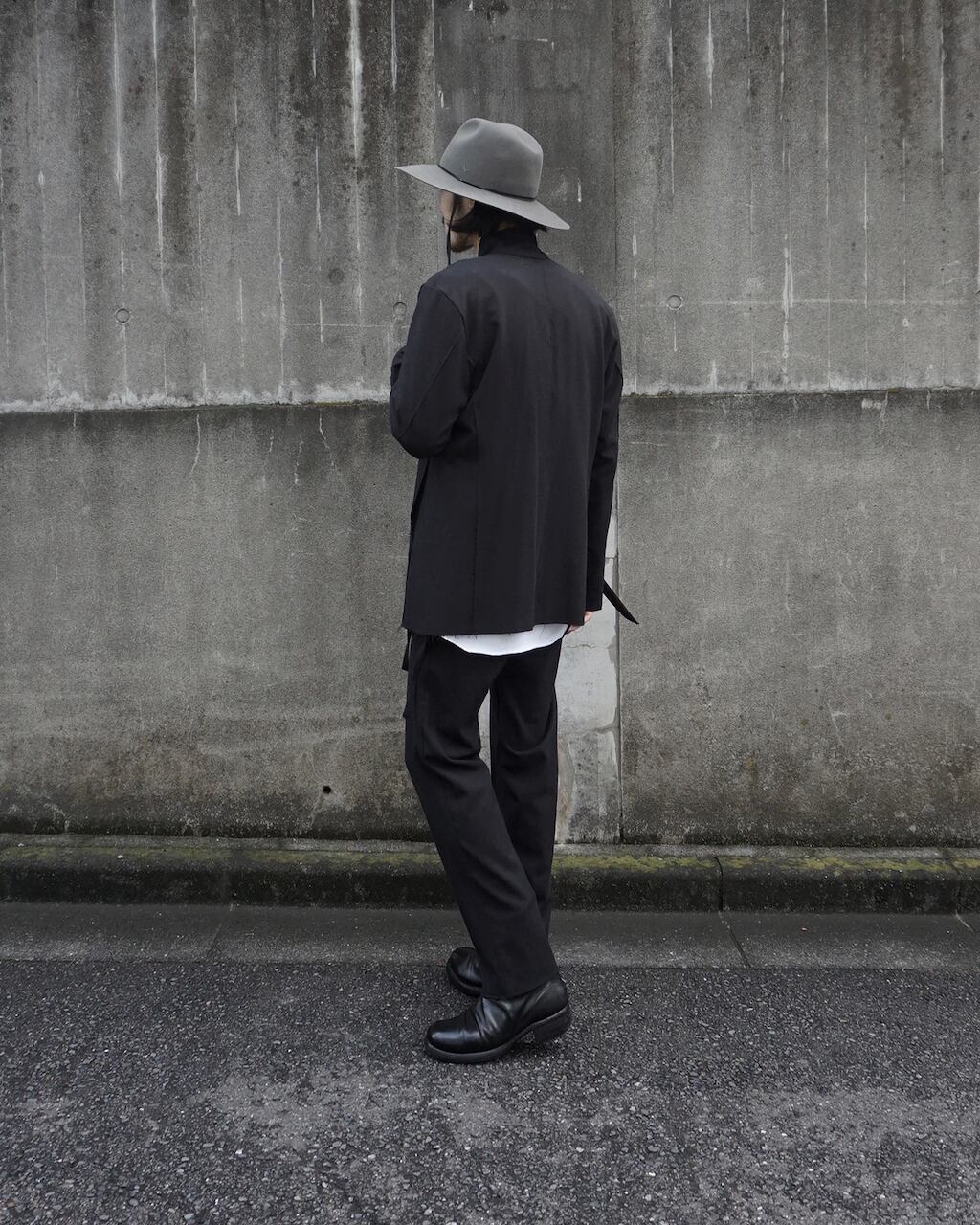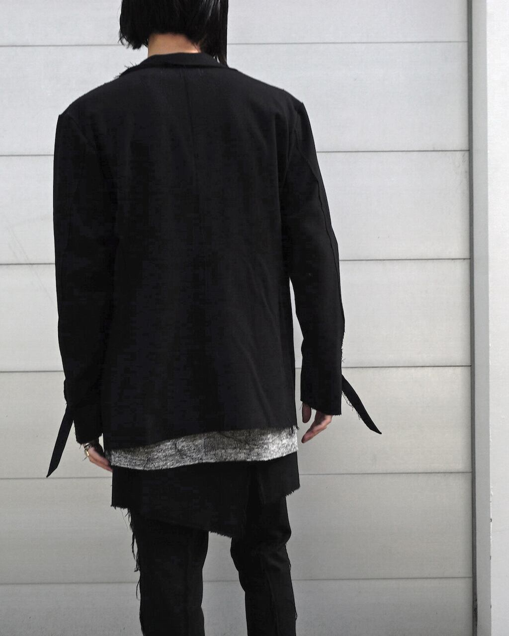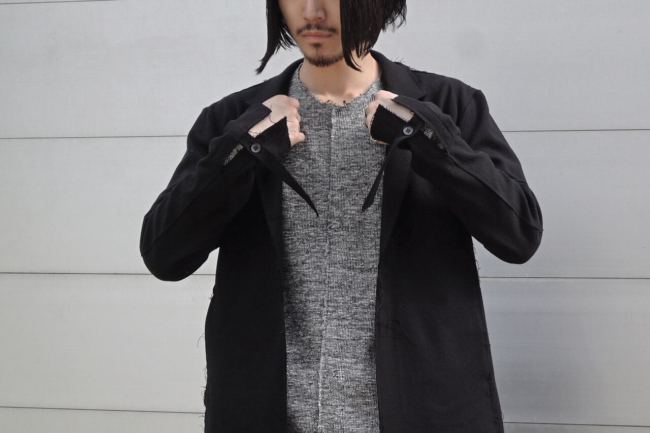 襟を立てスタンドカラーとしてアレンジ可能(SLAB色のみ襟裏が配色)。袖口にはスリットと垂れるコードで通常のジャケットとの差別化を図る。1つボタンでシンプルなスマートフォルム。裾部分等は裁ち切りにし、縫製後に洗い加工をかけることで退廃的なグランジ感を加えた。腰にスリットポケットあり。