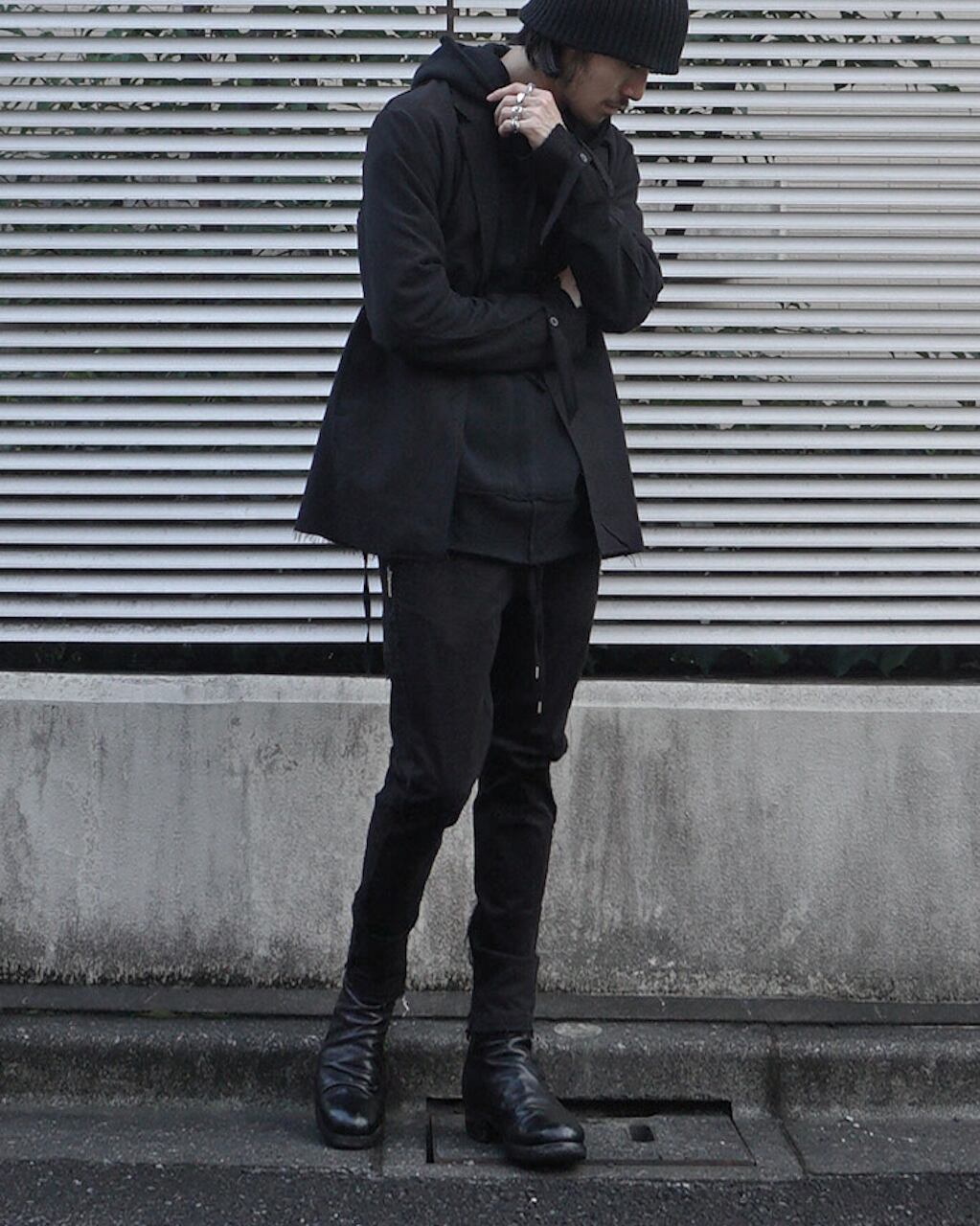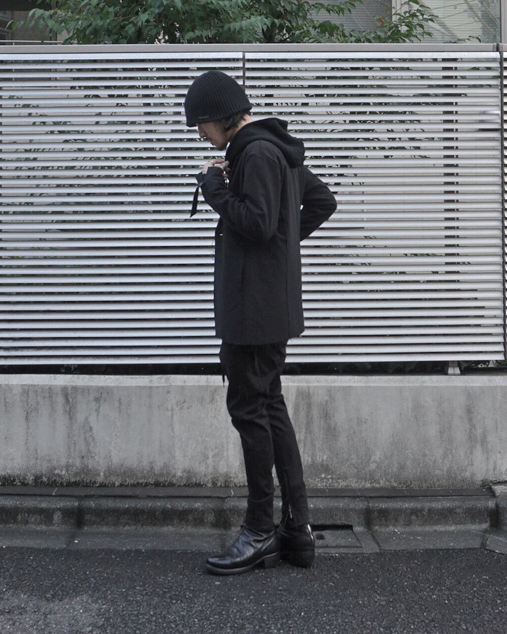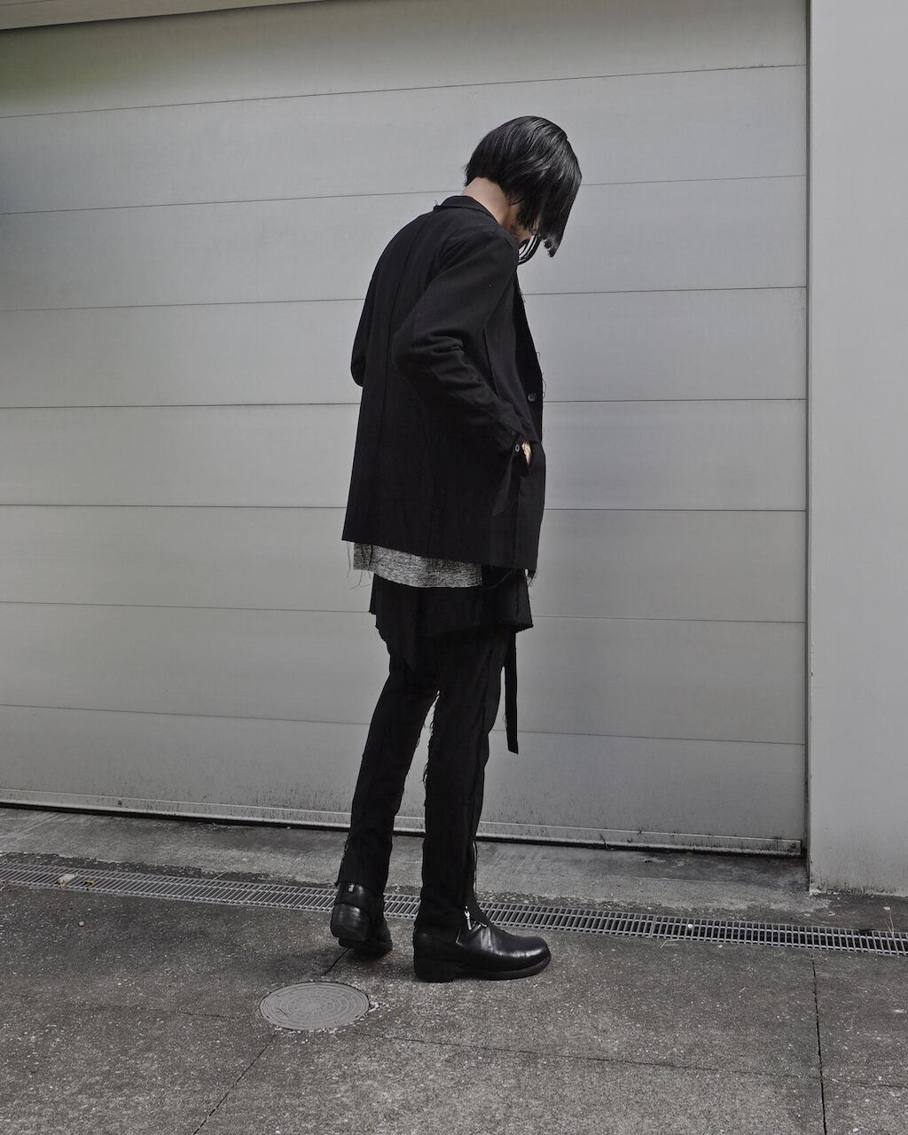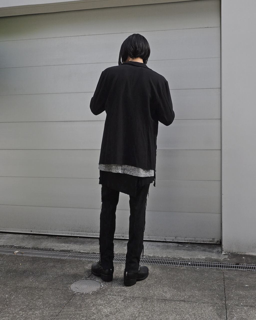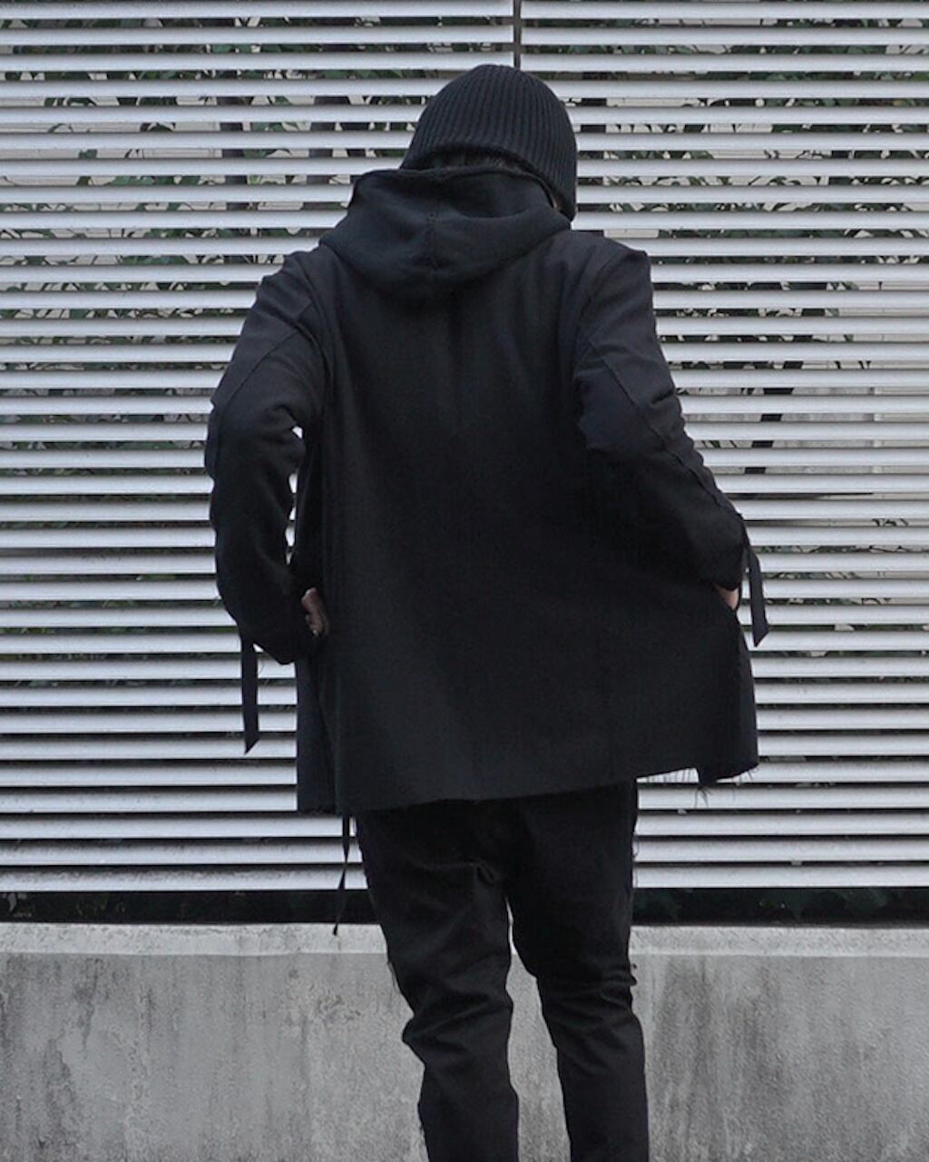 襟を立てスタンドカラーとしてアレンジ可能(SLAB色のみ襟裏が配色)。袖口にはスリットと垂れるコードで通常のジャケットとの差別化を図る。1つボタンでシンプルなスマートフォルム。裾部分等は裁ち切りにし、縫製後に洗い加工をかけることで退廃的なグランジ感を加えた。腰にスリットポケットあり。