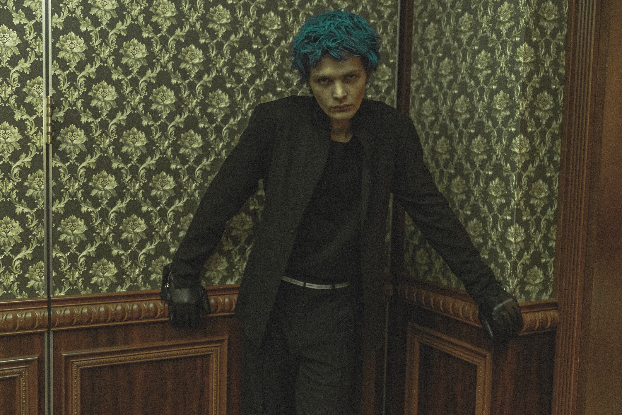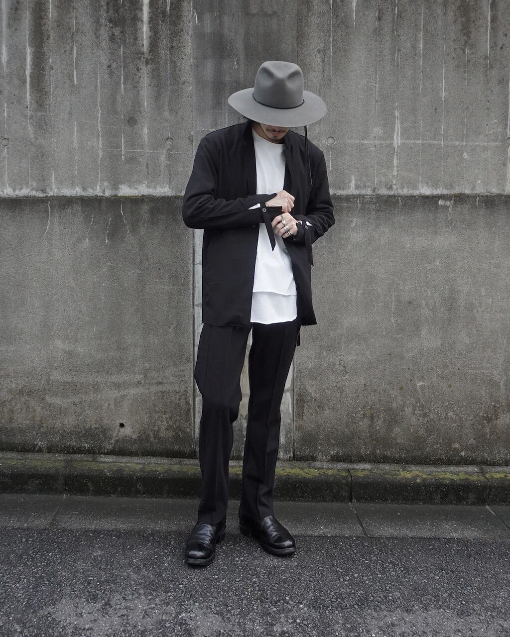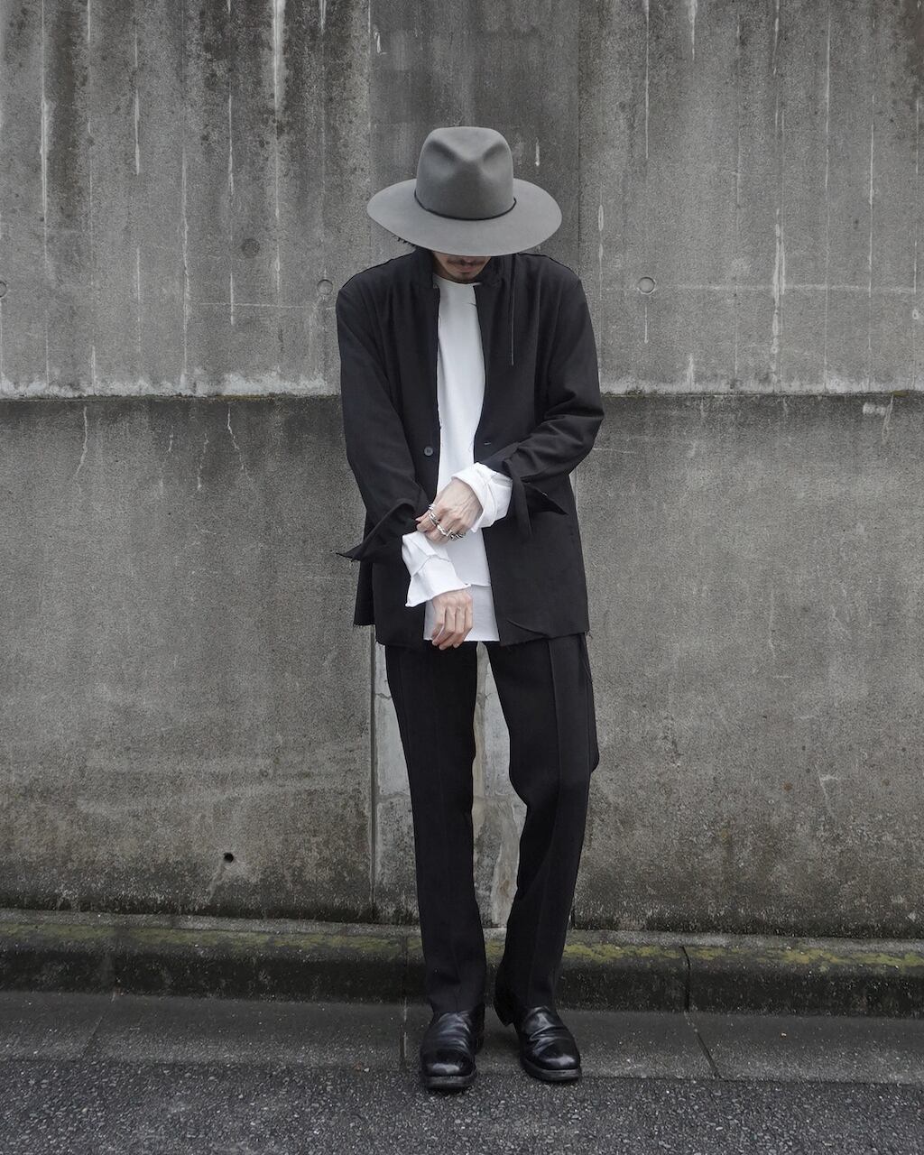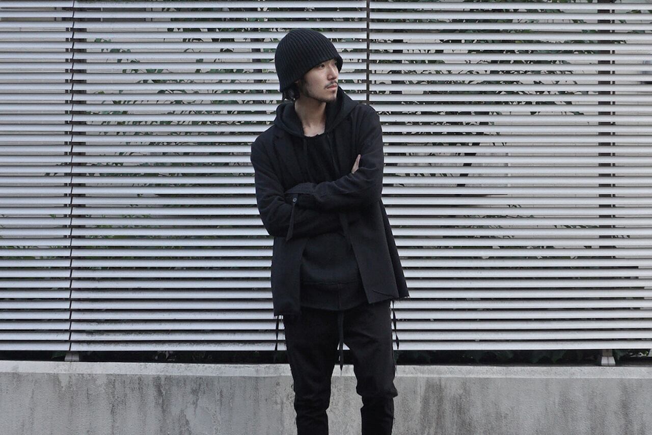 襟を立てスタンドカラーとしてアレンジ可能(SLAB色のみ襟裏が配色)。袖口にはスリットと垂れるコードで通常のジャケットとの差別化を図る。1つボタンでシンプルなスマートフォルム。裾部分等は裁ち切りにし、縫製後に洗い加工をかけることで退廃的なグランジ感を加えた。腰にスリットポケットあり。